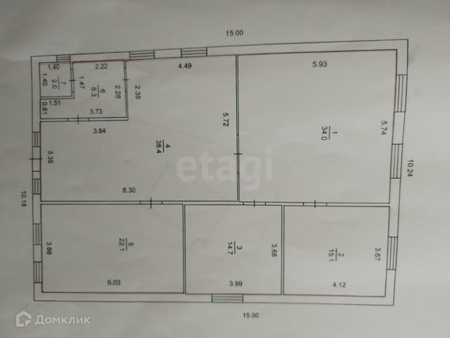 В доме две изолированные комнаты 14,7 м2 и 15.1 м2, большая кухня-гостиная 22.1 м2, холл с залом 38,4 м2 и зал 34 м2.