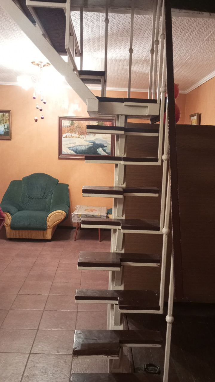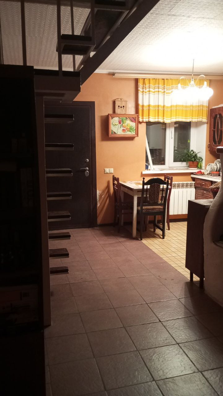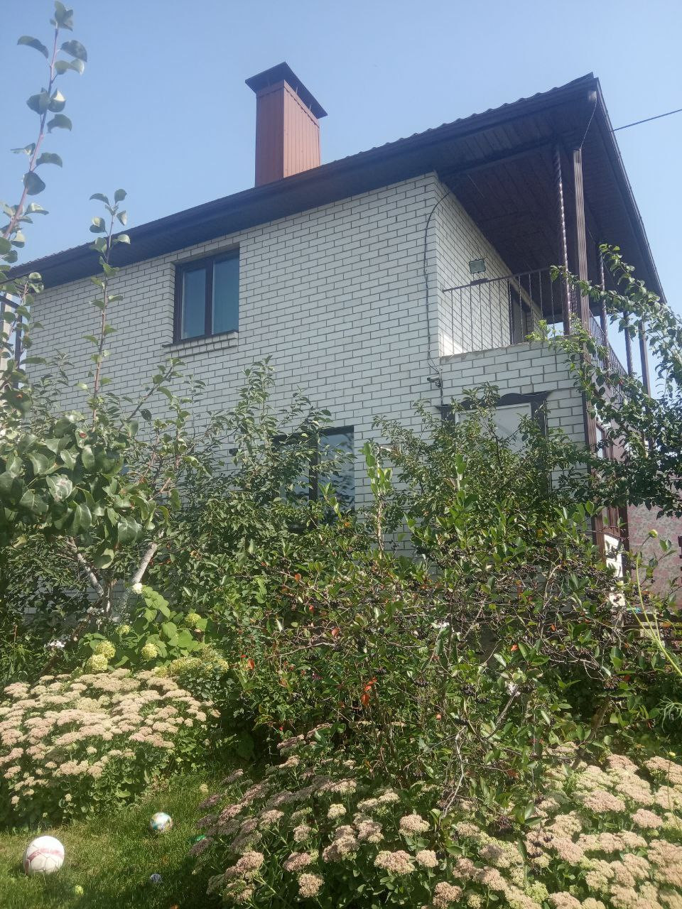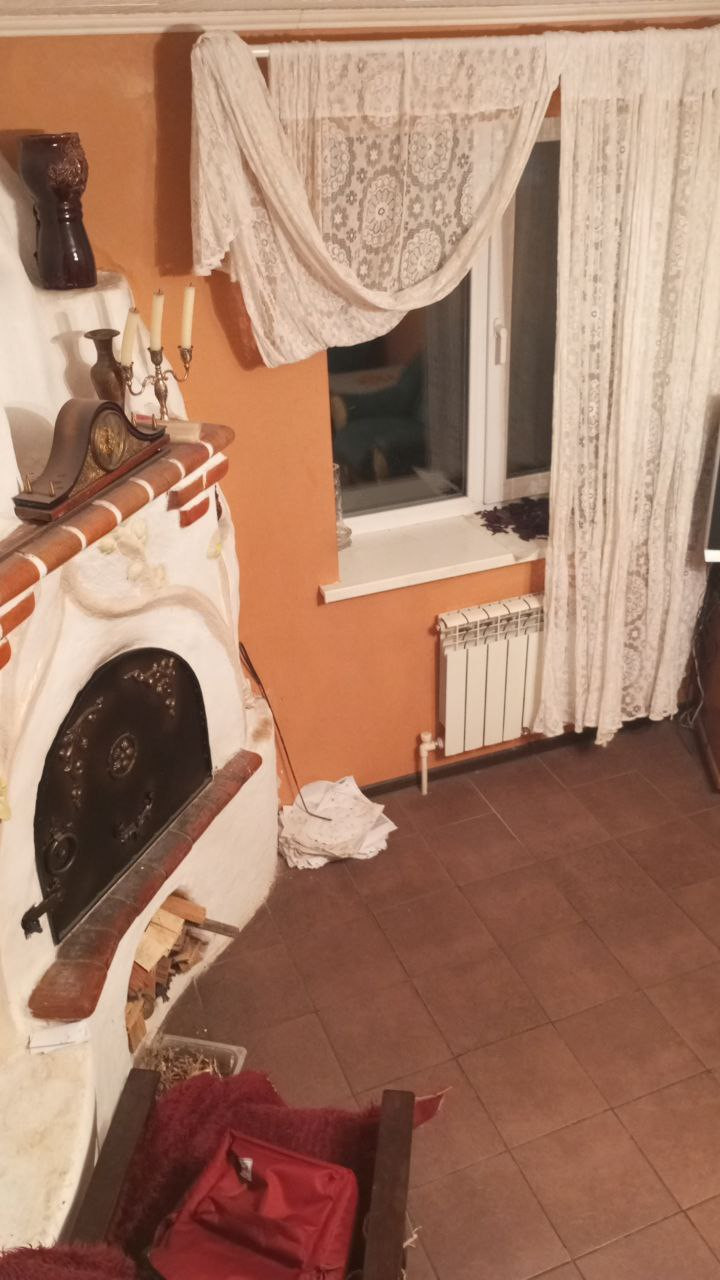 Дом: Кирпичная кладка. Установлены пластиковые окна. Первый этаж состоит из кухни гостиной с камином-печью кладки красного кирпича, ванной комнаты и застеклённой веранды. Напольное покрытие - плитка. Второй этаж - открытое спальное пространство с выходом на балкон и видом на сад. Пол - доски.