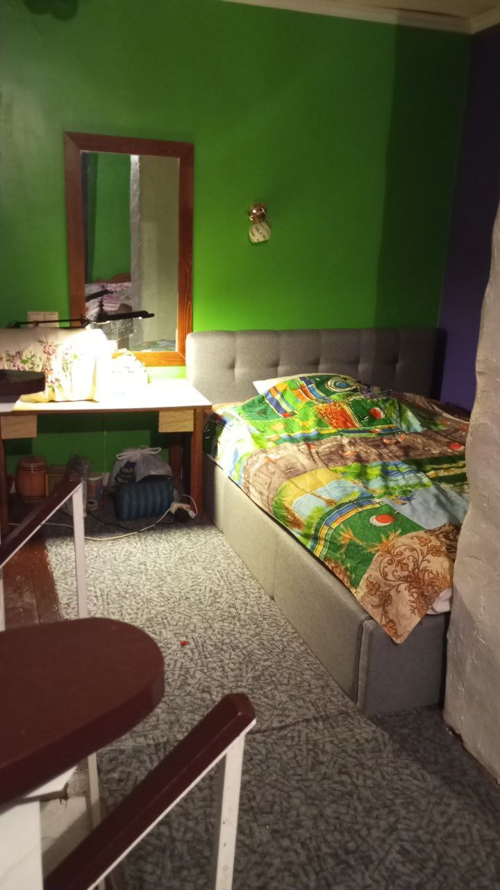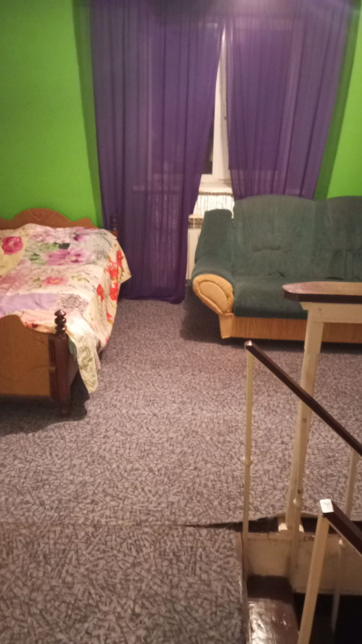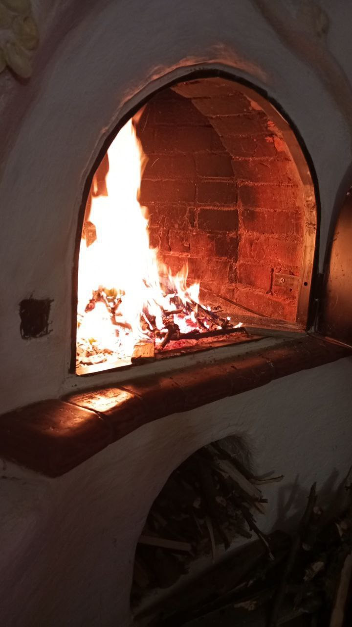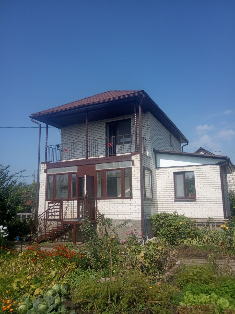Дом: Кирпичная кладка. Установлены пластиковые окна. Первый этаж состоит из кухни гостиной с камином-печью кладки красного кирпича, ванной комнаты и застеклённой веранды. Напольное покрытие - плитка. Второй этаж - открытое спальное пространство с выходом на балкон и видом на сад. Пол - доски.