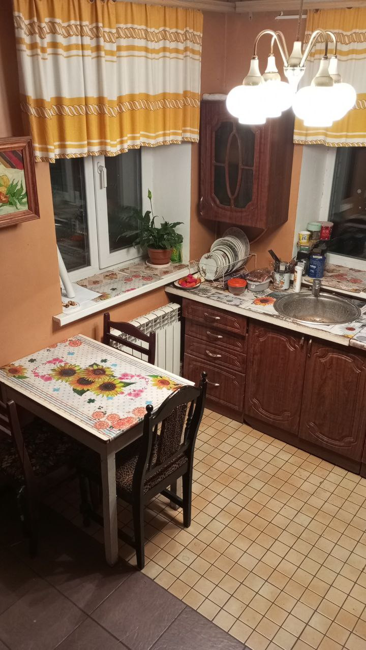Вся техника (холодильник, стиральная машина, телевизор, газовая плита) и мебель (кресла, диван, кровати) остаются.