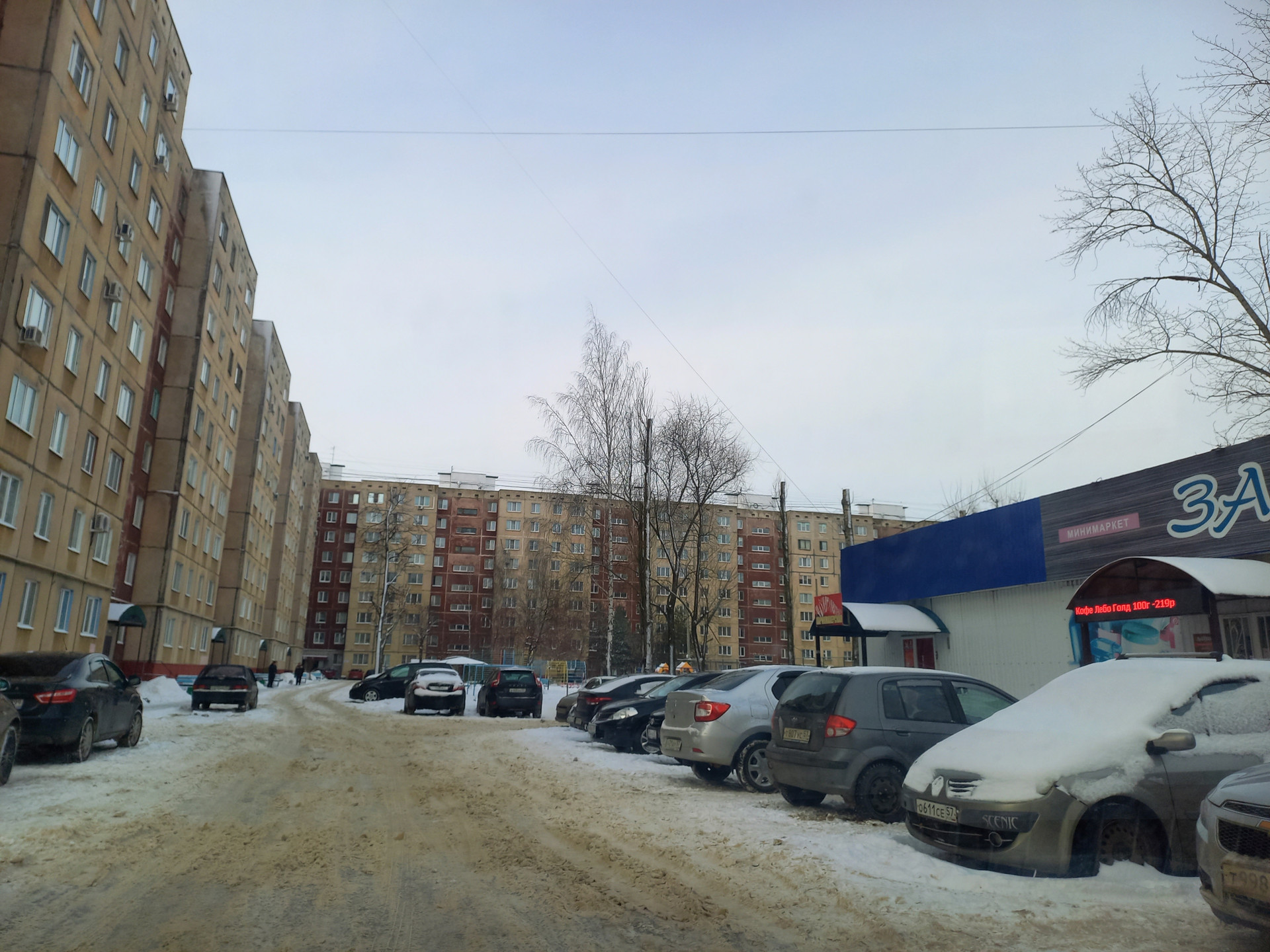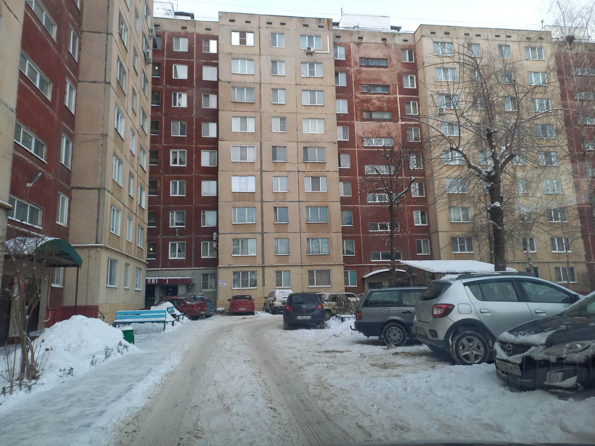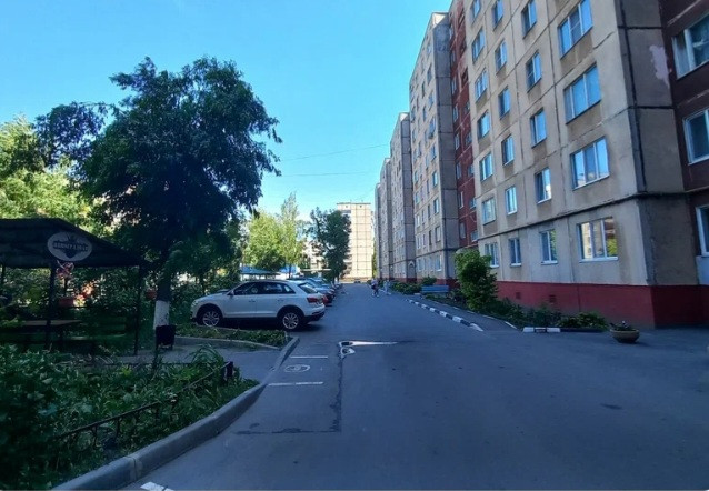 Двор с большим количеством парковочных мест и обустроенной детской площадкой.