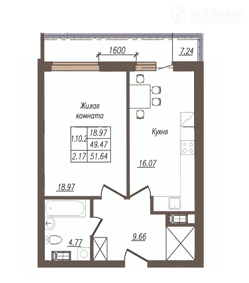 Отличная однокомнатная квартира, где все продумано для комфортной жизни. Сразу обращает на себя внимание огромный балкон и очень просторная прихожая с нишей для шкафа-купе. Комната и кухня-столовая впечатляют своими габаритами и удобством. Общая площадь – 51,64 м2.