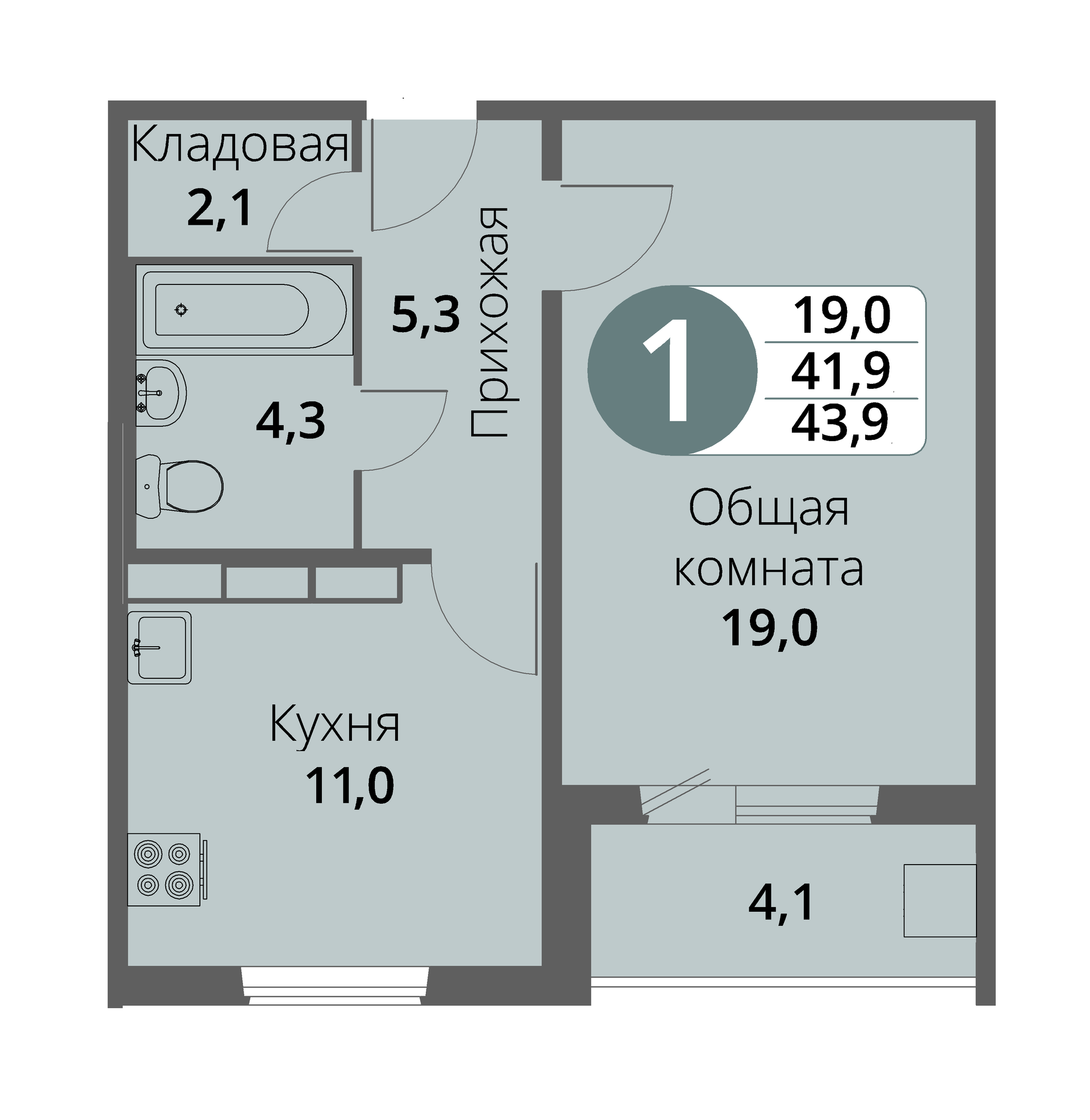Общая площадь 41.7 м2