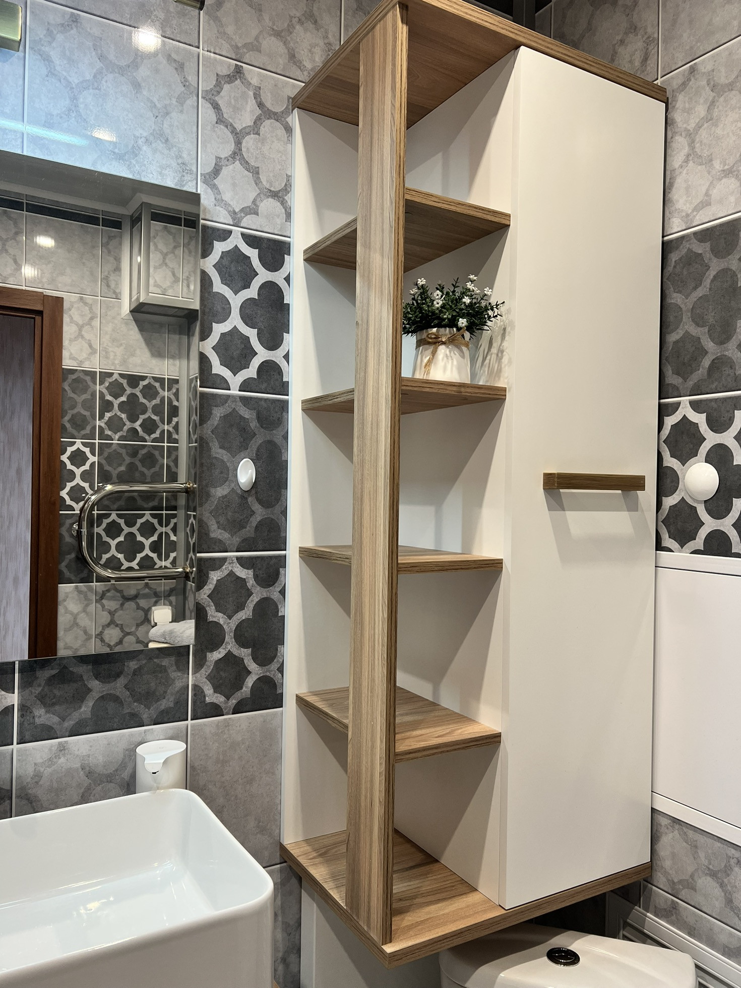 Санузел: совмещен, отделан плиткой, гарнитур с сенсорным смесителем