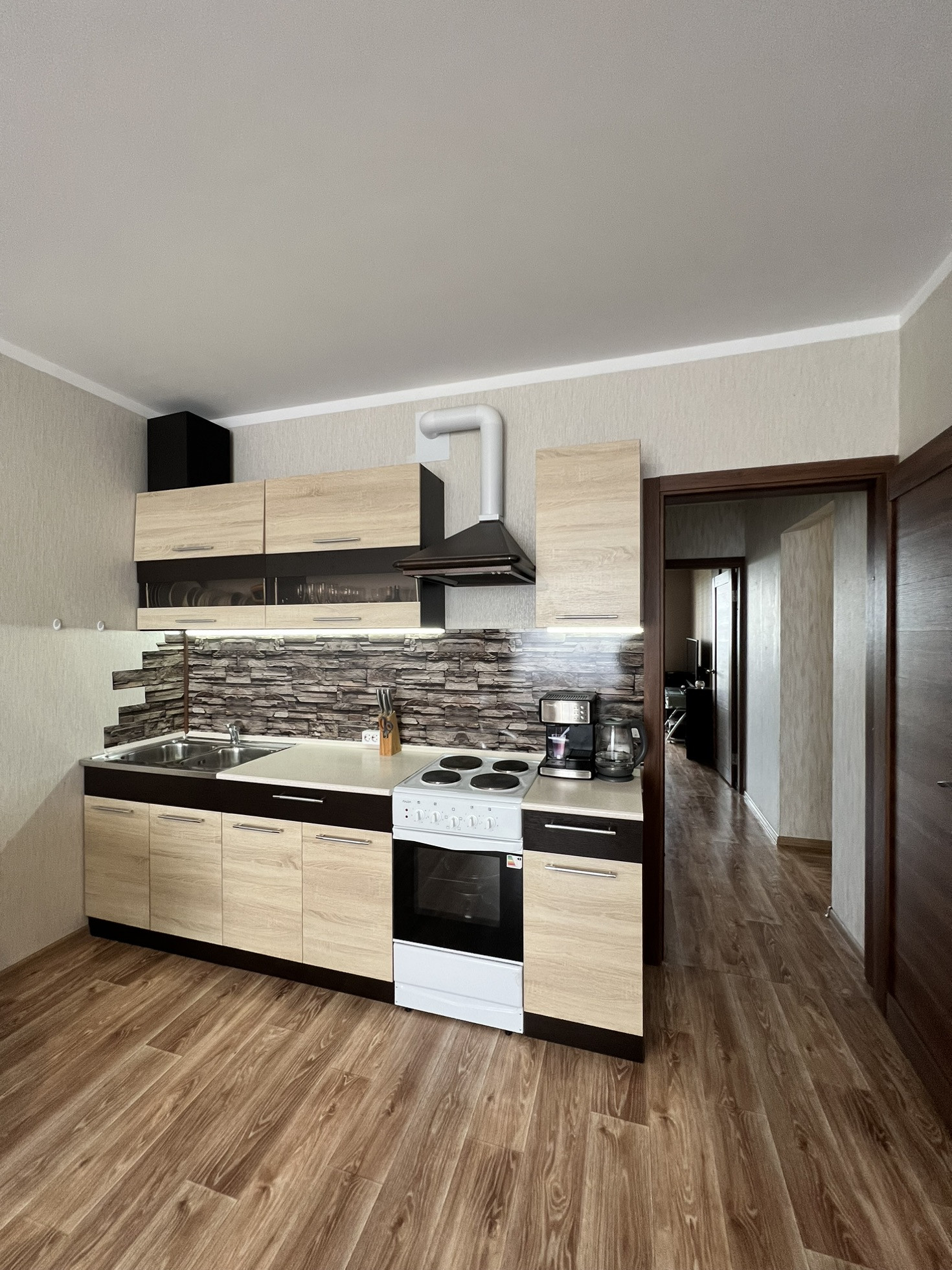 Кухня-гостиная: кухонный гарнитур, диодная подсветка рабочей зоны. Так же на рабочей зоне и в гостиной сделаны дополнительные розетки для удобства и вытяжка