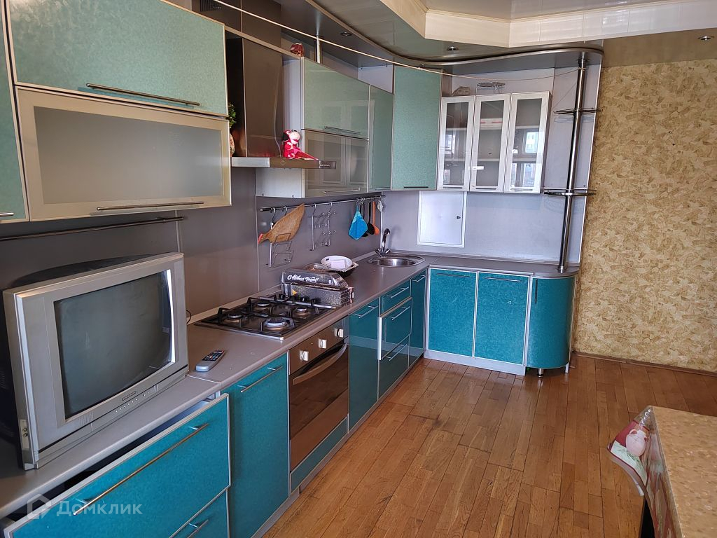 Установлена качественная дверь-сейф, на полу линолеум, встроенная кухня с современной встроенной бытовой техникой.Частично остаётся мебель.
