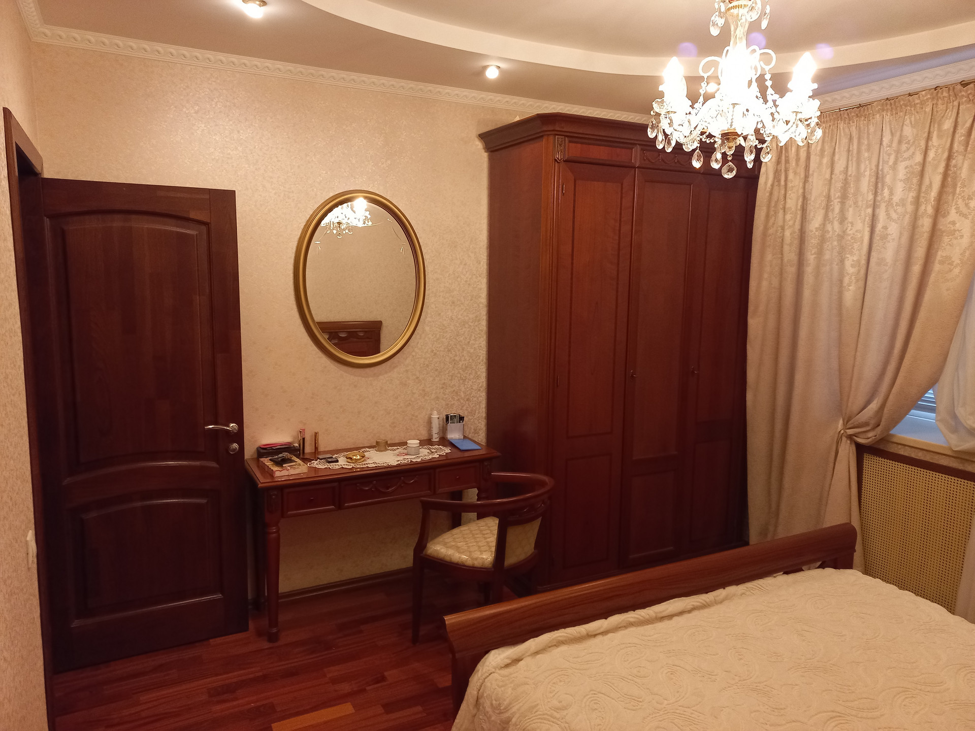В жилых комнатах - Пол паркетная доска Мербау, двери межкомнатные дуб-масив, все окна ПВХ с москитными сетками, отопление - трубы полипропилен (убраны в стены), радиаторы чугунные, стены - оклеены флизелиновыми обоями.