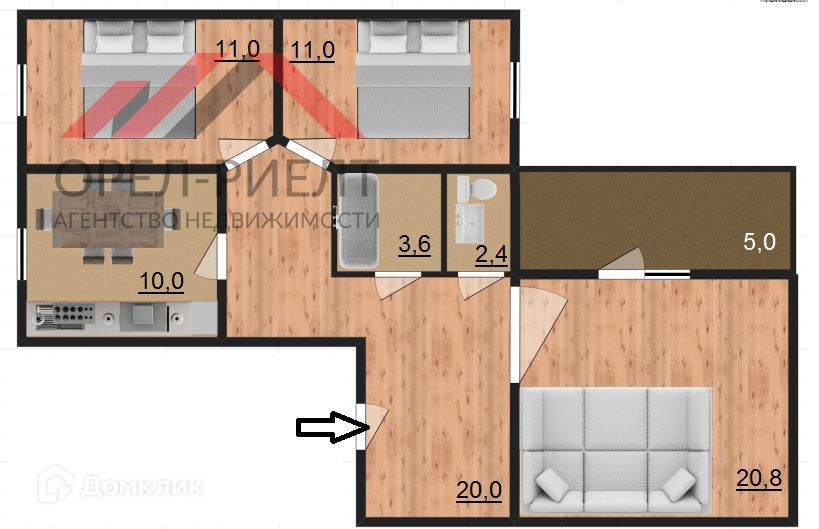 Жилая площадь 42.8 м2