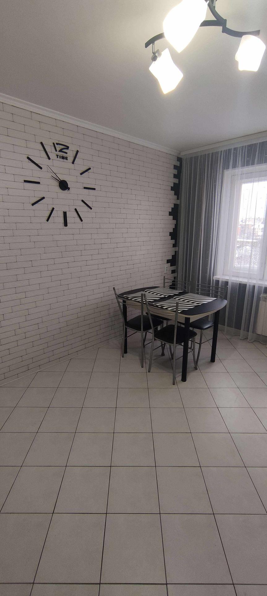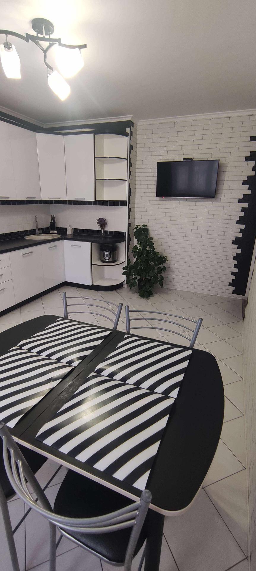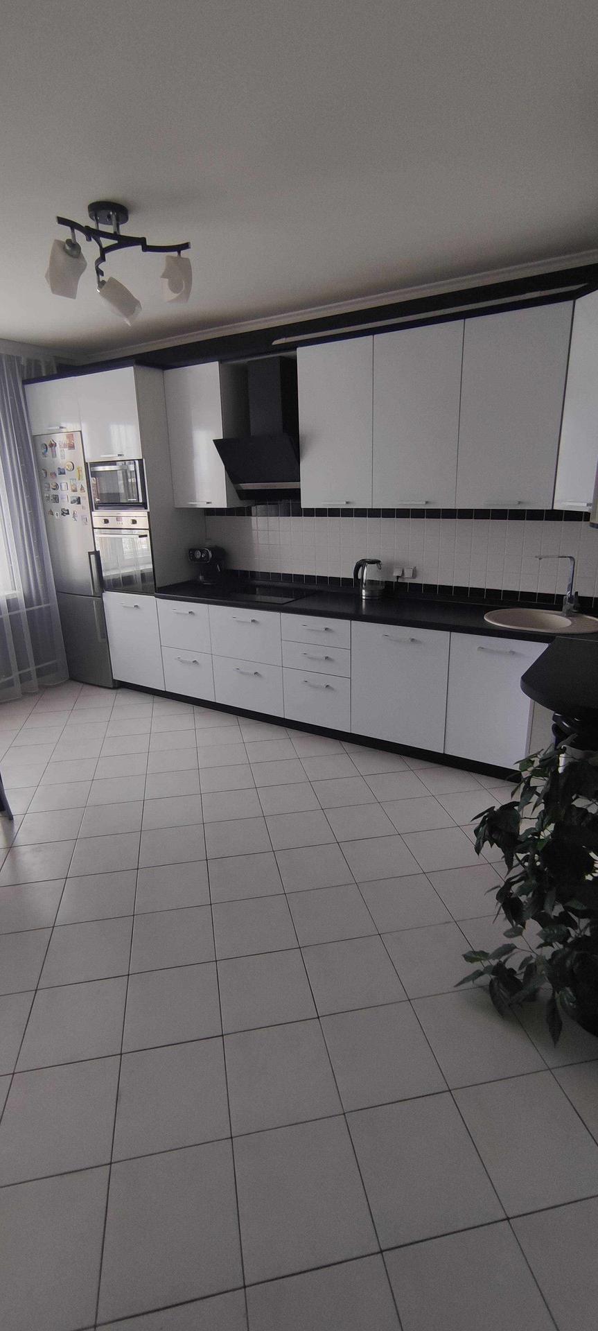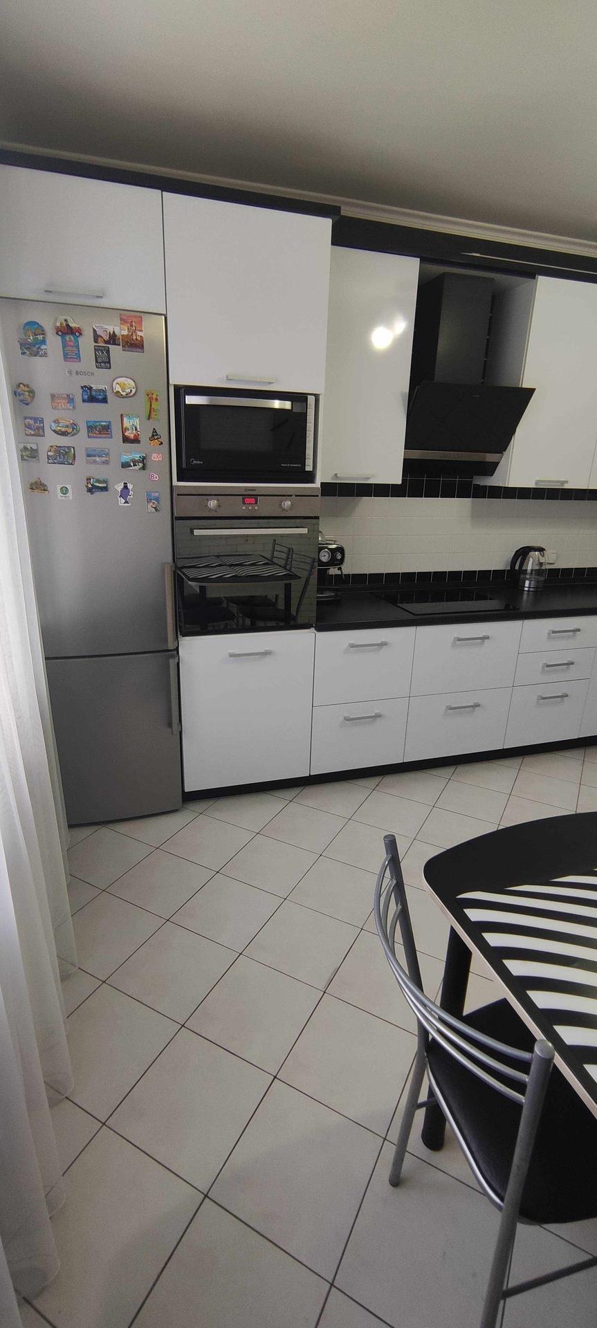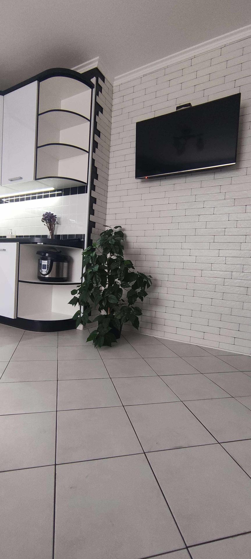 --Очень большая кухня 16,3 км.м - пол выложен керамической плиткой , стены облицованый плиткой под кирпич , с фактурной штукатуркой , рабочая зона так же выложена керамической плиткой . Остается при покупке вся мебель кухни, стол , стулья , бытовая техника - посудомоечная машина , микроволновка , телевизор , вытяжка , интукционная варочная панель , электрический духовой шкаф .