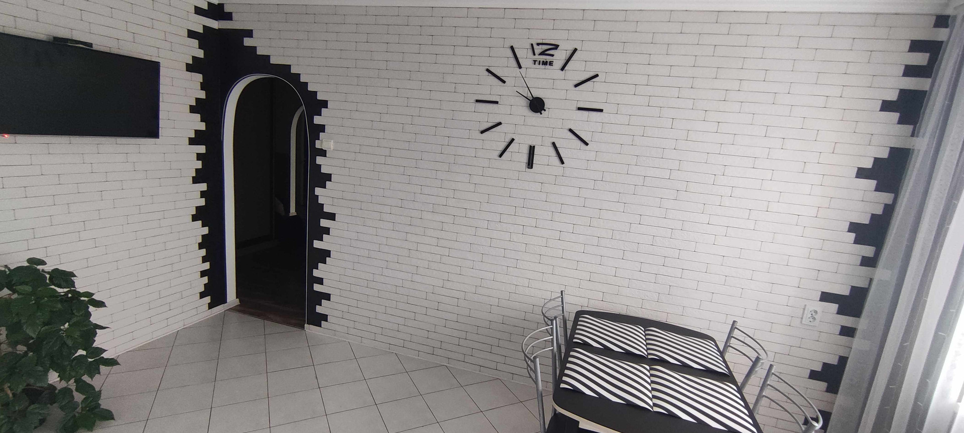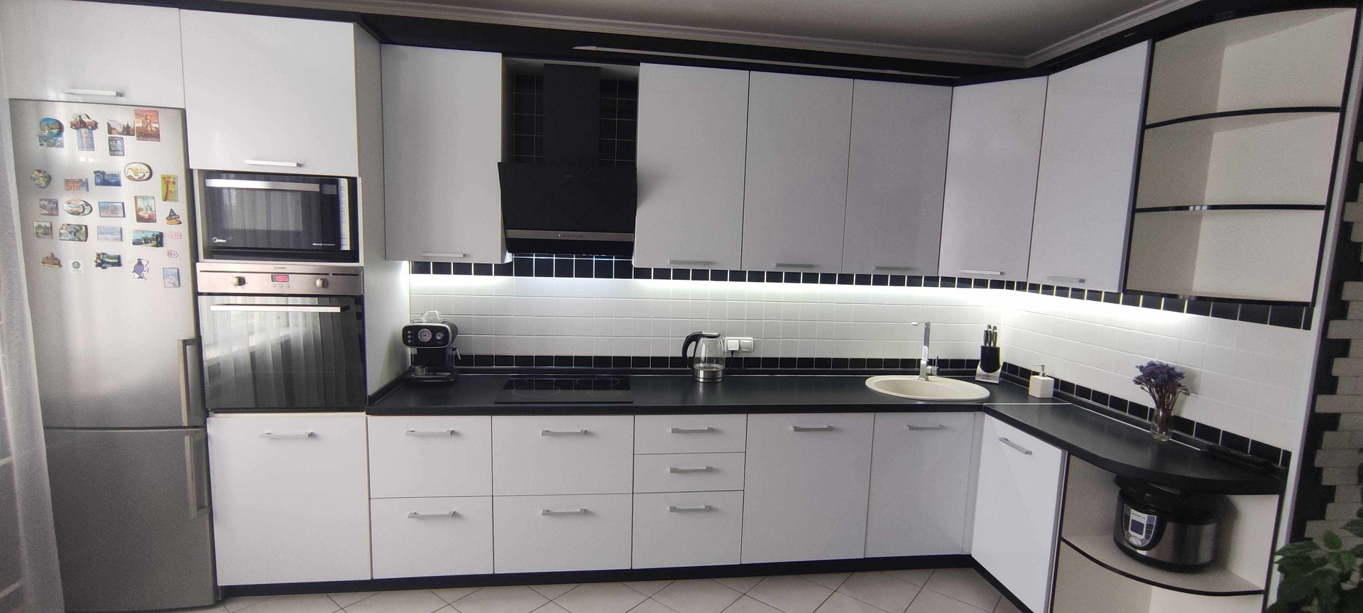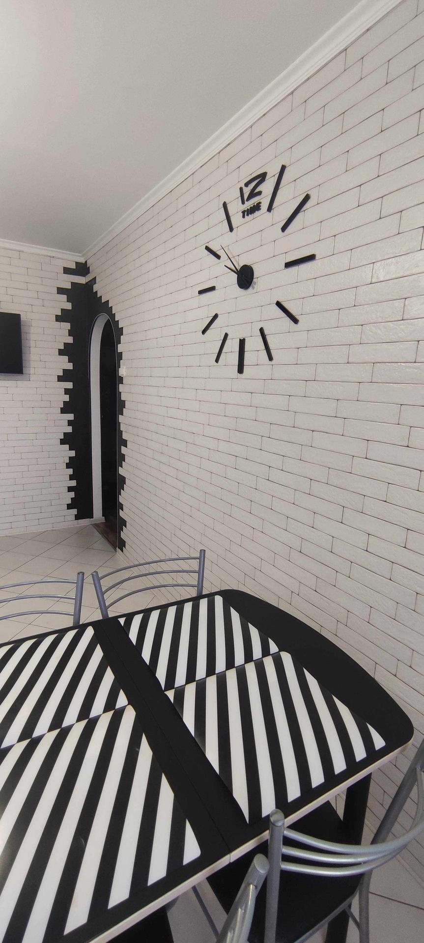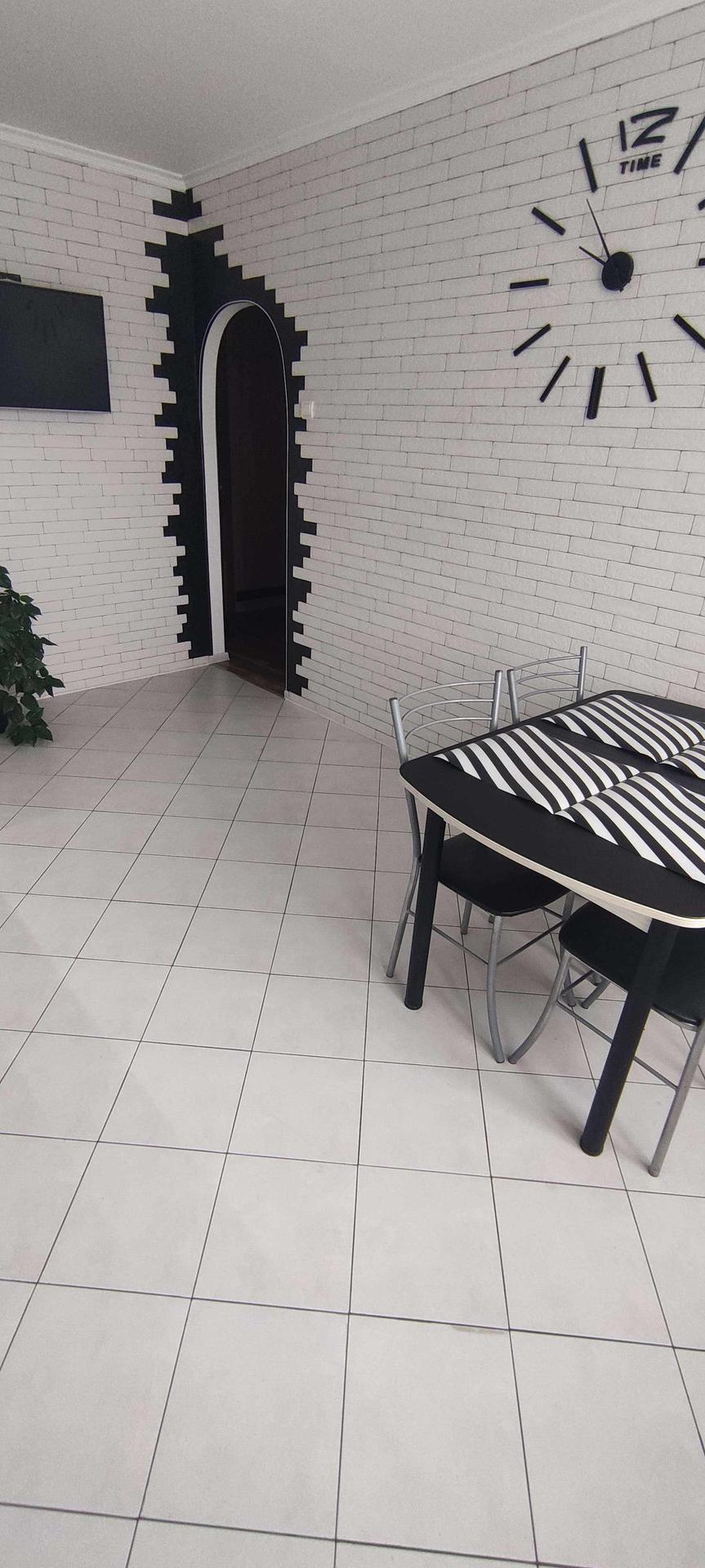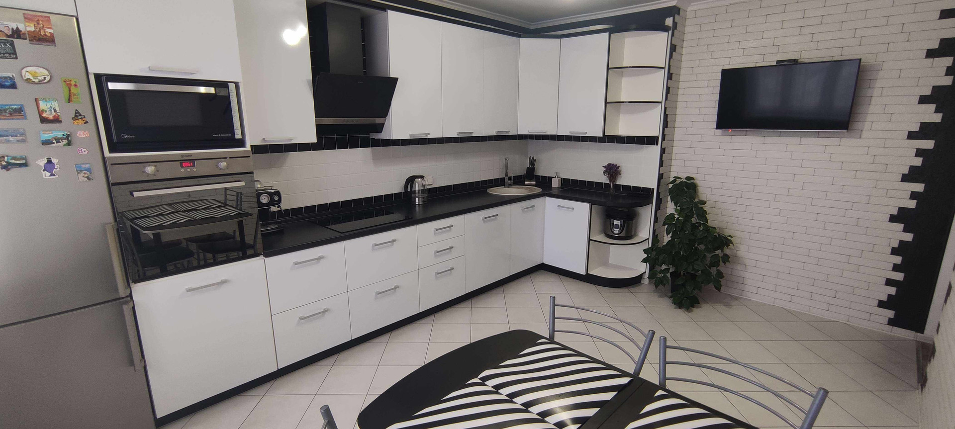 --Очень большая кухня 16,3 км.м - пол выложен керамической плиткой , стены облицованый плиткой под кирпич , с фактурной штукатуркой , рабочая зона так же выложена керамической плиткой . Остается при покупке вся мебель кухни, стол , стулья , бытовая техника - посудомоечная машина , микроволновка , телевизор , вытяжка , интукционная варочная панель , электрический духовой шкаф .