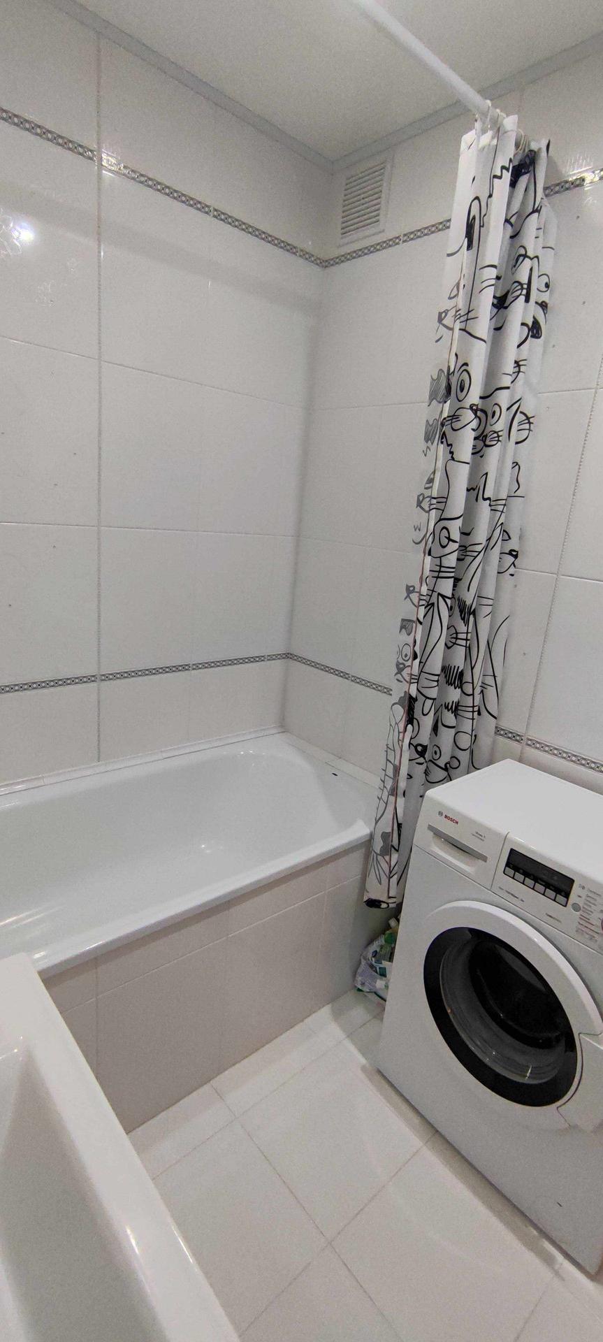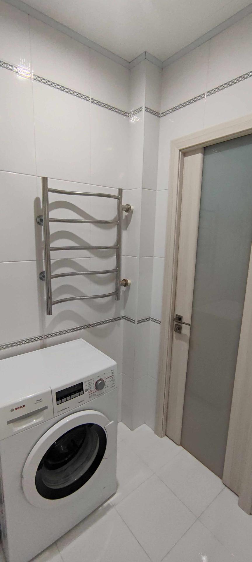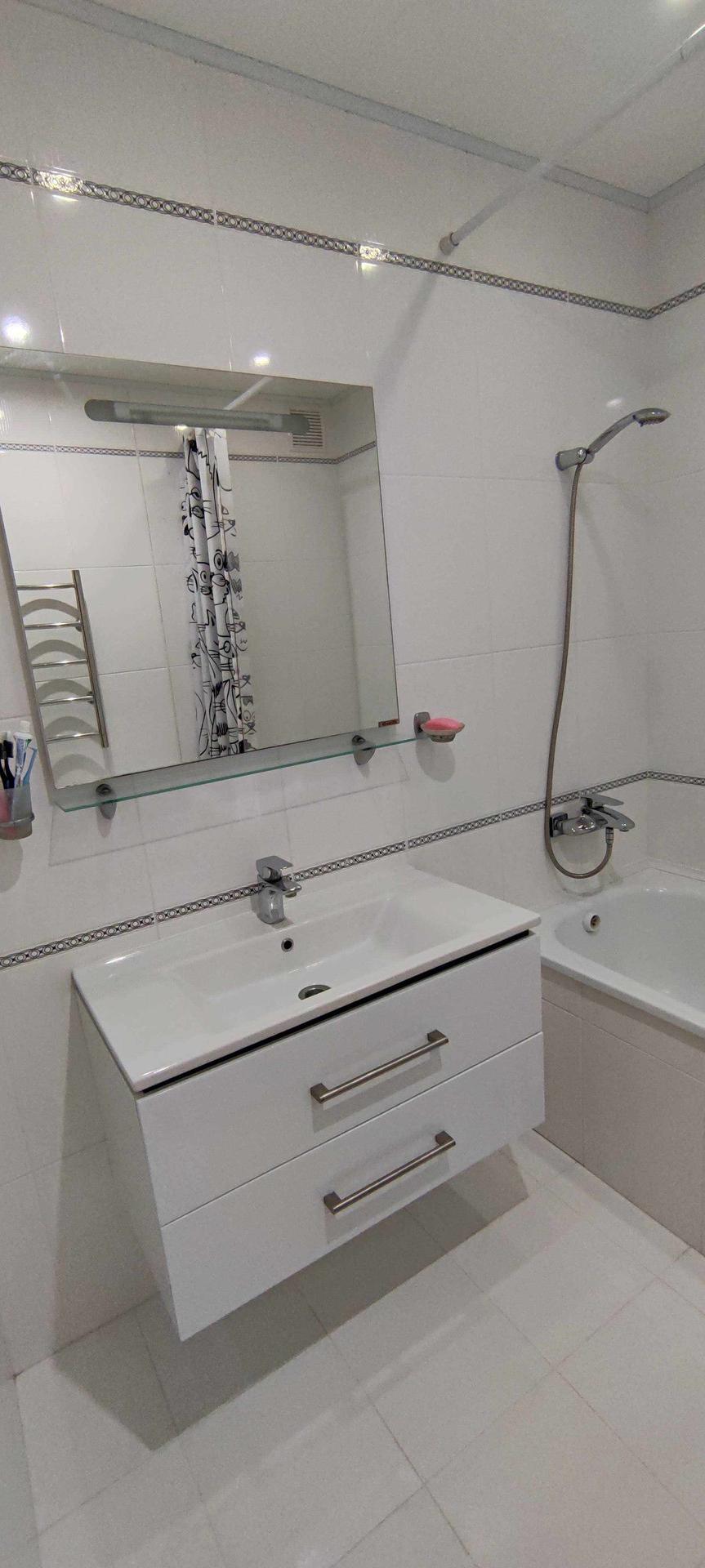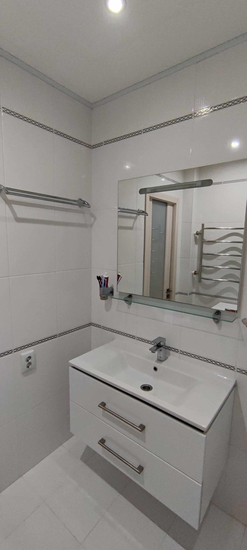 --Ванная комната 3,9 кв.м - стены и пол выложены керамической плиткой , зашита вся коммуникация , установлена качественная сантехника , сушилка , стильная раковина .