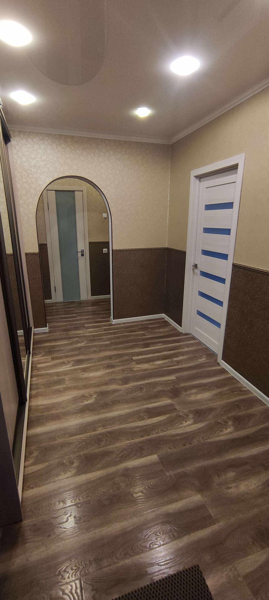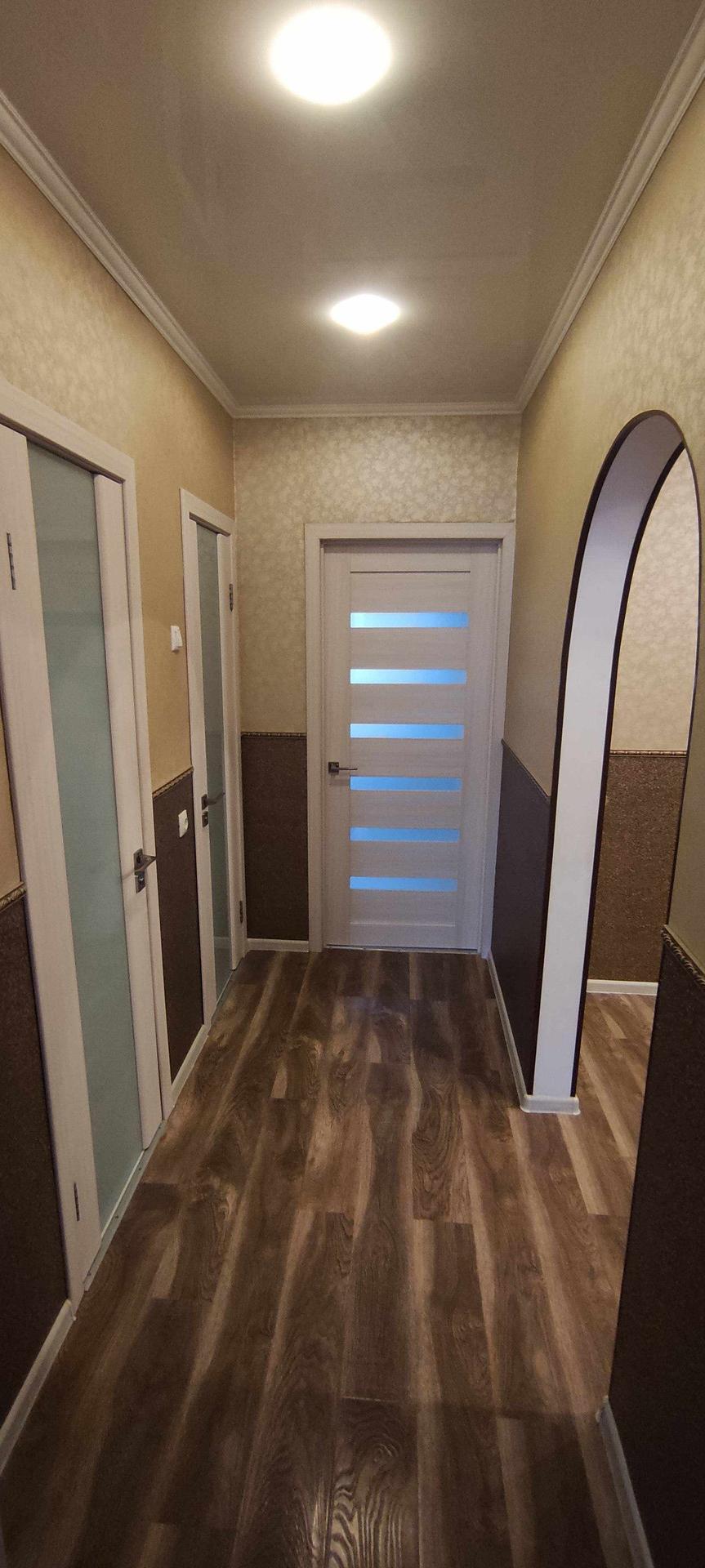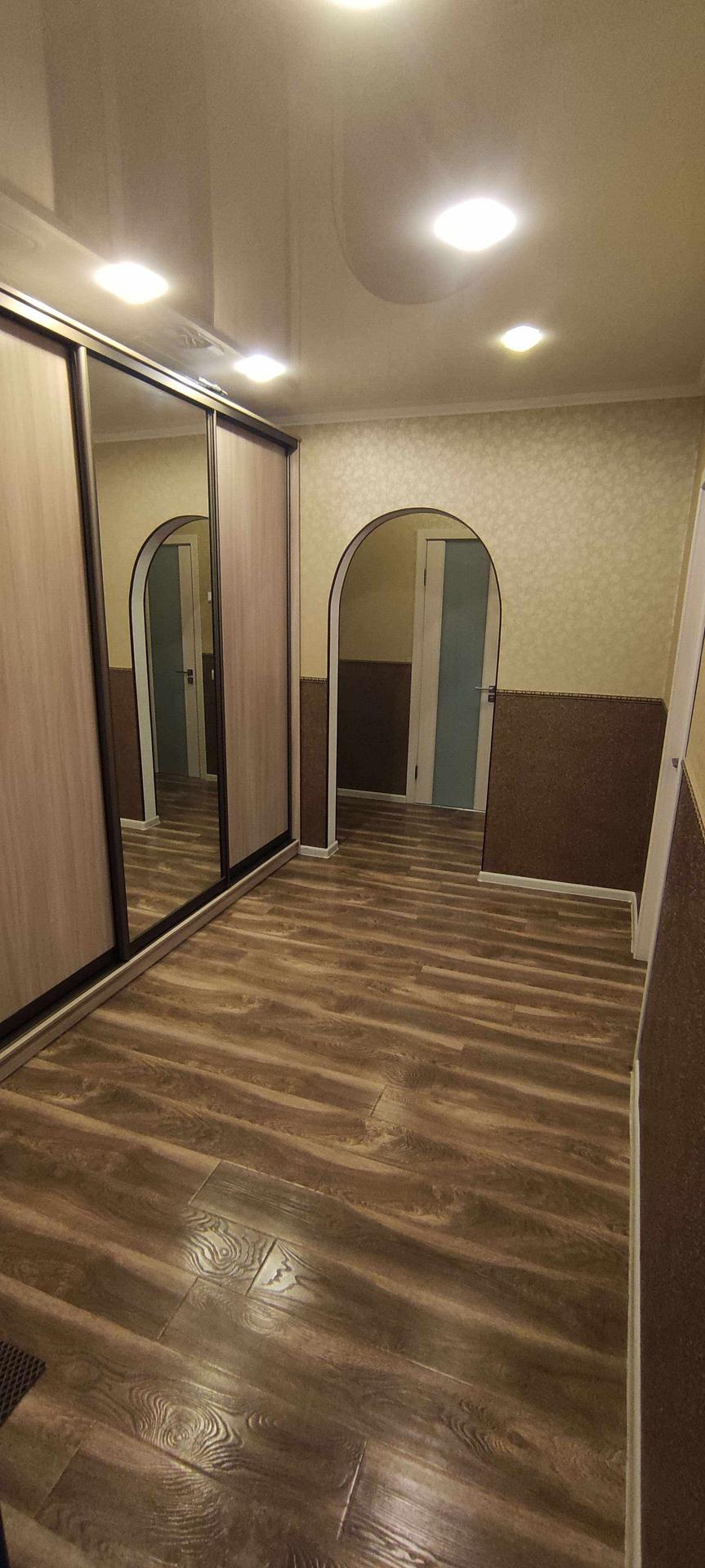 --Коридор раздельный , состоит из двух частей , первая часть 8,6 км.м, вторая 3,5 км.м - выложен ламинат , дорогие обои , натяжной потолок . Остается при покупке - большой шкаф купе с зеркалом во всю стену , для различных вещей и обуви.