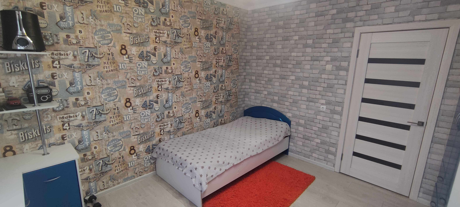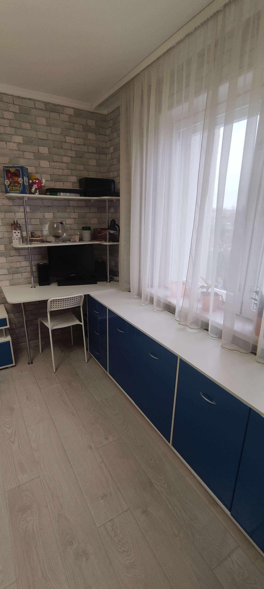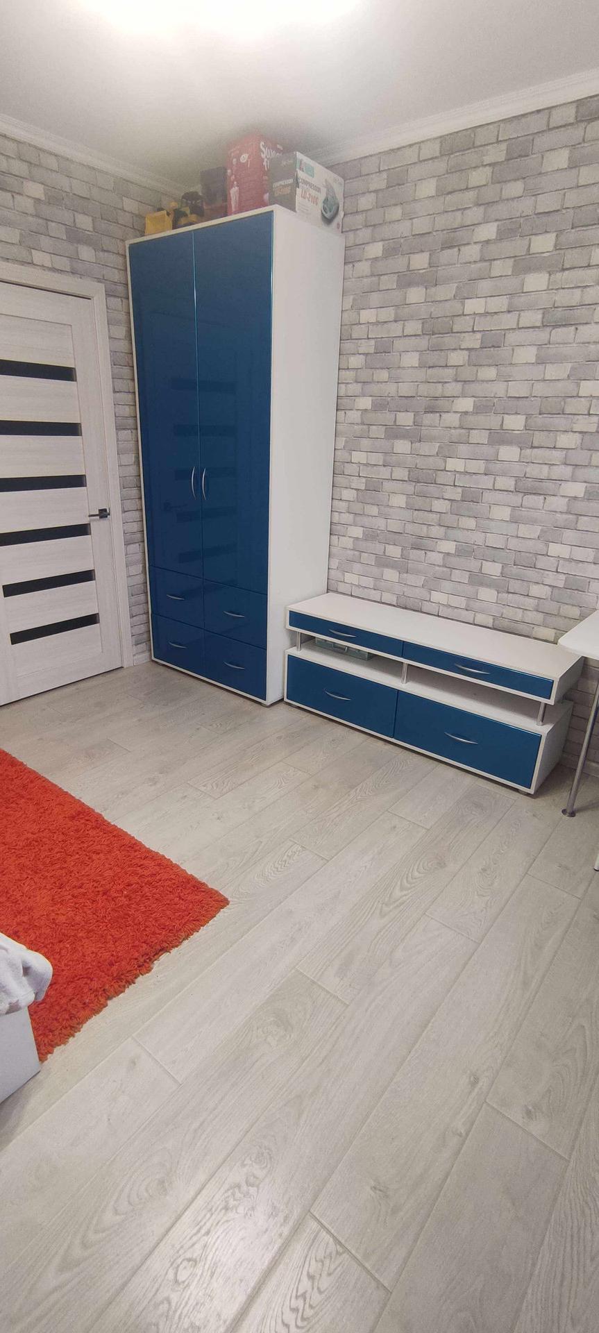 --Детская комната 13,2 км.м - выложен ламинат , обои двух расцветок .Остается при покупке - стильный детский гарнитур , кровать с матрасом , шторы .
