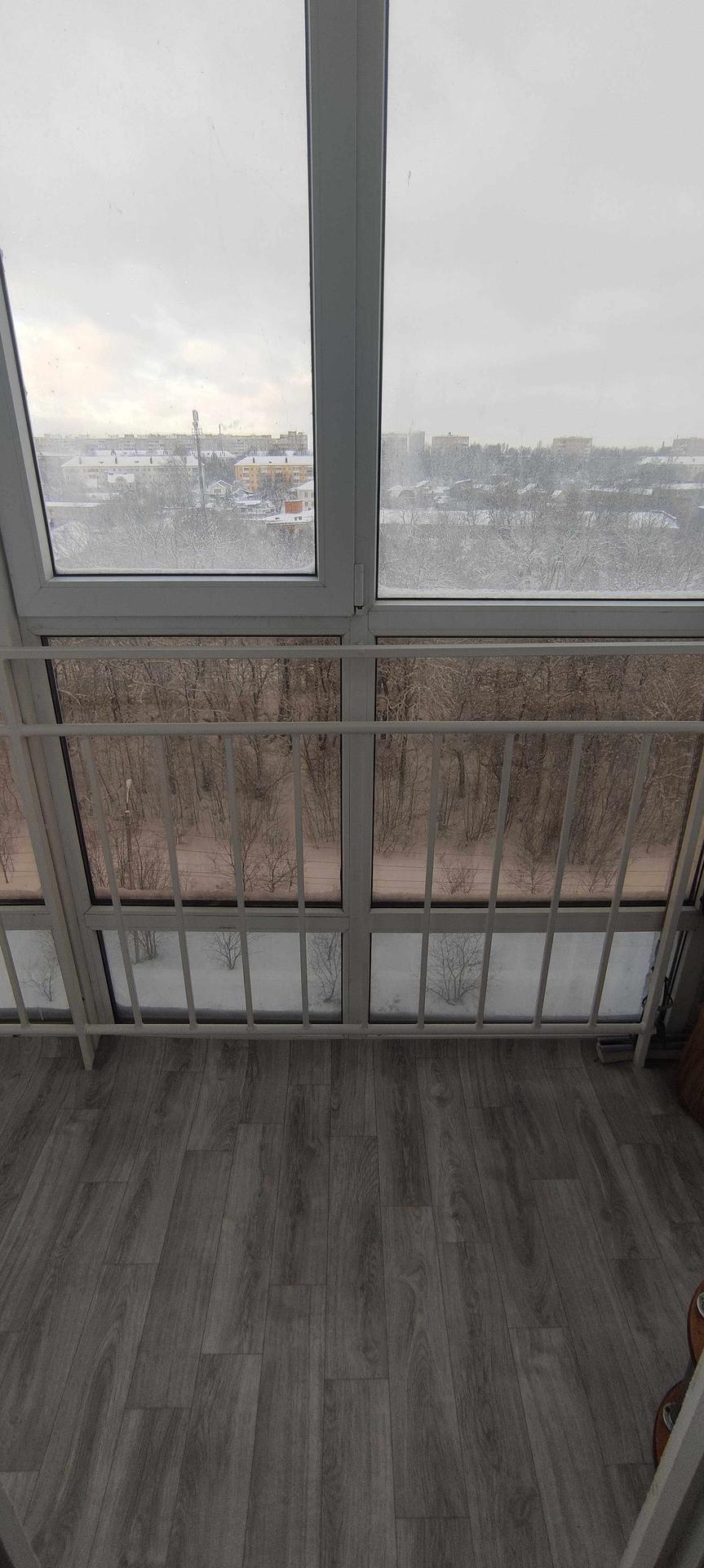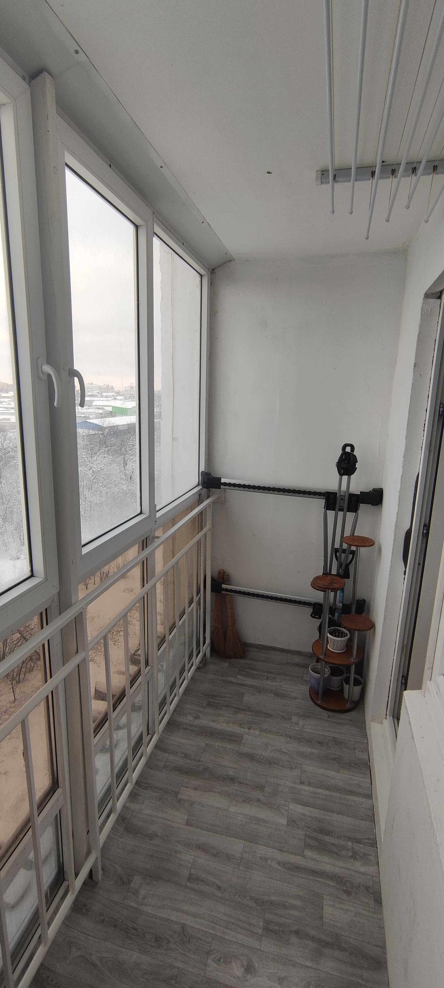 --Балкон 3,5 кв.м - стеклопакеты во всю высоту балкона , установлены полки для хранения вещей , сушилка для белья , на полу уложен линолеум .