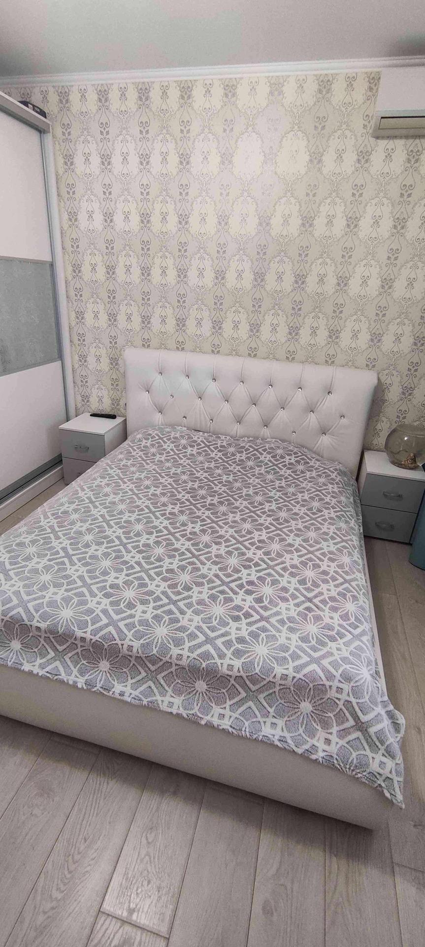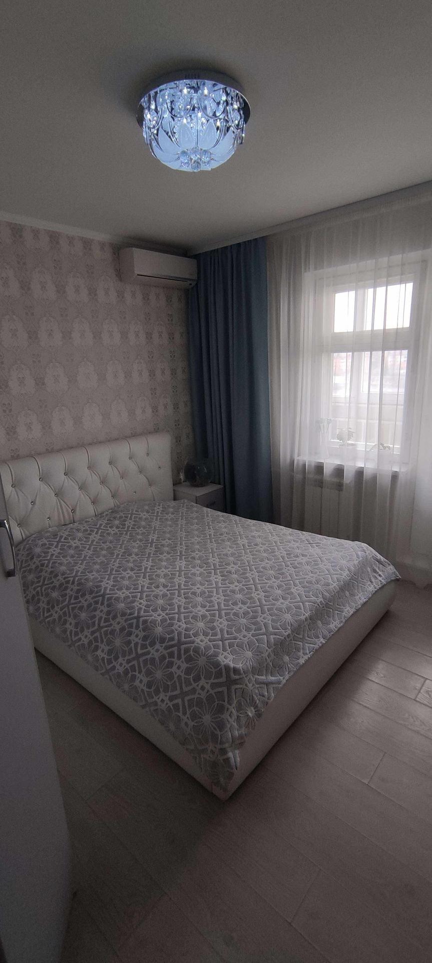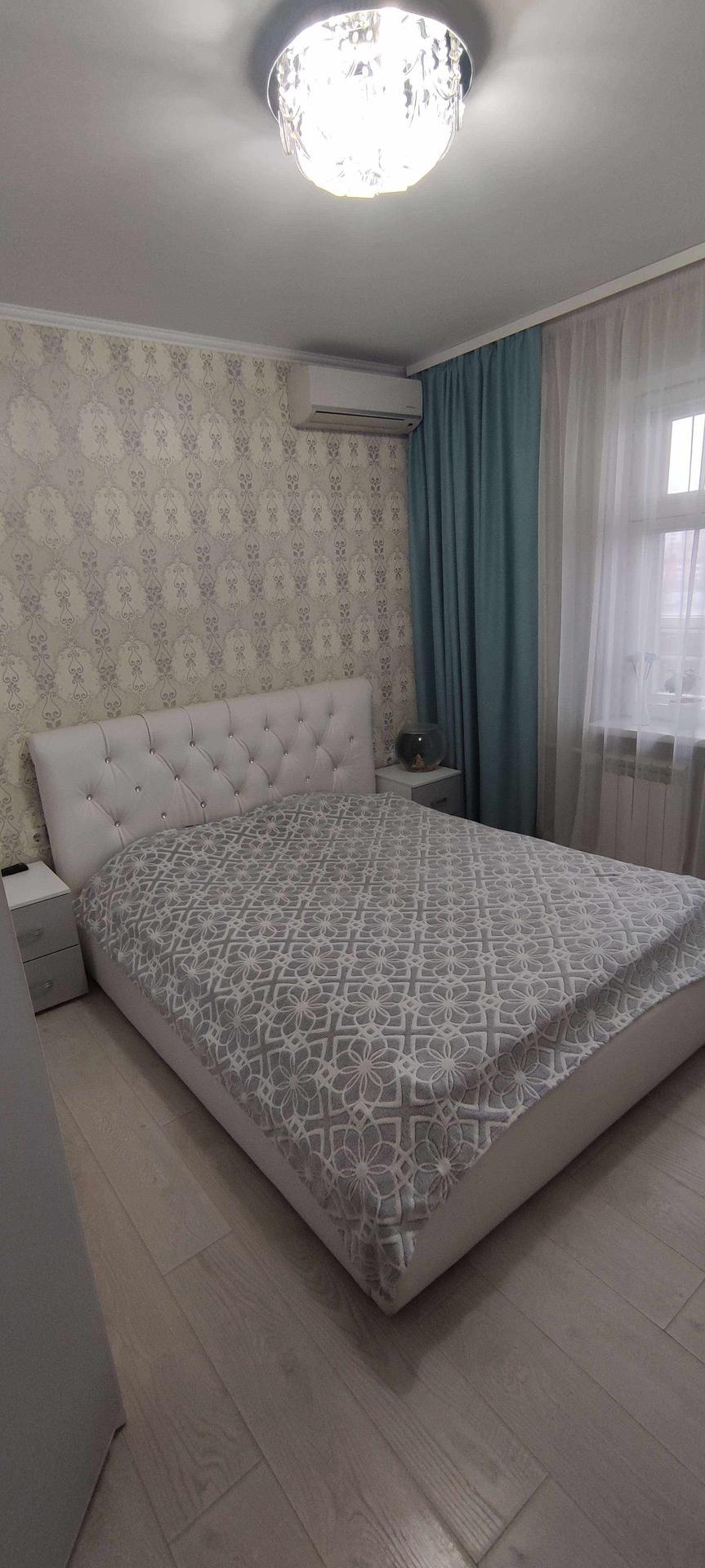 --Спальня 12,1 км.м - выложен ламинат , обои двух расцветок . Остается при покупке - большая двухспальняя кровать с матрасом , две прикроватные тумбы , большой шкаф купе для вещей , телевизор , в комнате установлена сплин-система (кондиционер), шторы .