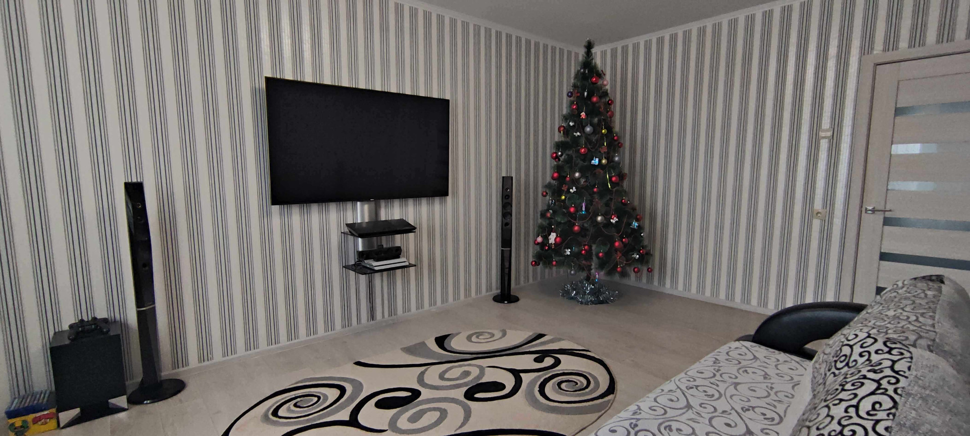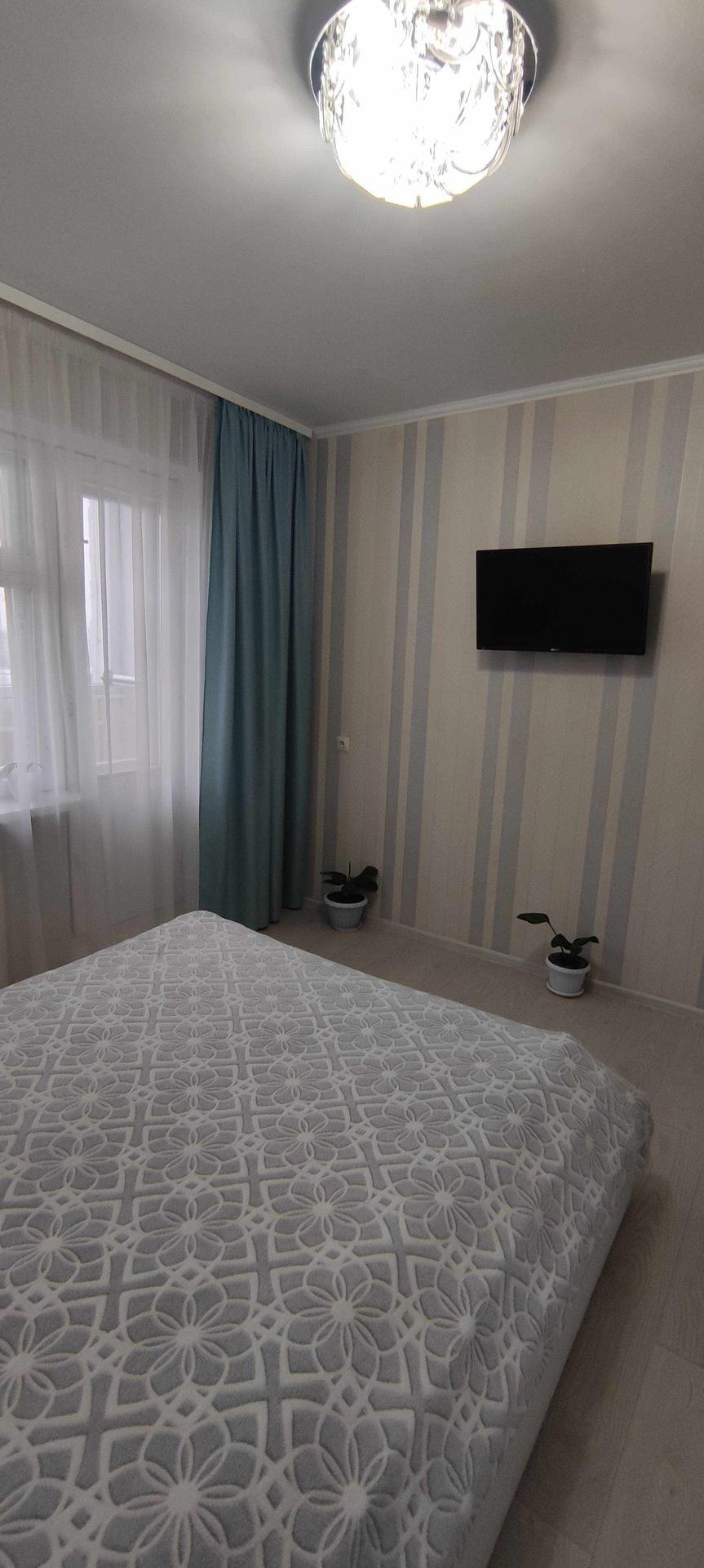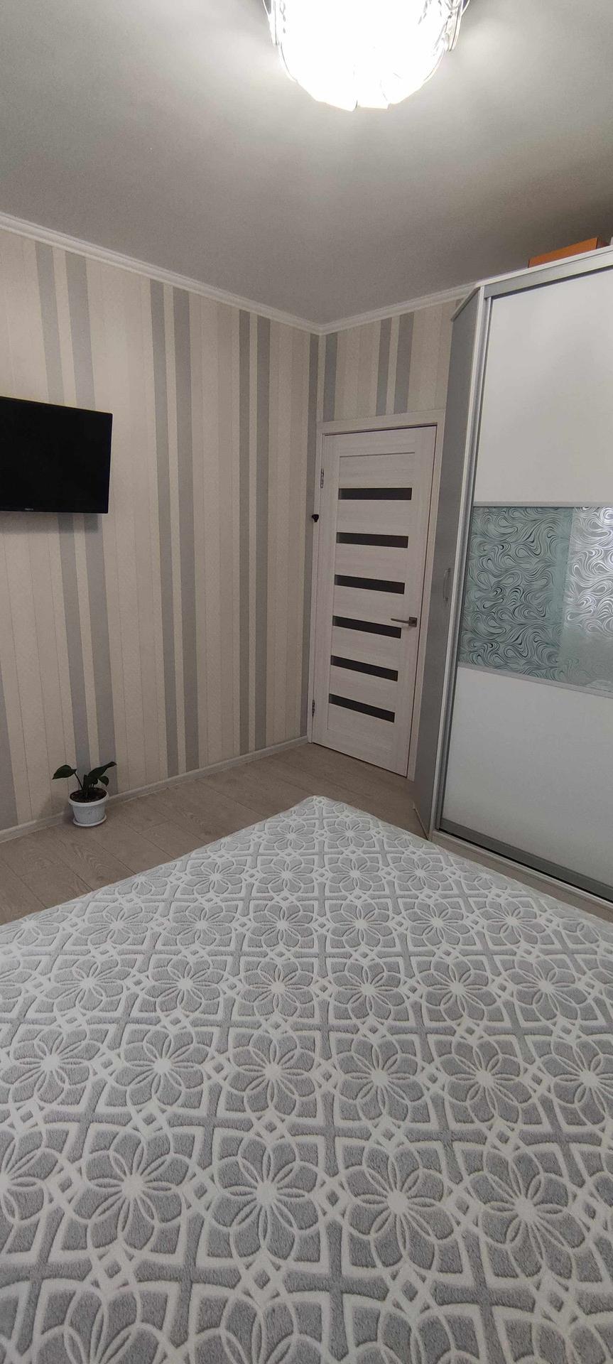 --Спальня 12,1 км.м - выложен ламинат , обои двух расцветок . Остается при покупке - большая двухспальняя кровать с матрасом , две прикроватные тумбы , большой шкаф купе для вещей , телевизор , в комнате установлена сплин-система (кондиционер), шторы .