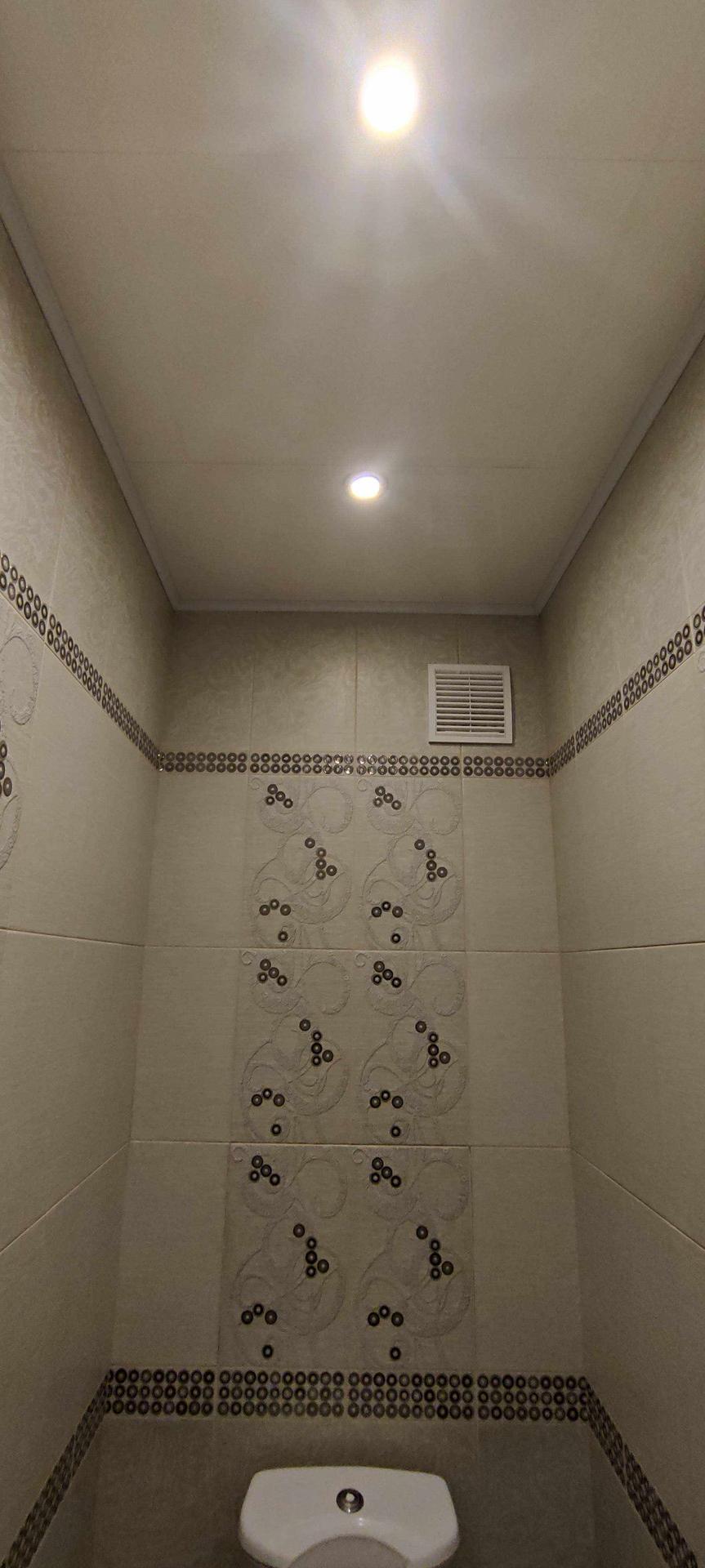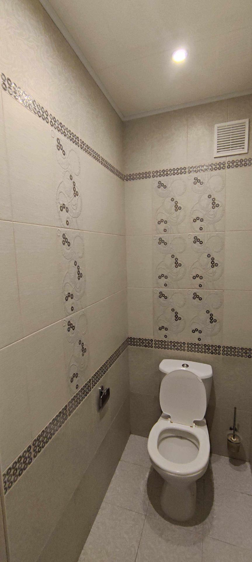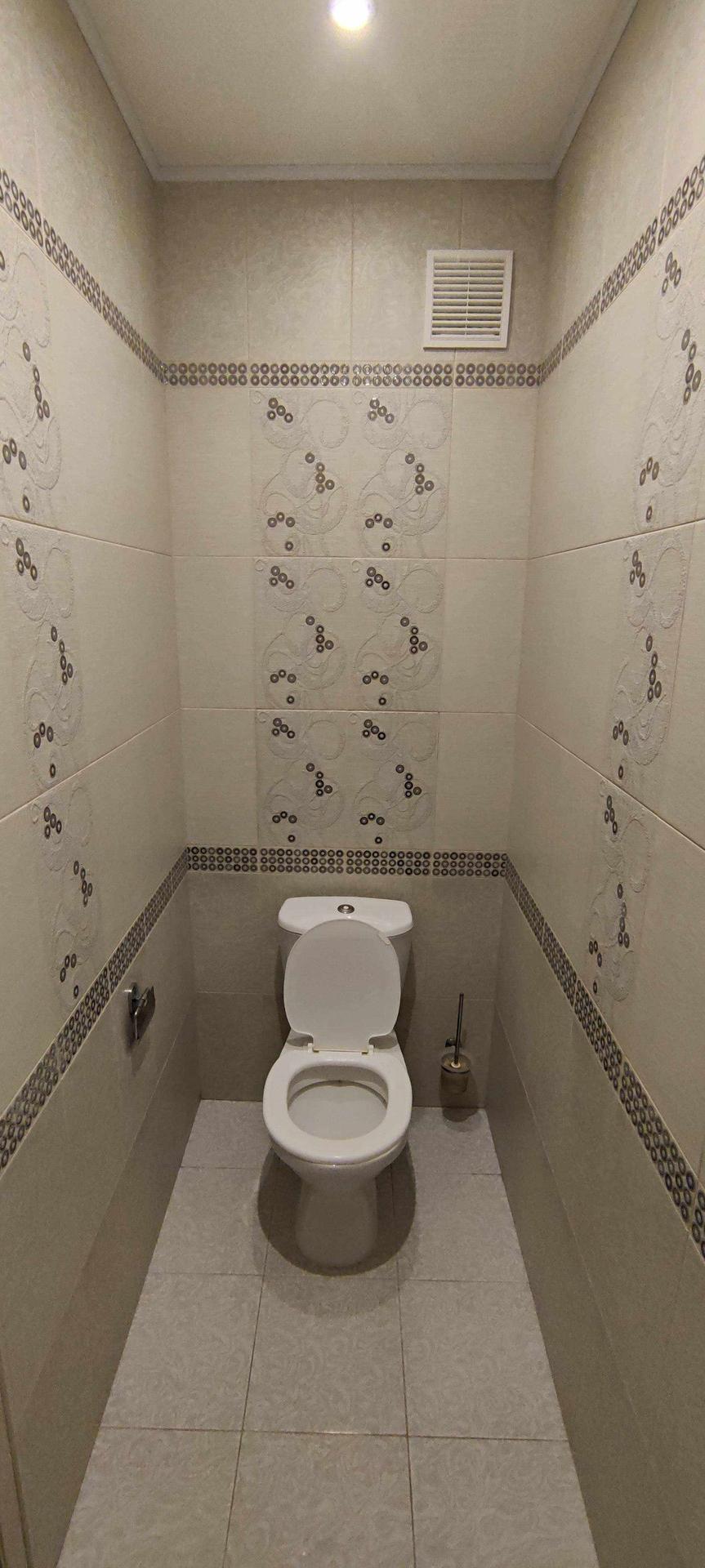 --Туалет 1,7км.м - стены и пол выложены керамической плиткой , сделан потайной люк для счетчиков и хранения бытовой химии и другого.