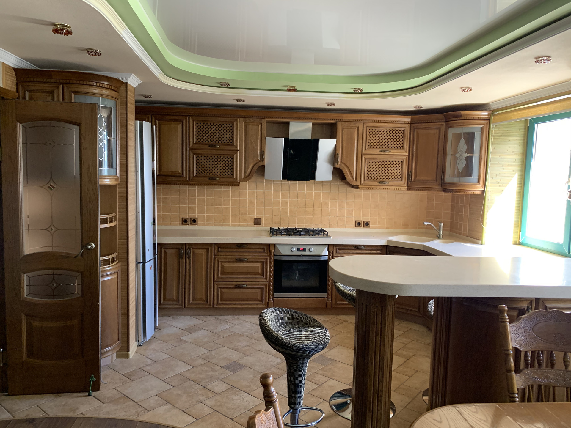 - кухня 24 кв.м. со встроенной мебелью из дуба, барная стойка, керамогранитная столешница, морозильник, посудомоечная машина.