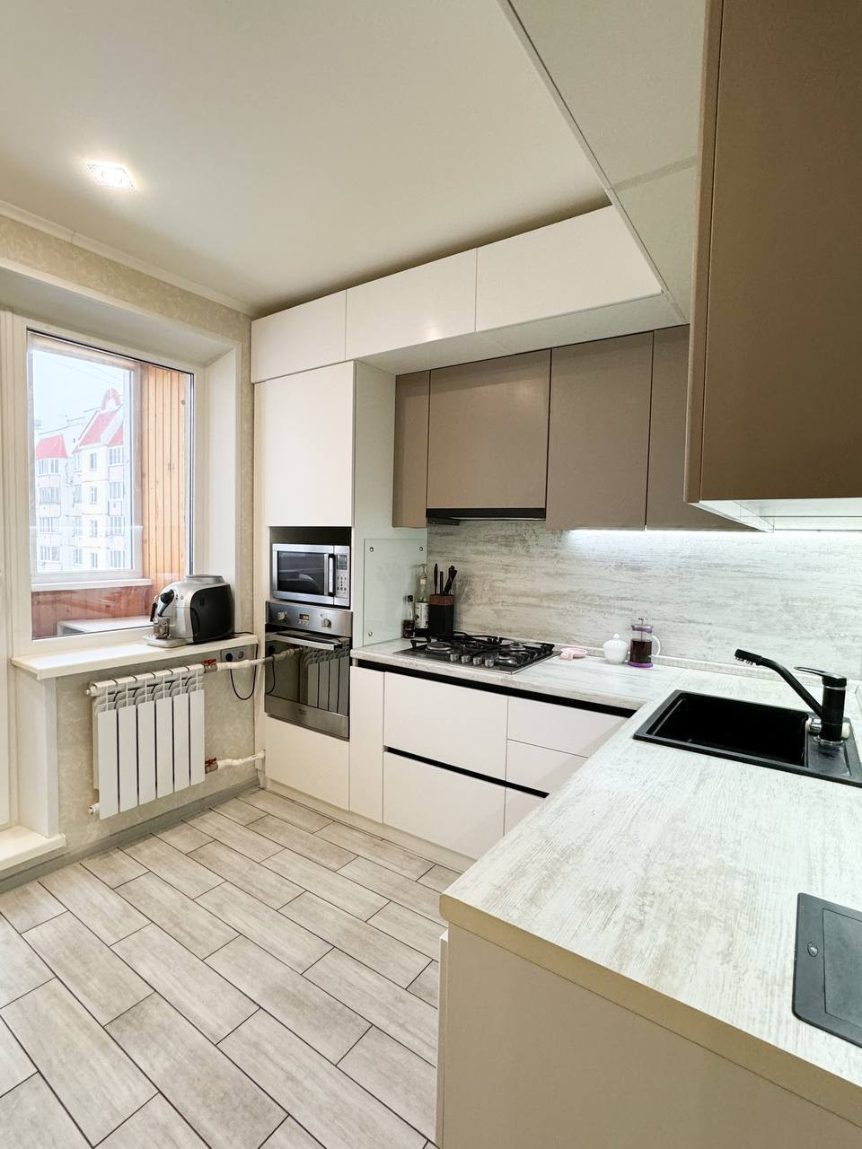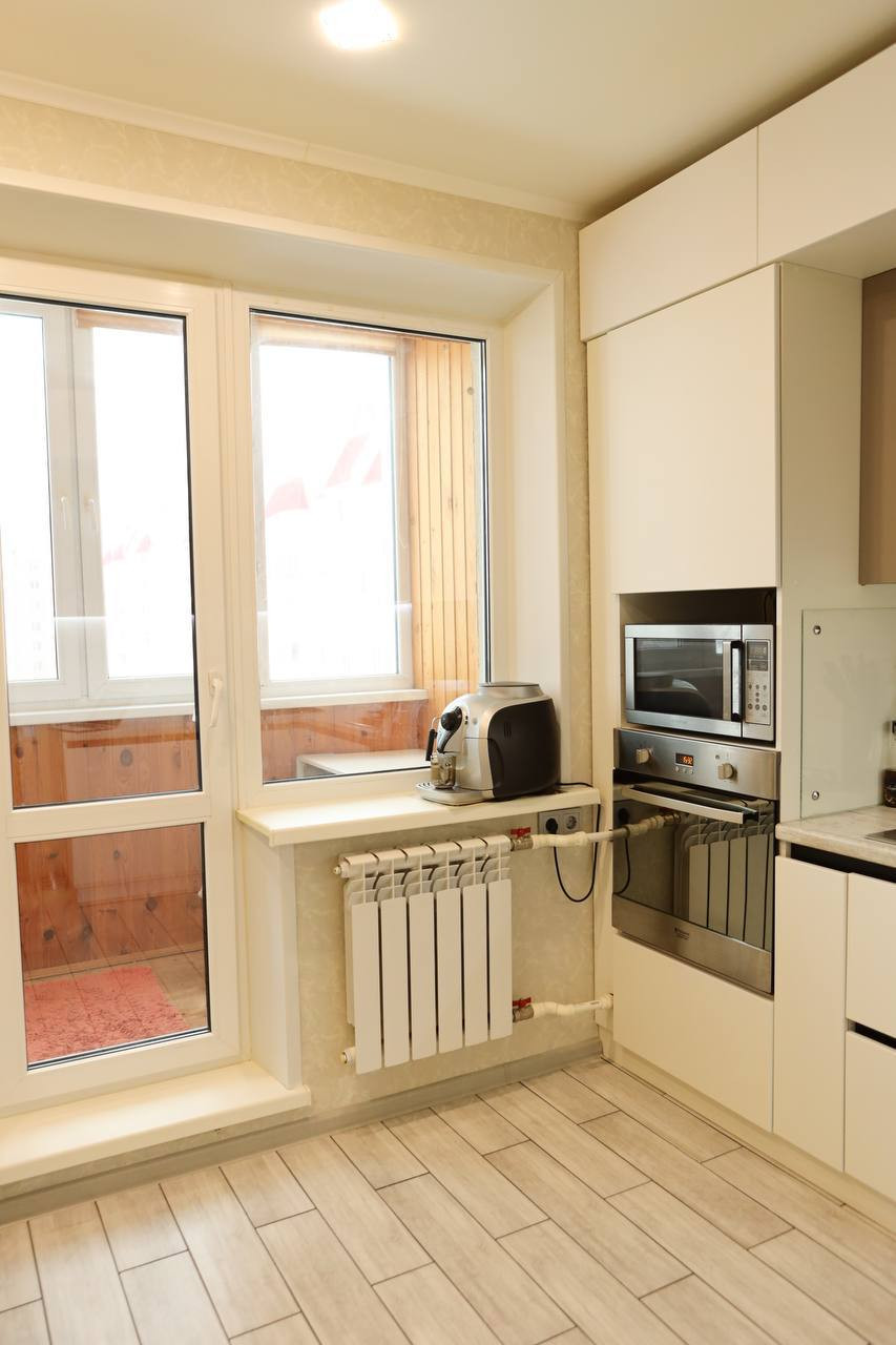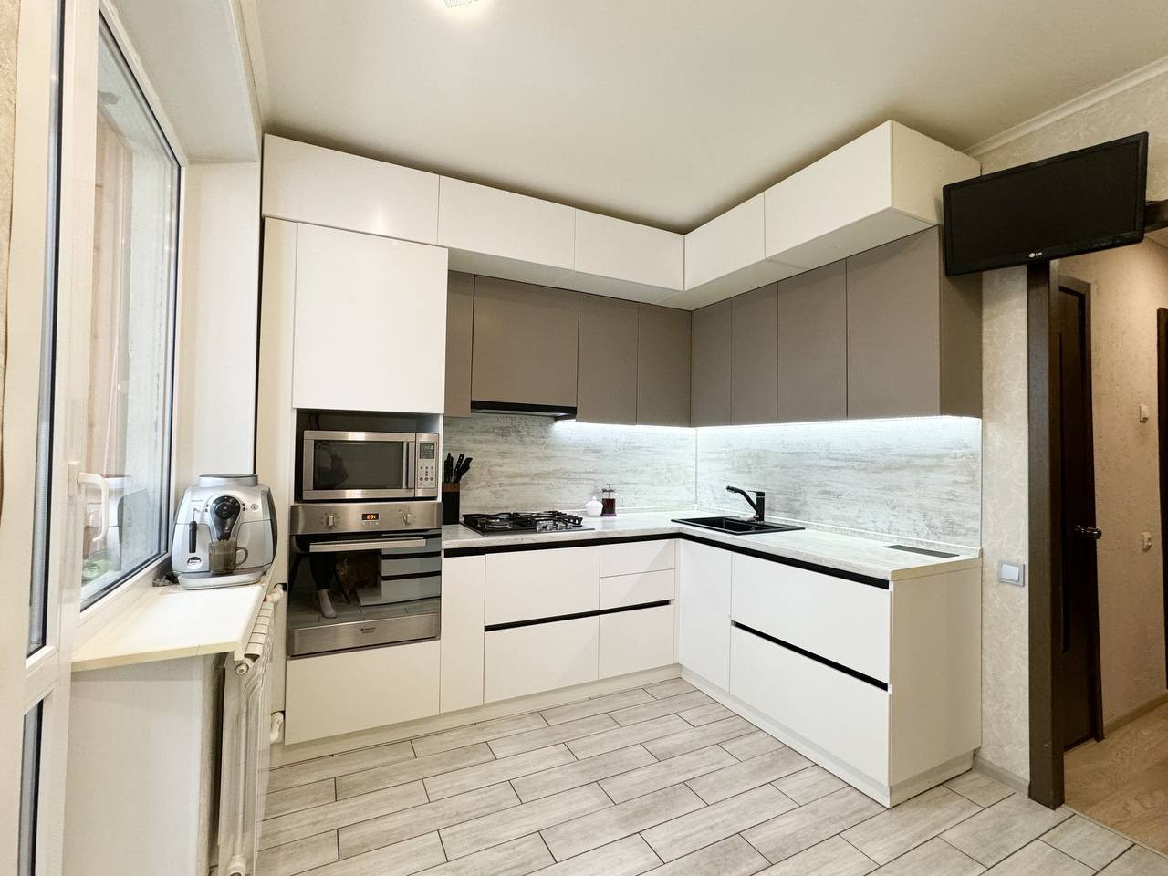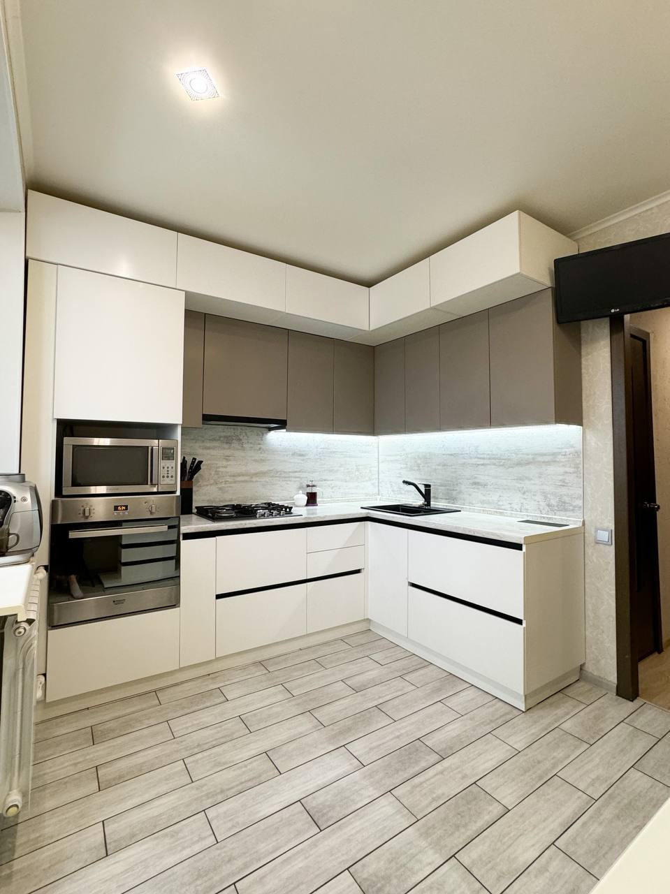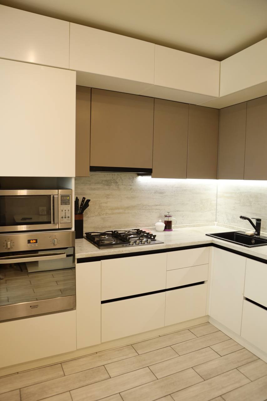 ・кухня выполнена по современному дизайну, в светлых тонах, сделана по индивидуальному заказу со встроенной бытовой техникой, качественными доводчиками, подсветкой рабочей зоны, установлен фильтр на воду (обратный осмос).