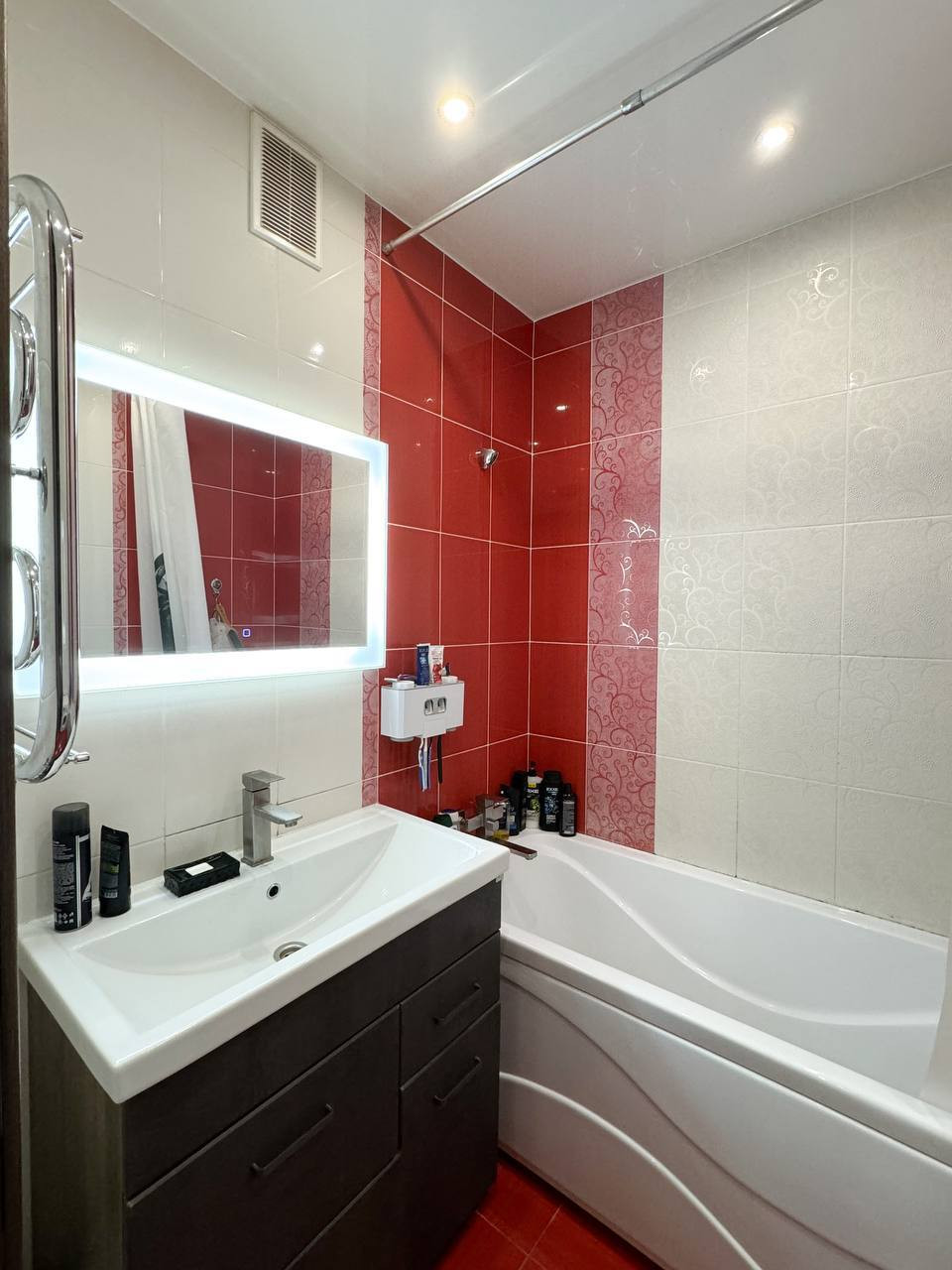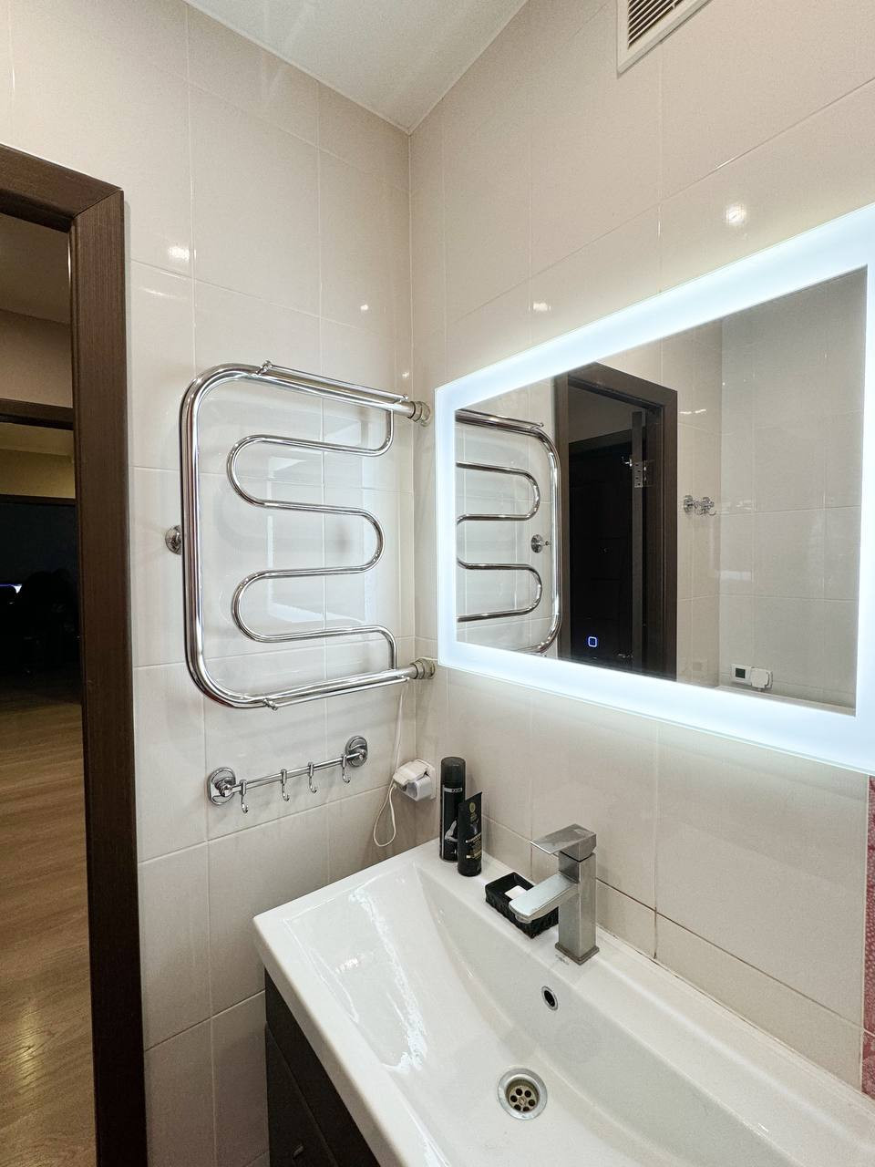 ・Ванная комната полностью укомплектована: тумба с большой раковиной, зеркалом и дополнительными розетками для стиральной машины и фена, оснащена эффективной системой теплый пол., в туалете-установлена инсталляция с ободоковым унитазом с микролифтом., выведен гигиенический душ.