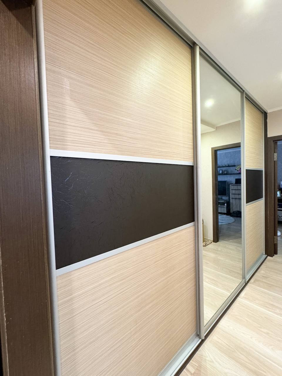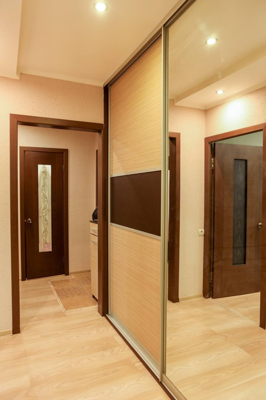 ・Встроенный шкаф купе в коридоре (делали под заказ с большими нестандартного размерами раздвижными дверьми и дорогой немецкой фурнитурой.)
