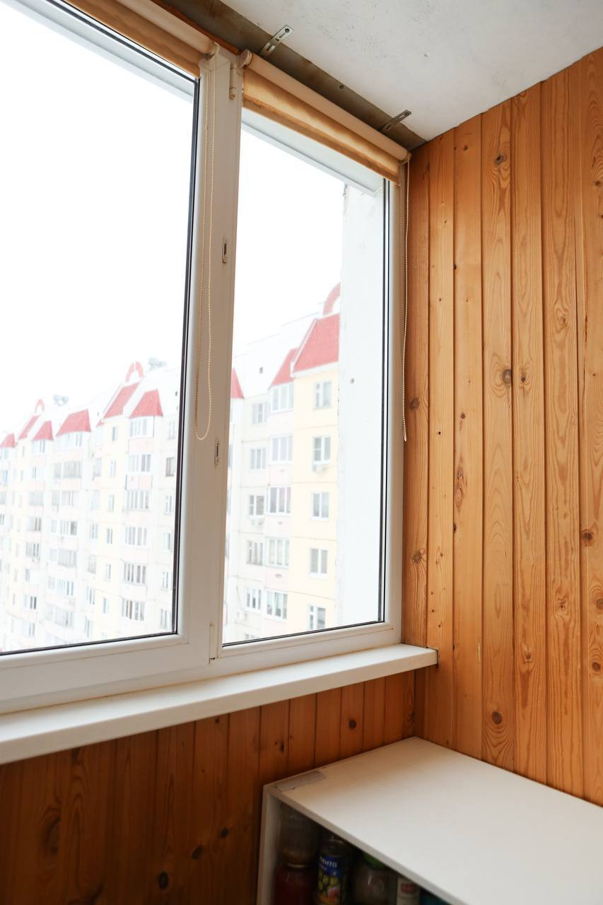 ・Уютный балкон, отделанный вагонкой, застеклен окнами ПВХ.