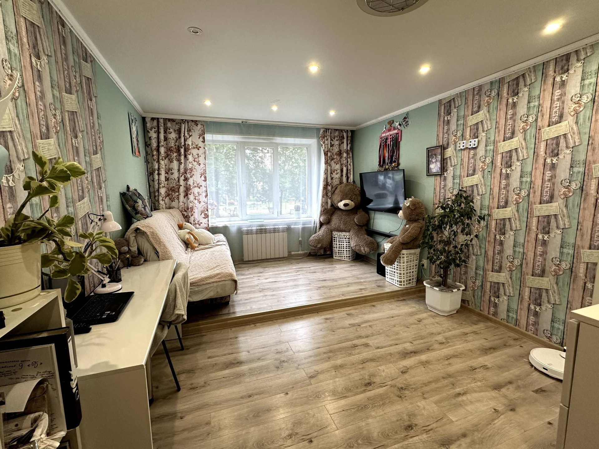 В квартире сделан качественный ремонт:натяжные потолки,окна ПВХ,полы качественный ламинат,везде утеплены.Санузел и ванная комната отделана кафелем,вся сантехника в отличном состоянии.На случай отключения горячей воды установлен водонагреватель!