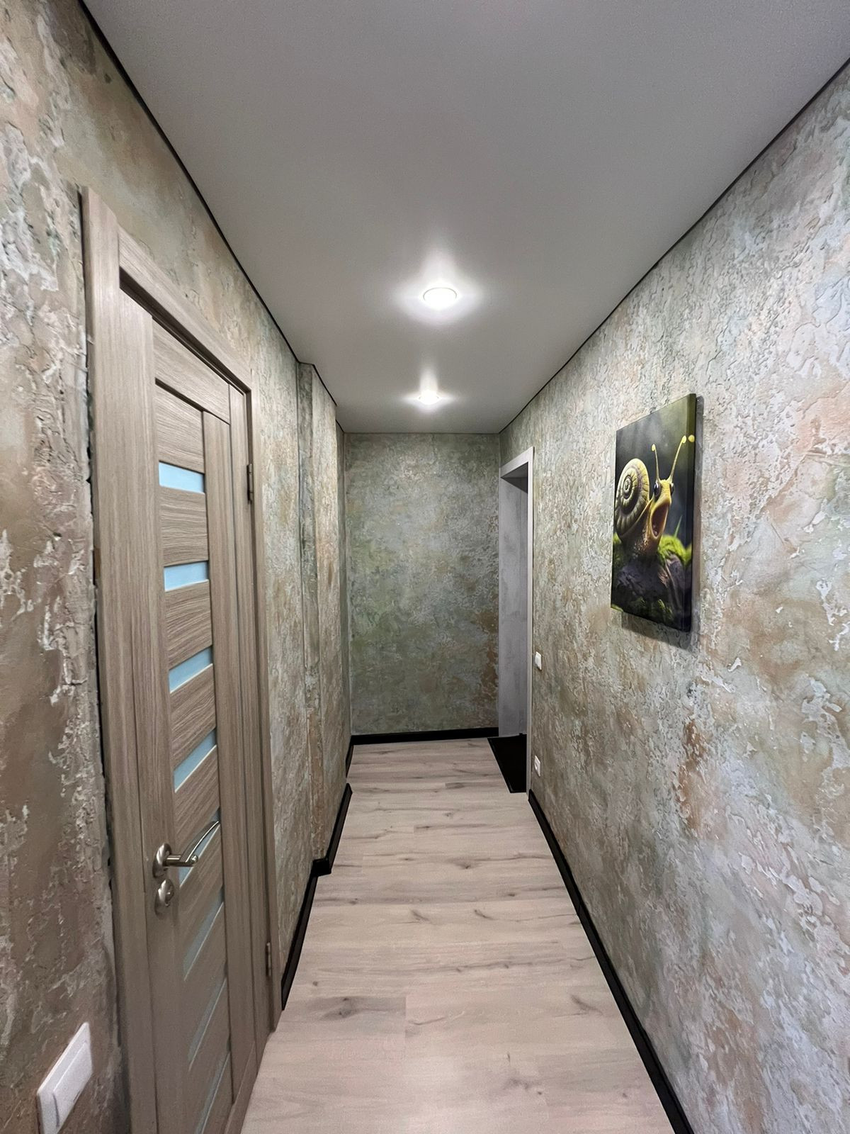 Натяжные потолки, ламинат. Стены обои и декоративная штукатурка.