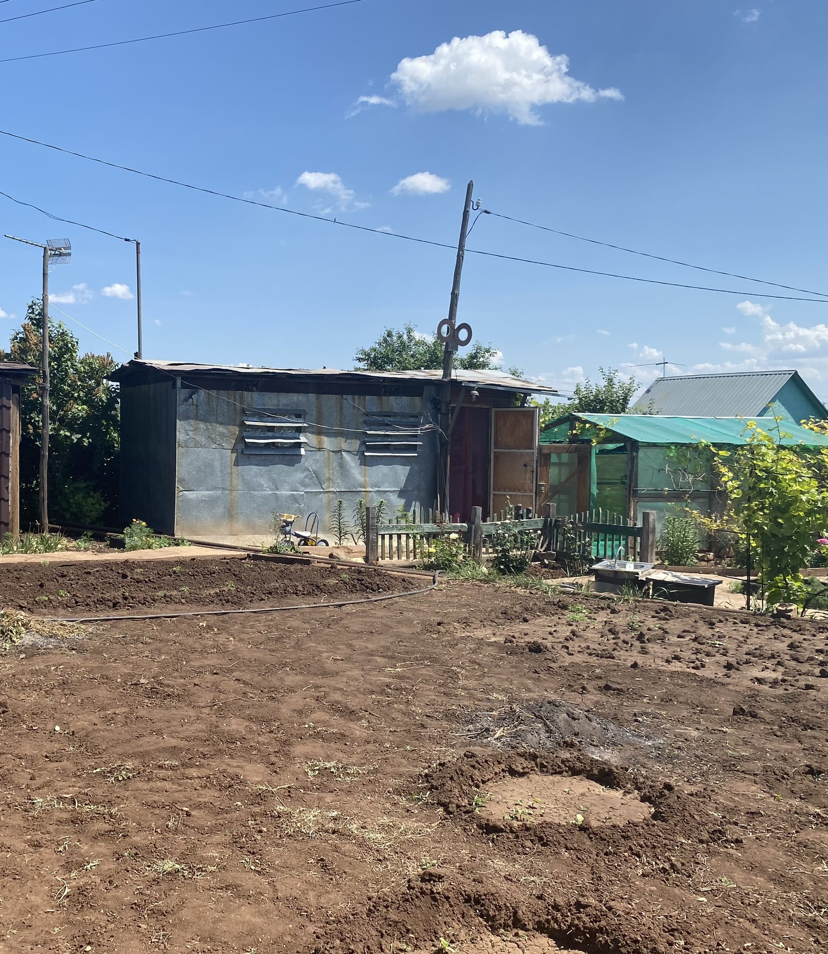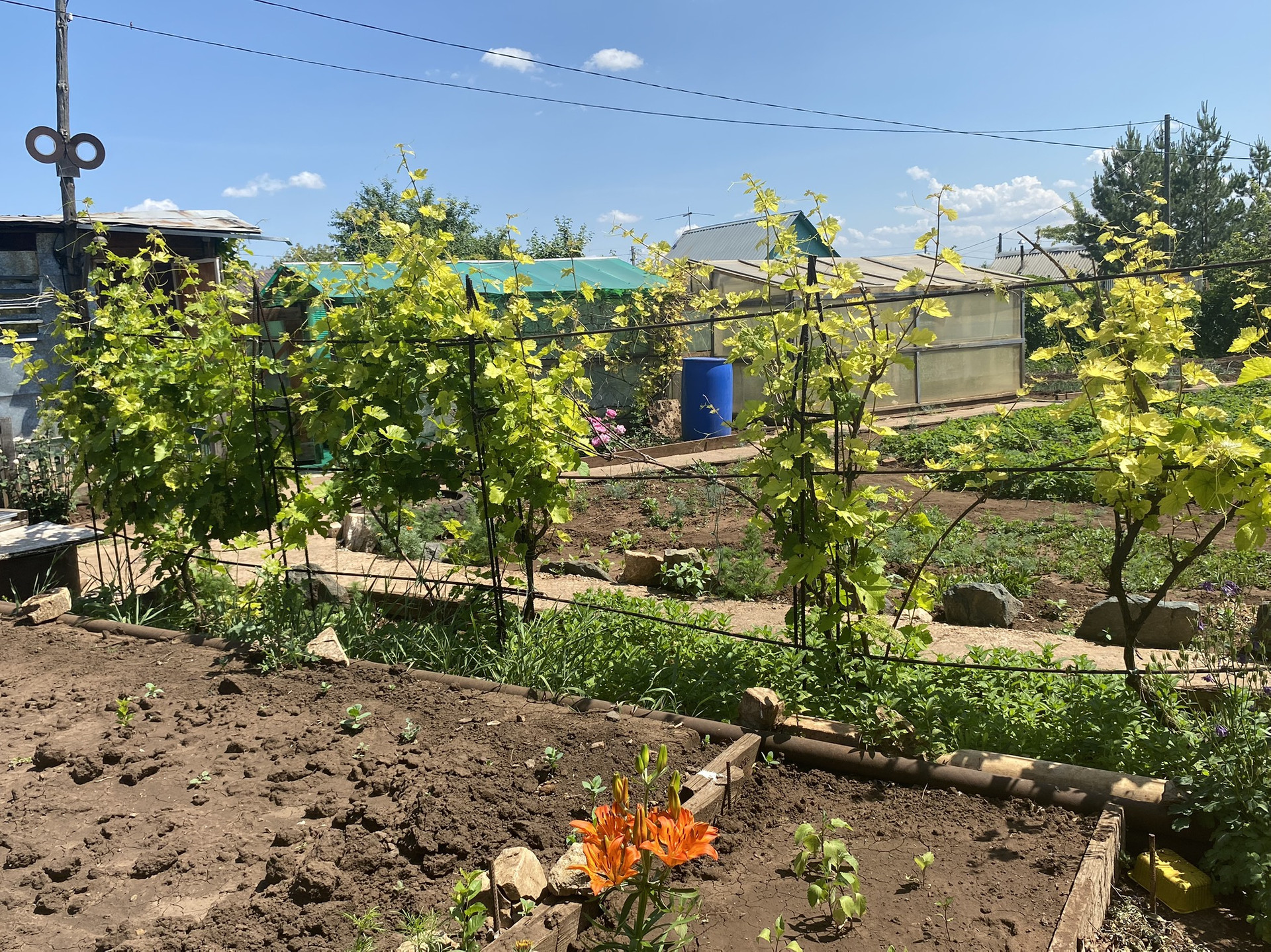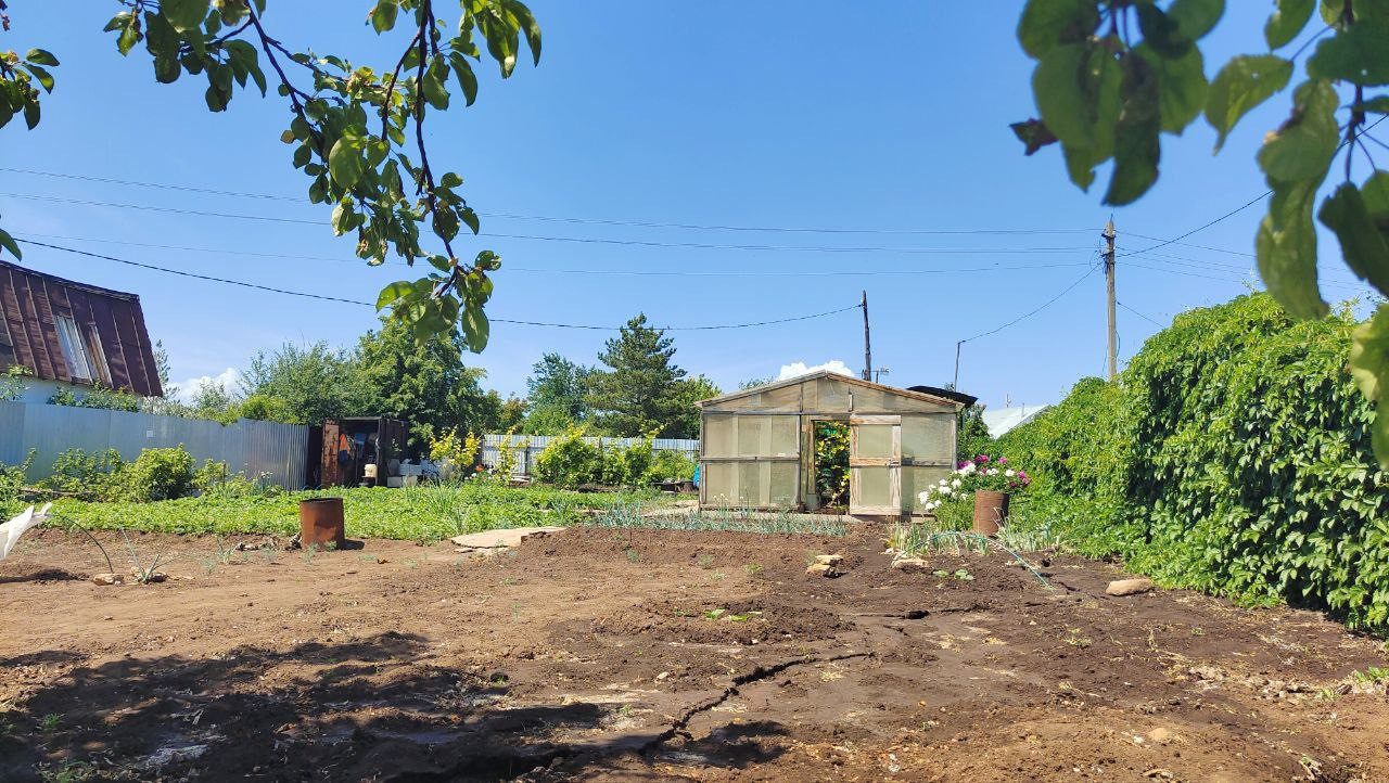 НАСАЖДЕНИЯ: помидоры, огурцы, картошка, малина, клубника 2 сорта, мята, лук, различные цветы, смородина красная и черная, 3 дерева яблони, виноград, облепихи, липа, ежевика, жимолость.