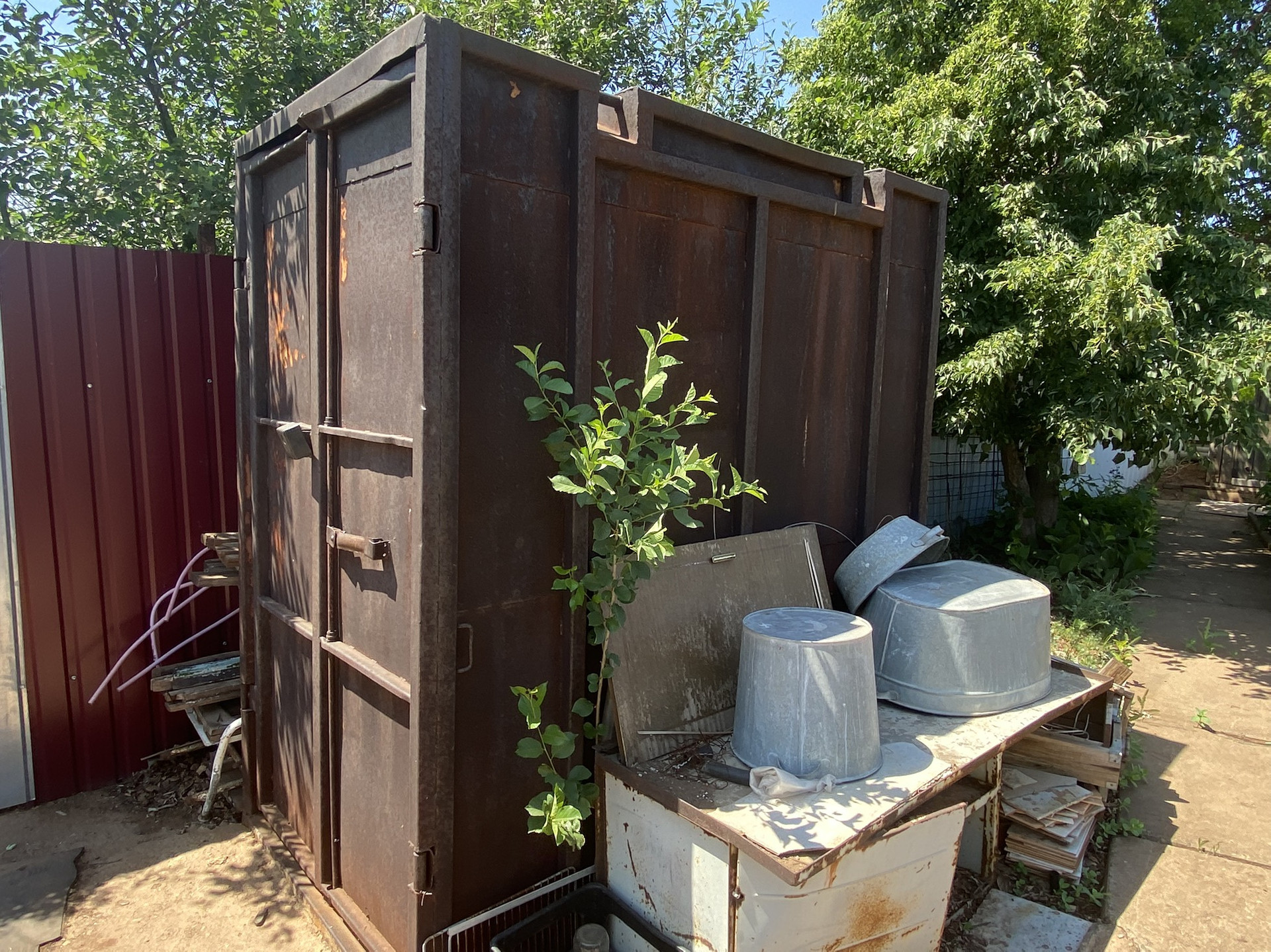 Есть небольшой жилой домик, гараж, контейнер для хранения инструментов.