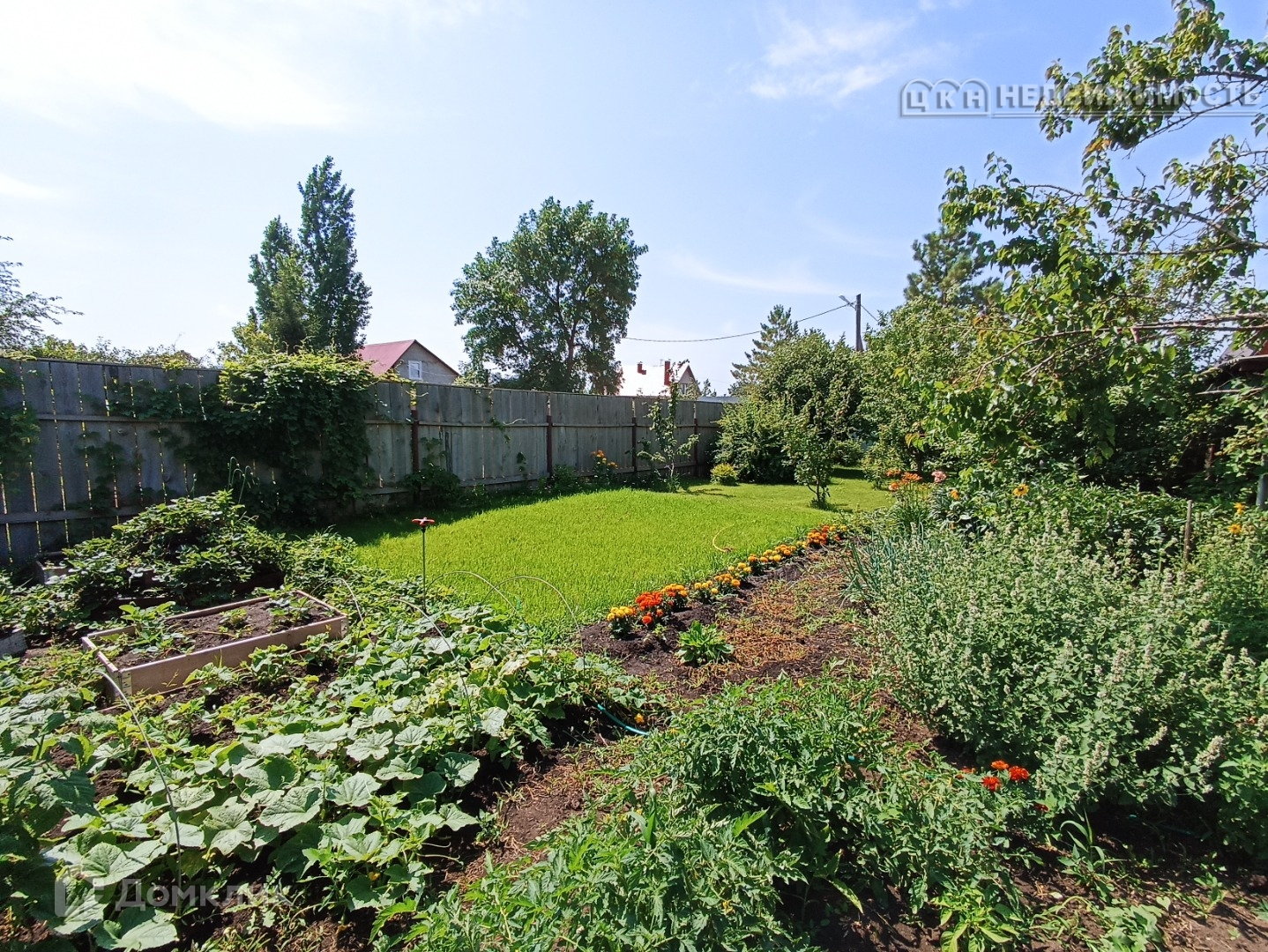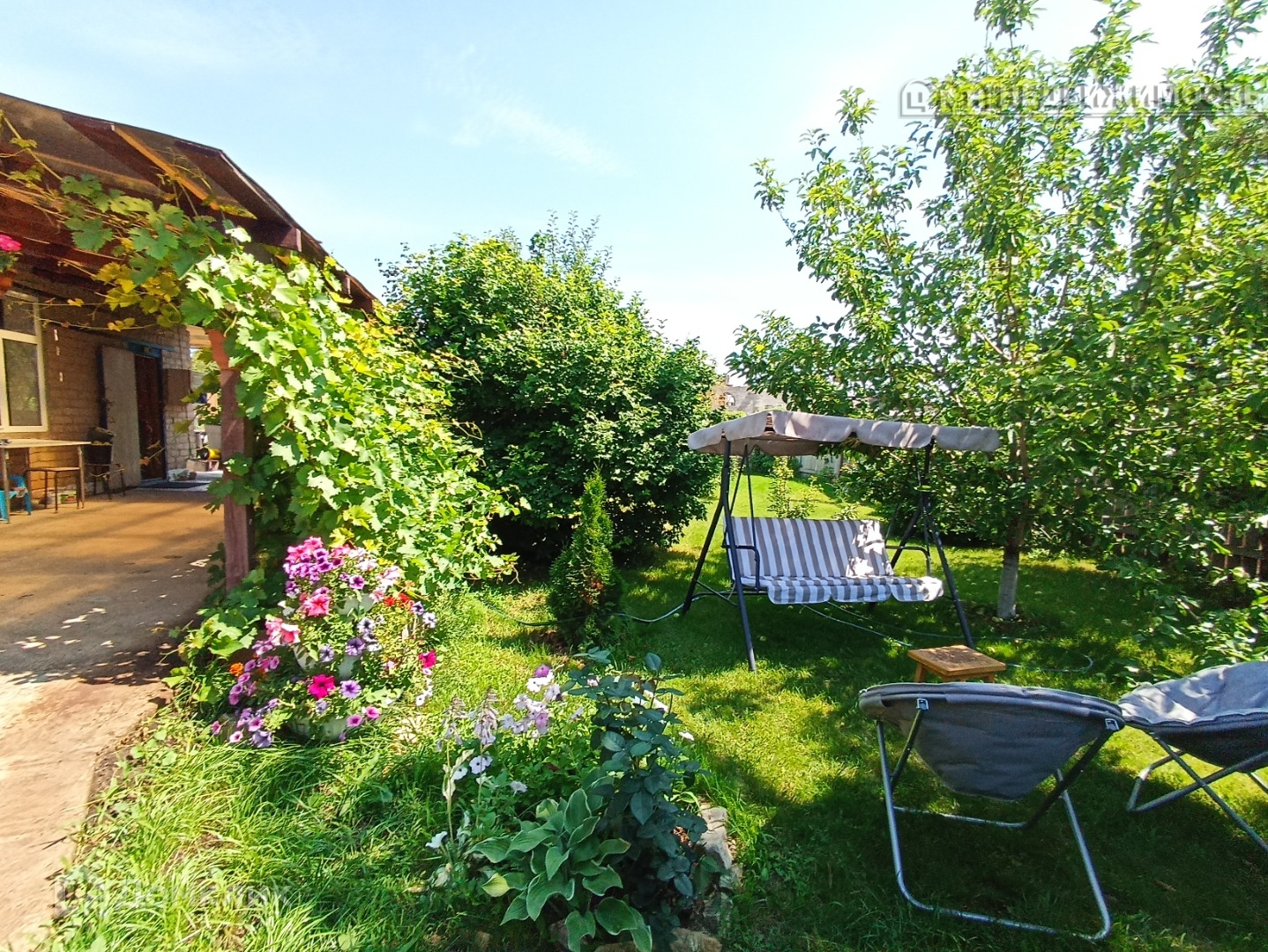 Из насаждений: малина, клубника, смородина, крыжовник, яблони, груша, жимолость, цветы, туи, газон.