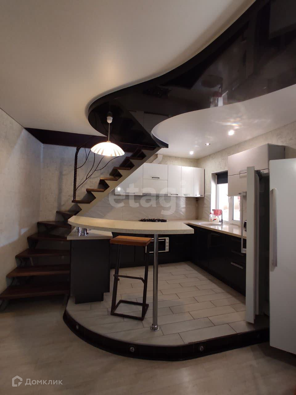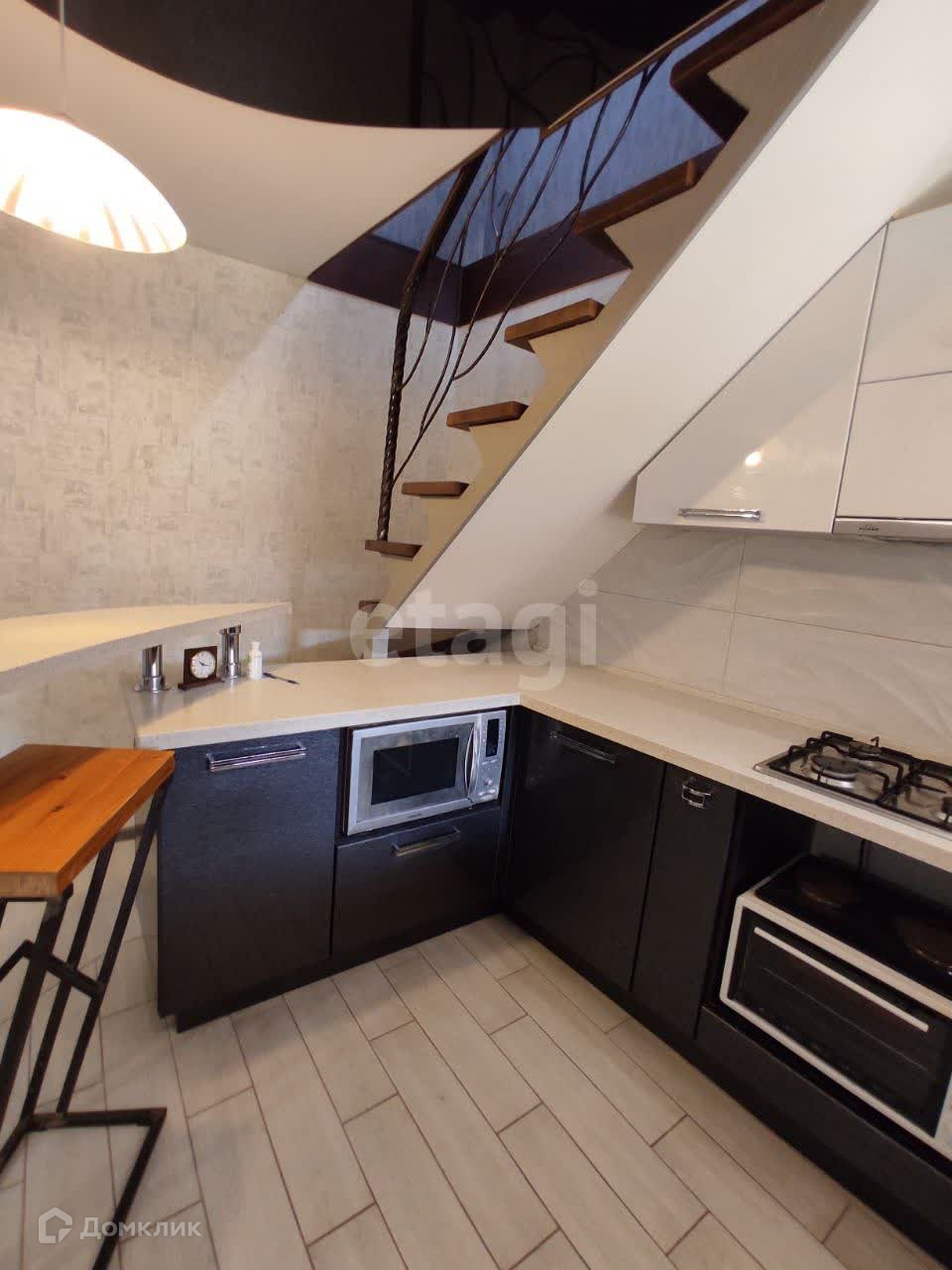На первом этаже распологается кухня-столовая, разделенная барной стойкой и подиумом с подсветкой . Новый кухонный гарнитур с каменной столешницей, лестница из бука, кладовая (в будущем можно сделать парную, выведены отводы труб), первый этаж с теплым полом.