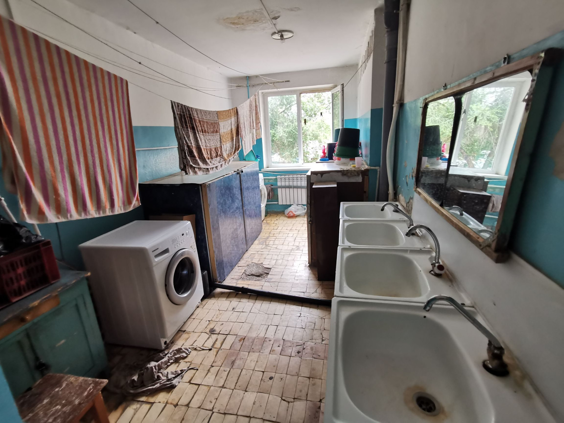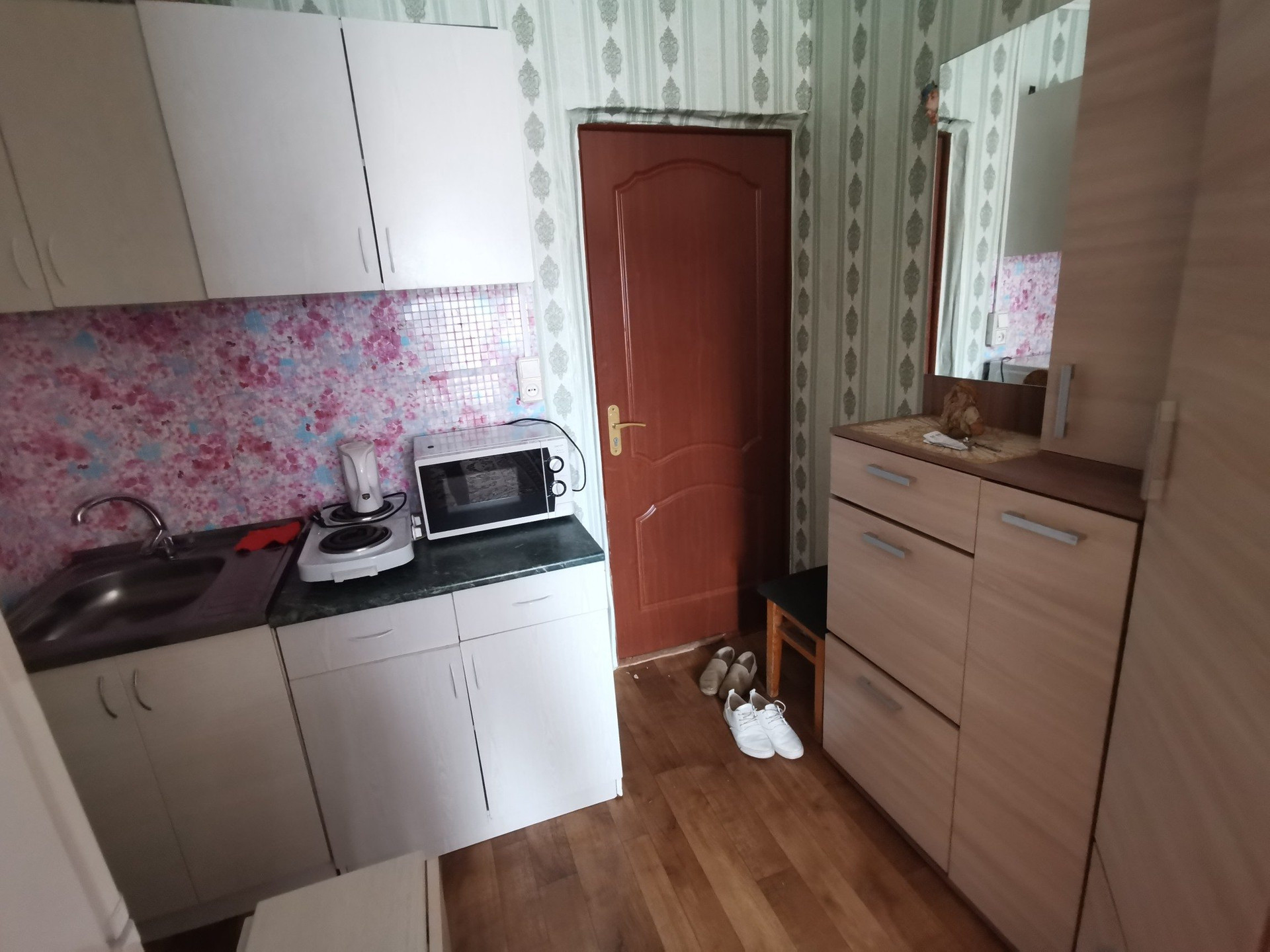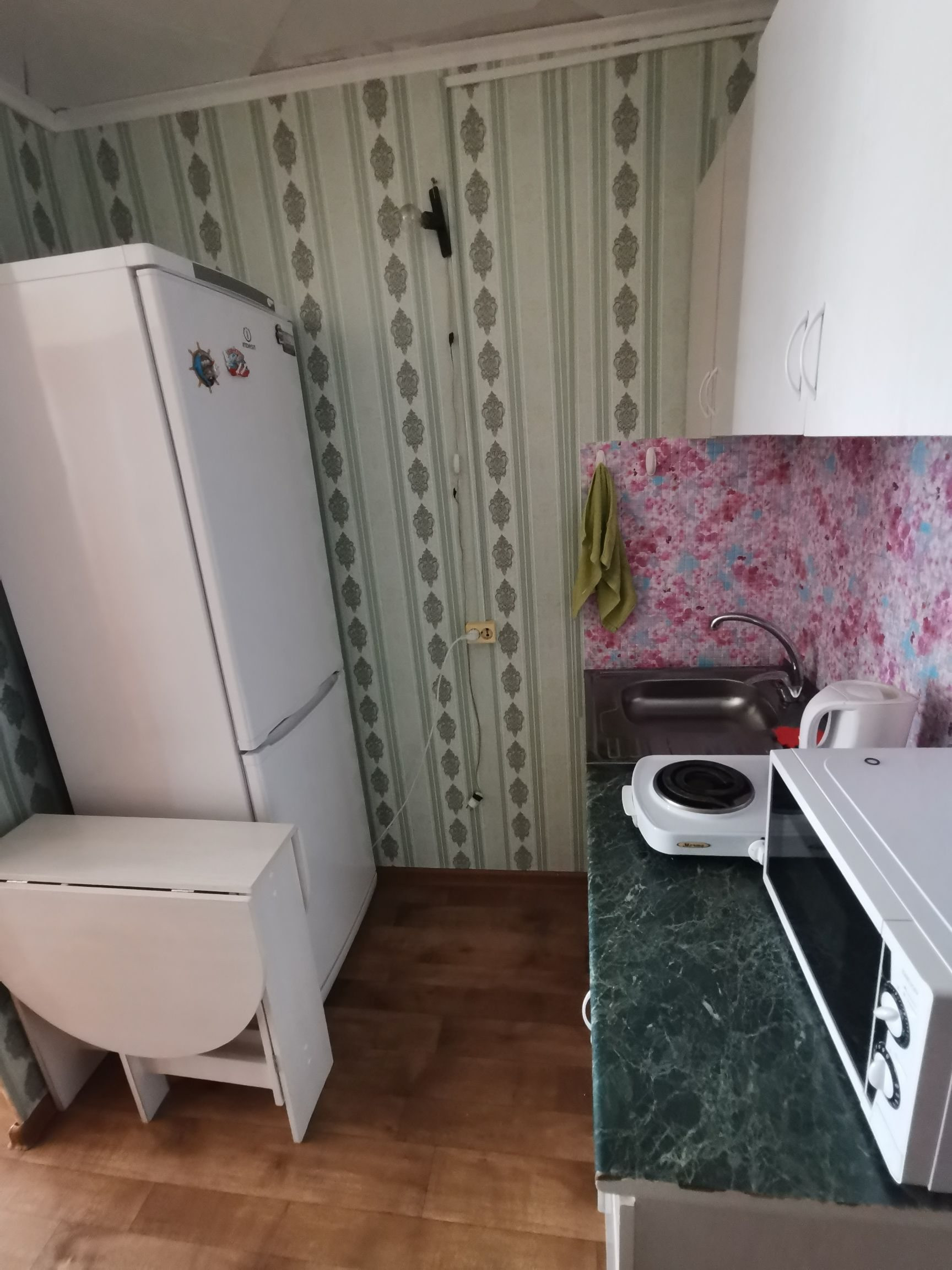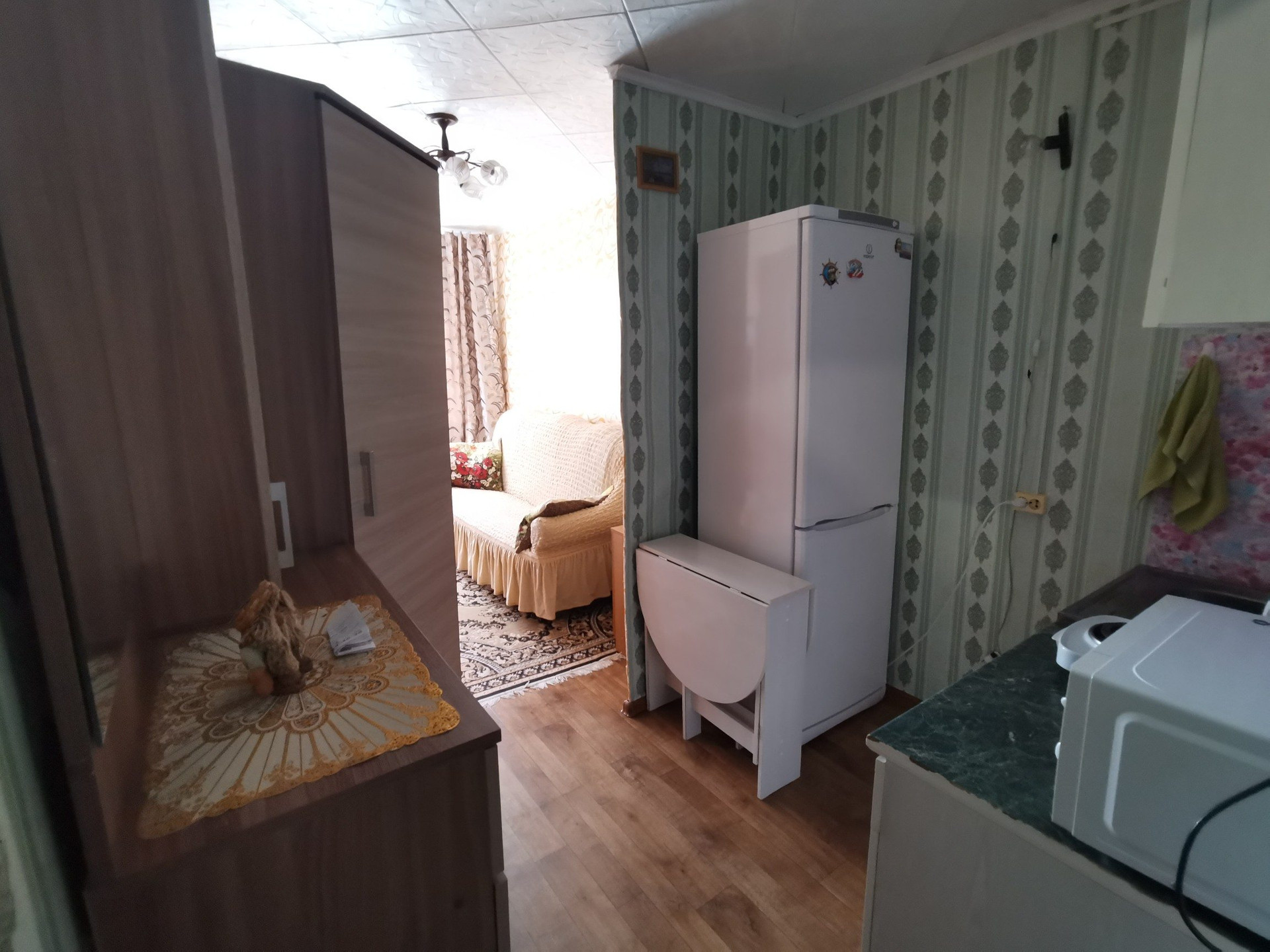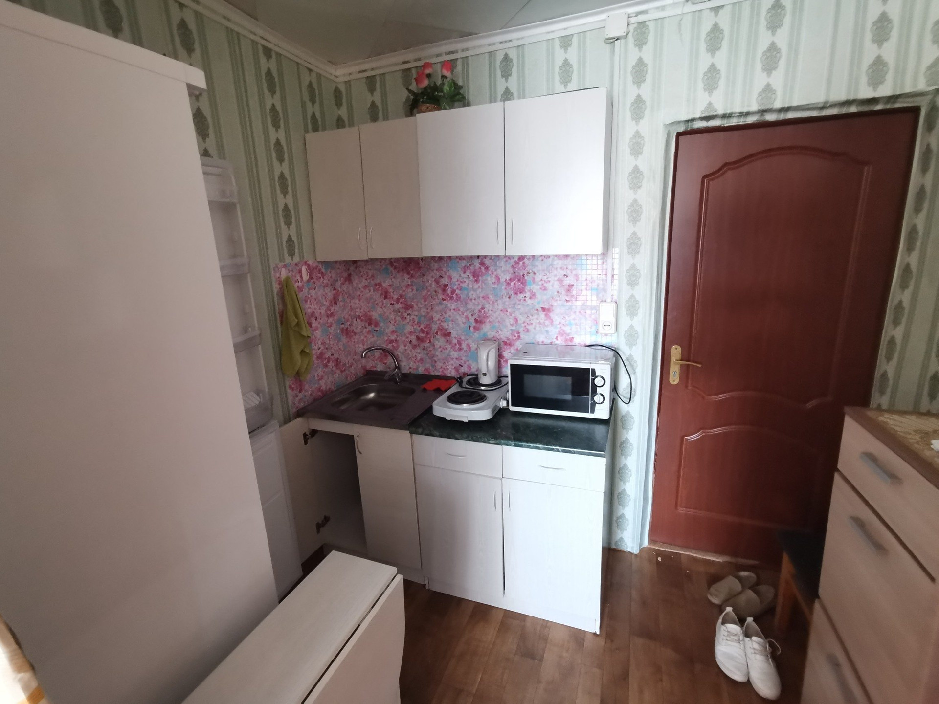 Квартира разделена на два помещения, первое это спальная зона, второе кухонная зона, заведена вода, электроплитка.Установлено пластиковое окно, на полу линолиум.