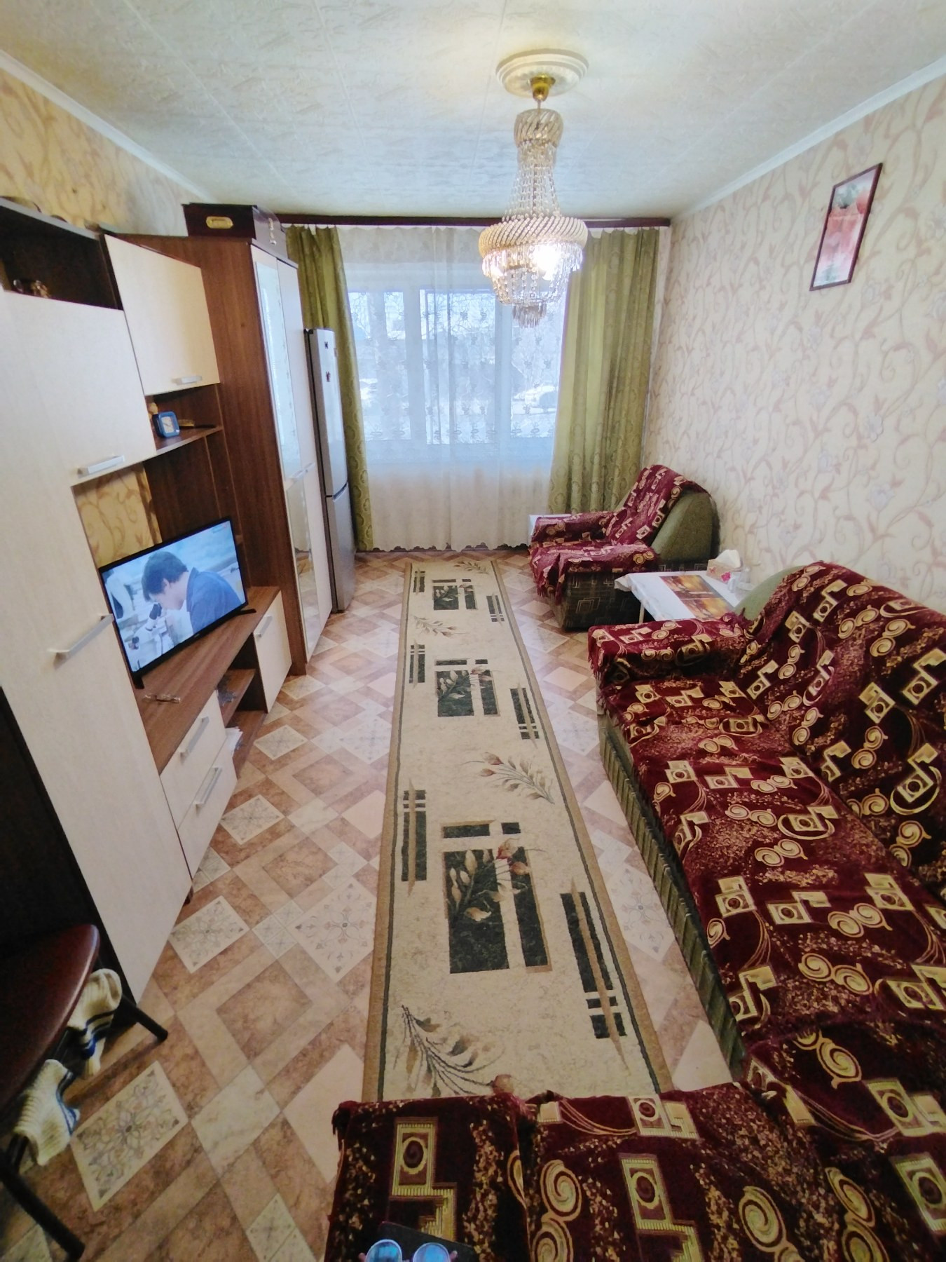 Общая площадь комнаты составляет 17,2 кв.м. Комната светлая и теплая, с косметическим ремонтом. Установлено пластиковое окно, на полу линолеум, потолок и стены выровнены.
