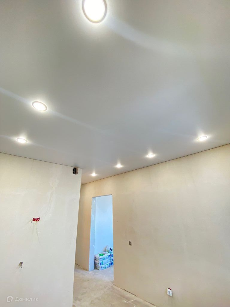 - Натянуты потолки, смонтировано точечное освещение.