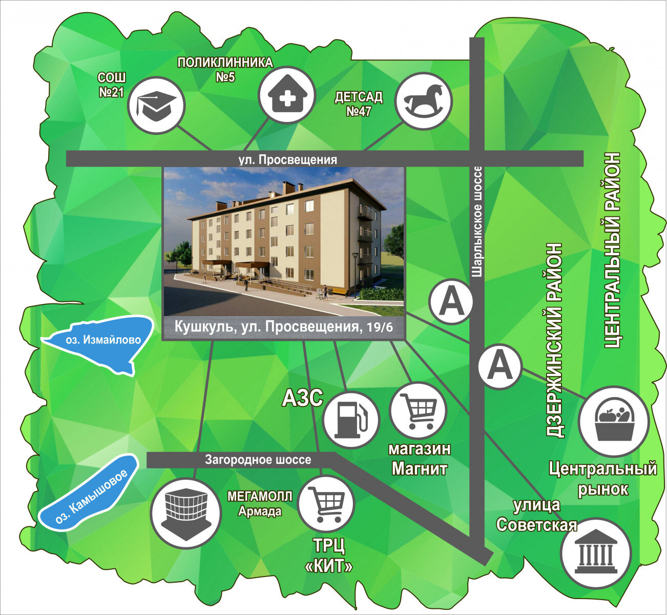 Общественный транспорт ходит каждые 15 минут. Комплекс находится всего в 5 минутах езды от МОЛЛ Армада. Хорошая транспортная развязка по улицам по Загородному шоссе.