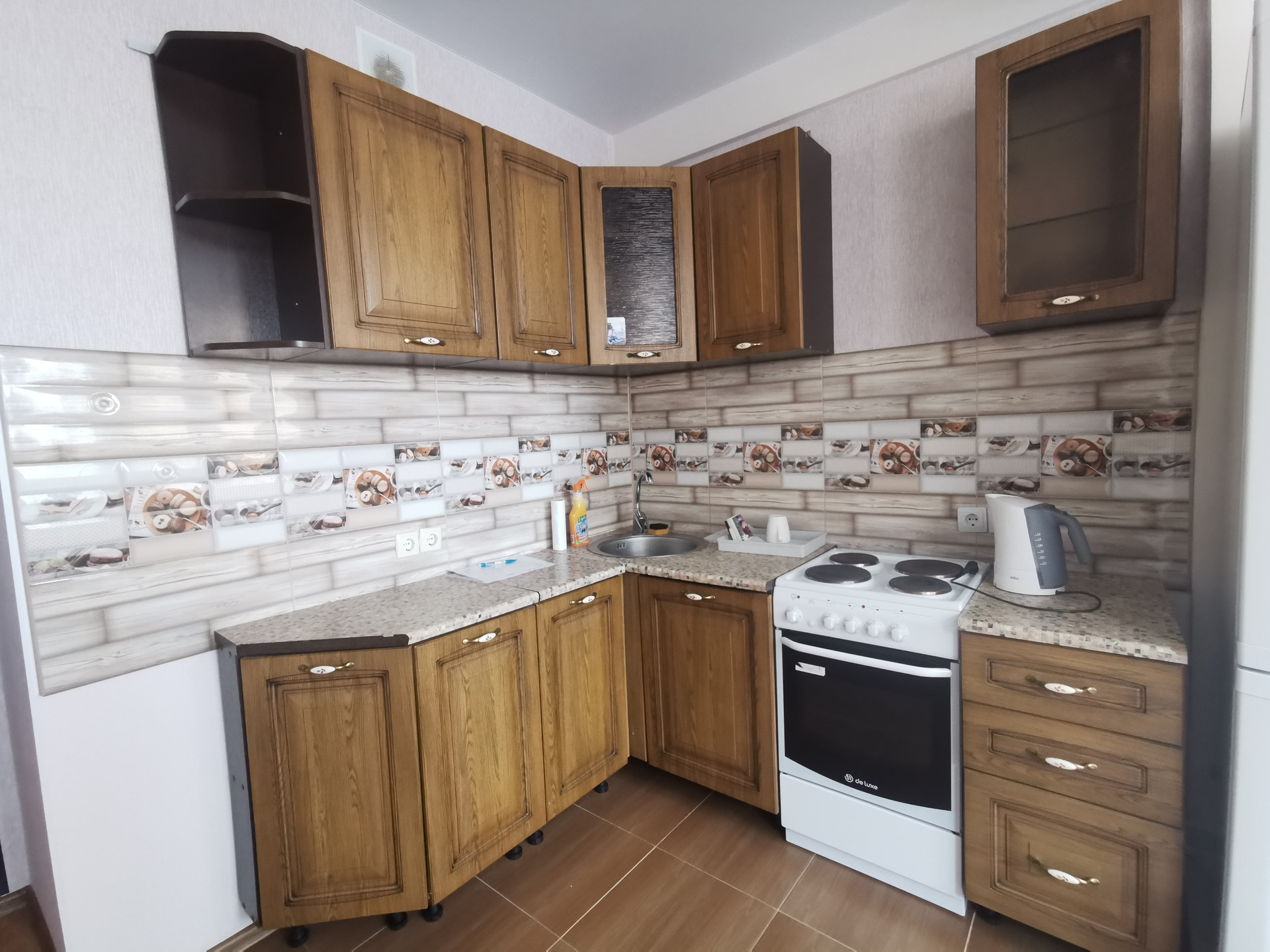 - Paбочая зона на кухне выложена кафелем