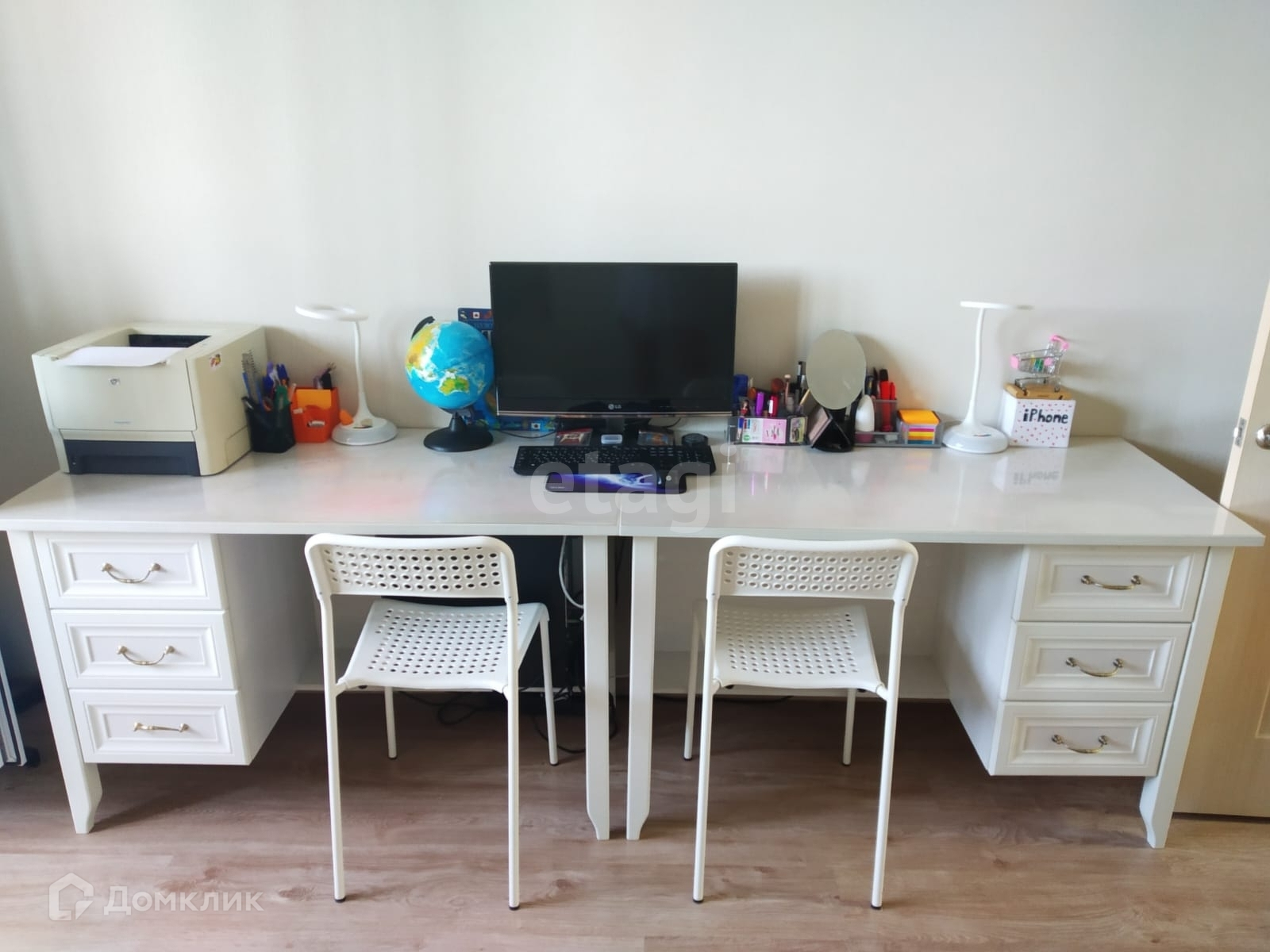 -платяной шкаф, прикроватные тумбочки, два письменных стола, две кровати, книжный шкаф в детской.
