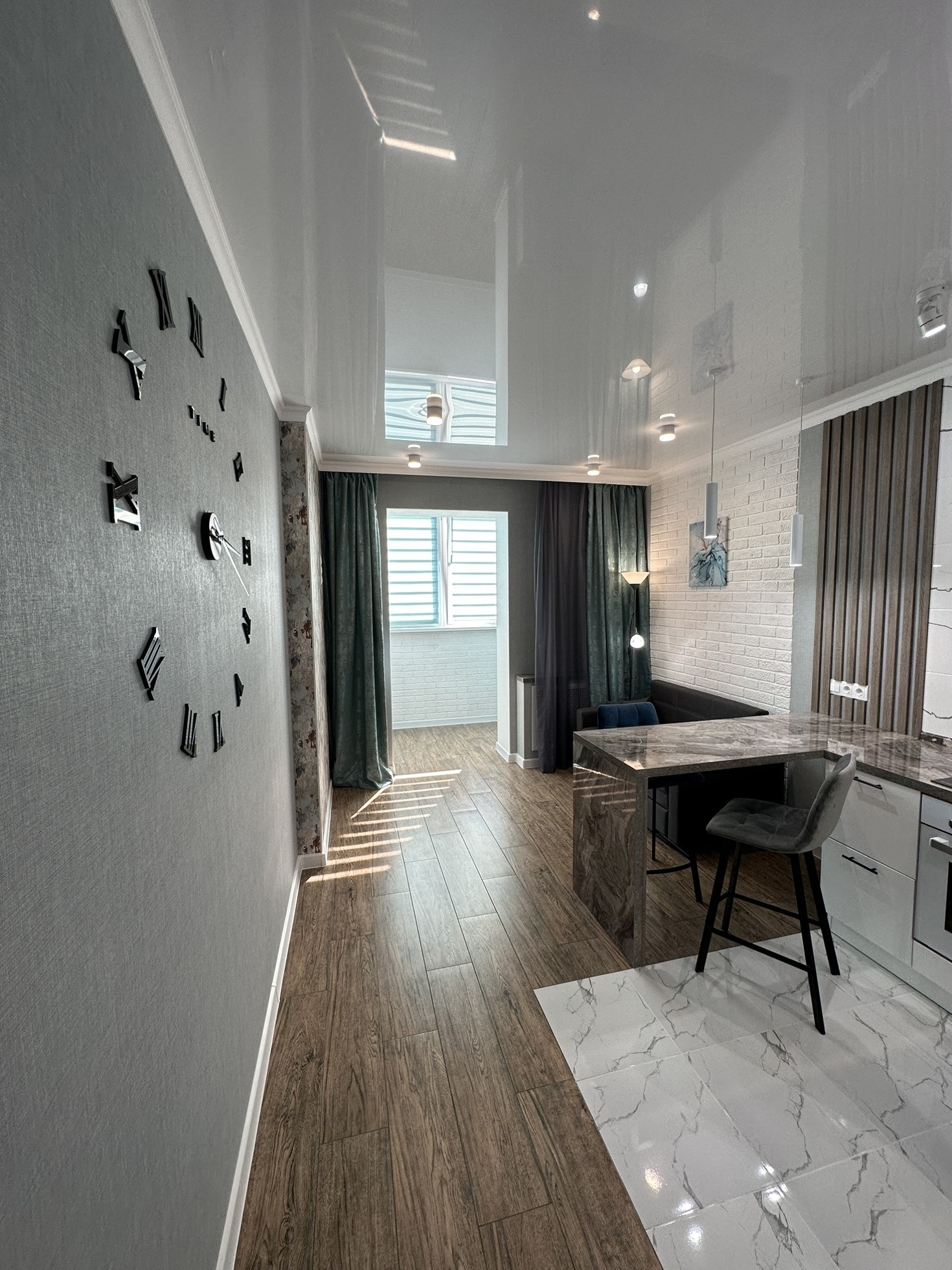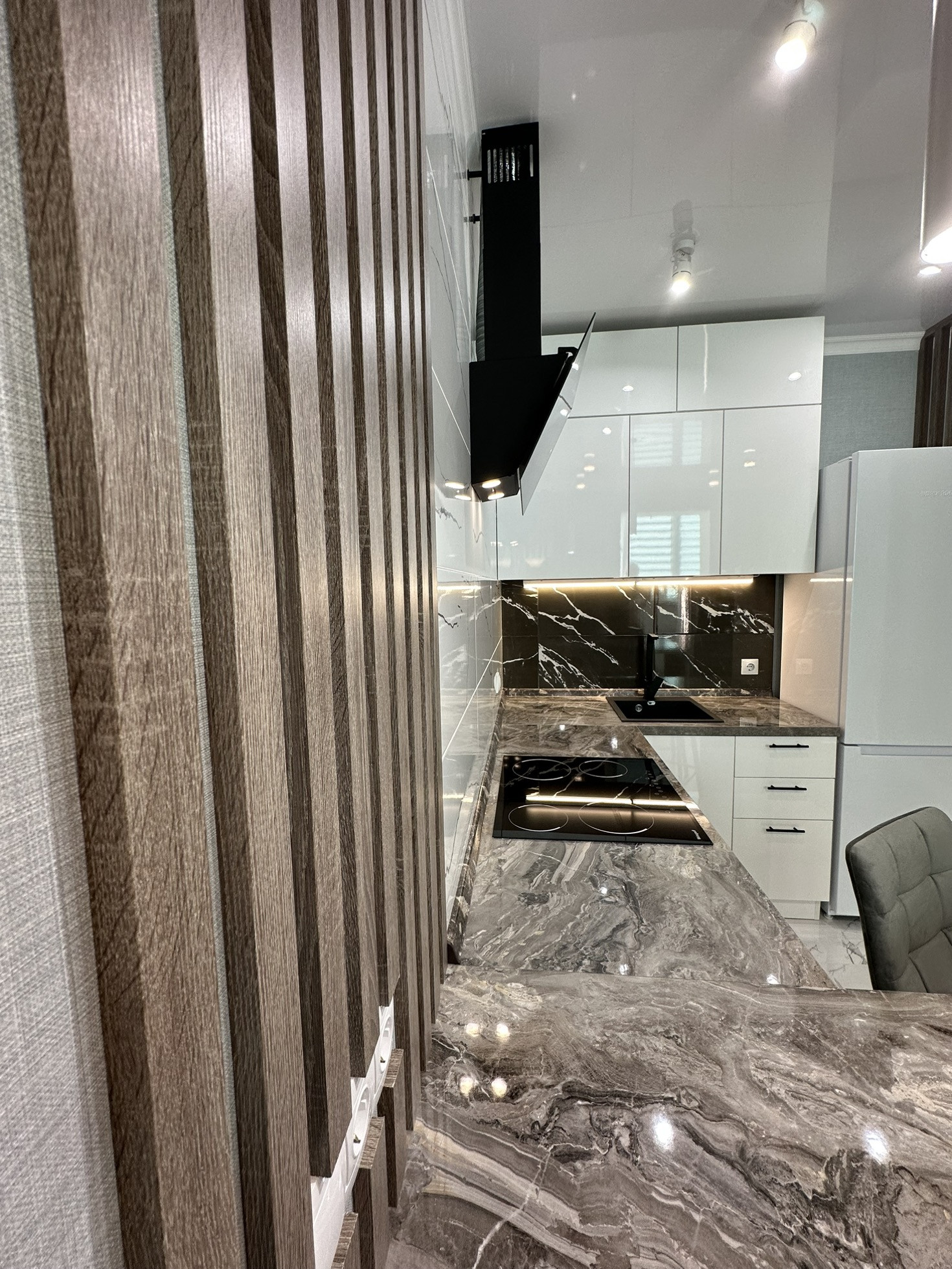 Установлен кухонный гарнитур , холодильник, духовой шкаф, варочная поверхность, вытяжка , грамотно выведена вся электрика .