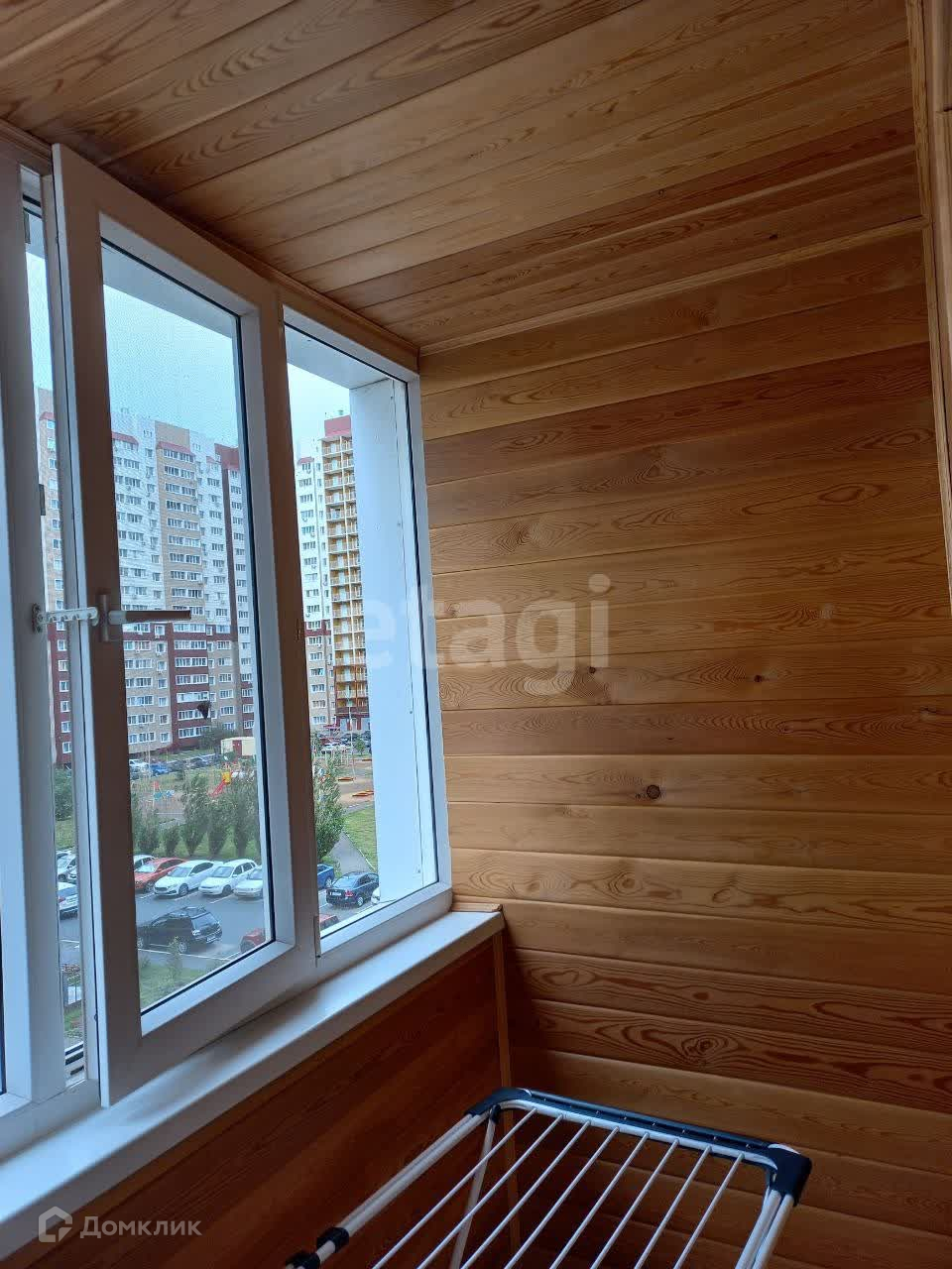 Лоджия утеплена и отделана деревом (евровагонка/лиственница), что создает дополнительное пространство для отдыха и расслабления.