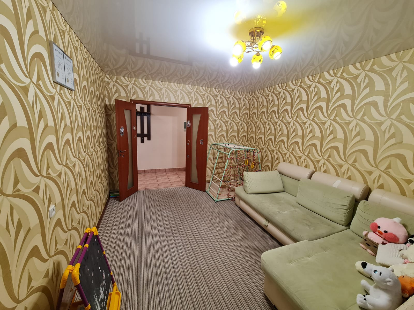 Ремонт выполнен из качественных материалов: в кухонной зоне и коридоре на полу плитка, в комнатах постелен ковролин, натяжные потолки, стены выровнены, оклеены обои, раздельный санузел - выложен кафелем, установлена хорошая сантехника, лоджия застеклена пластиковым стеклопакетом.
