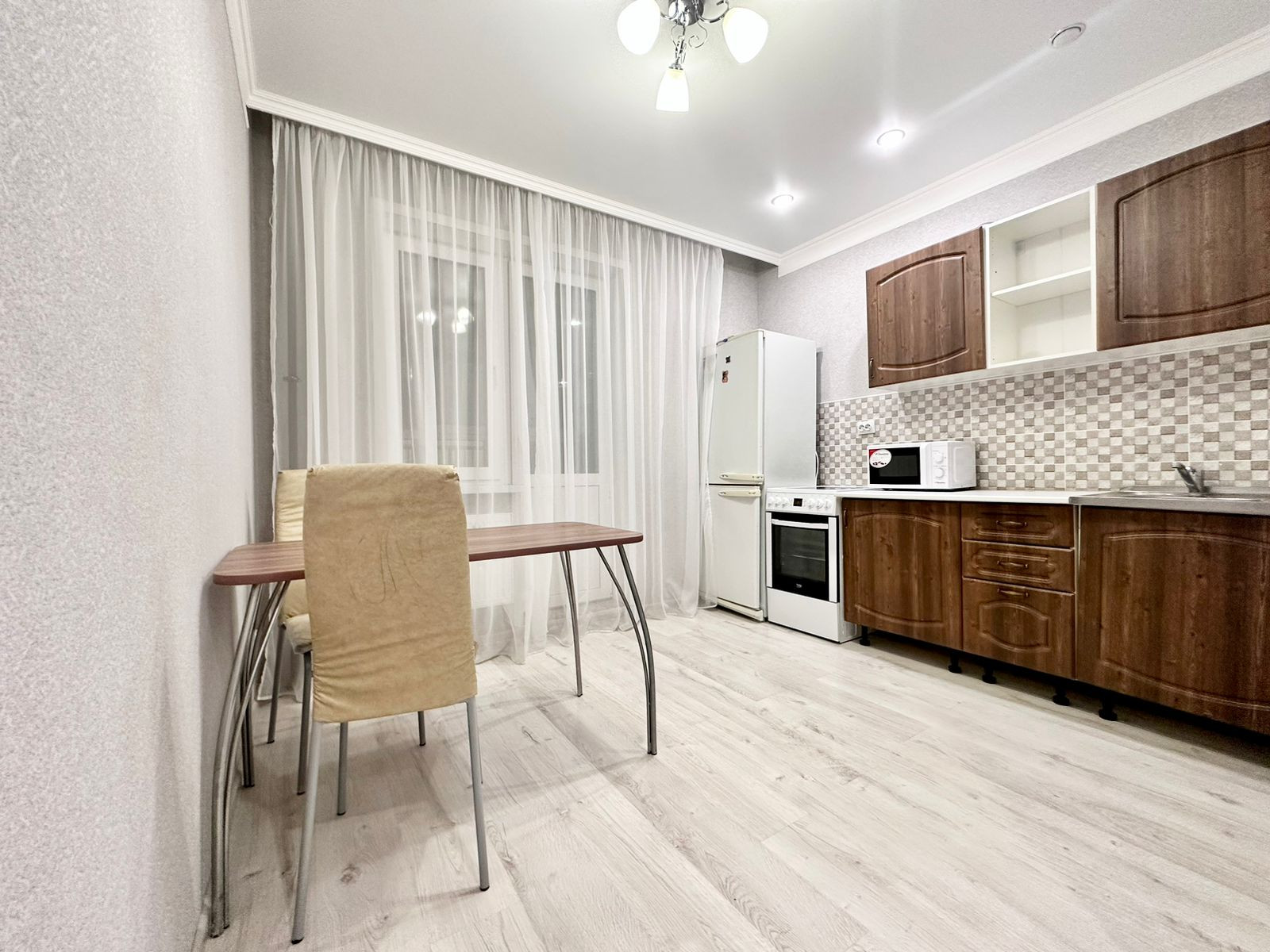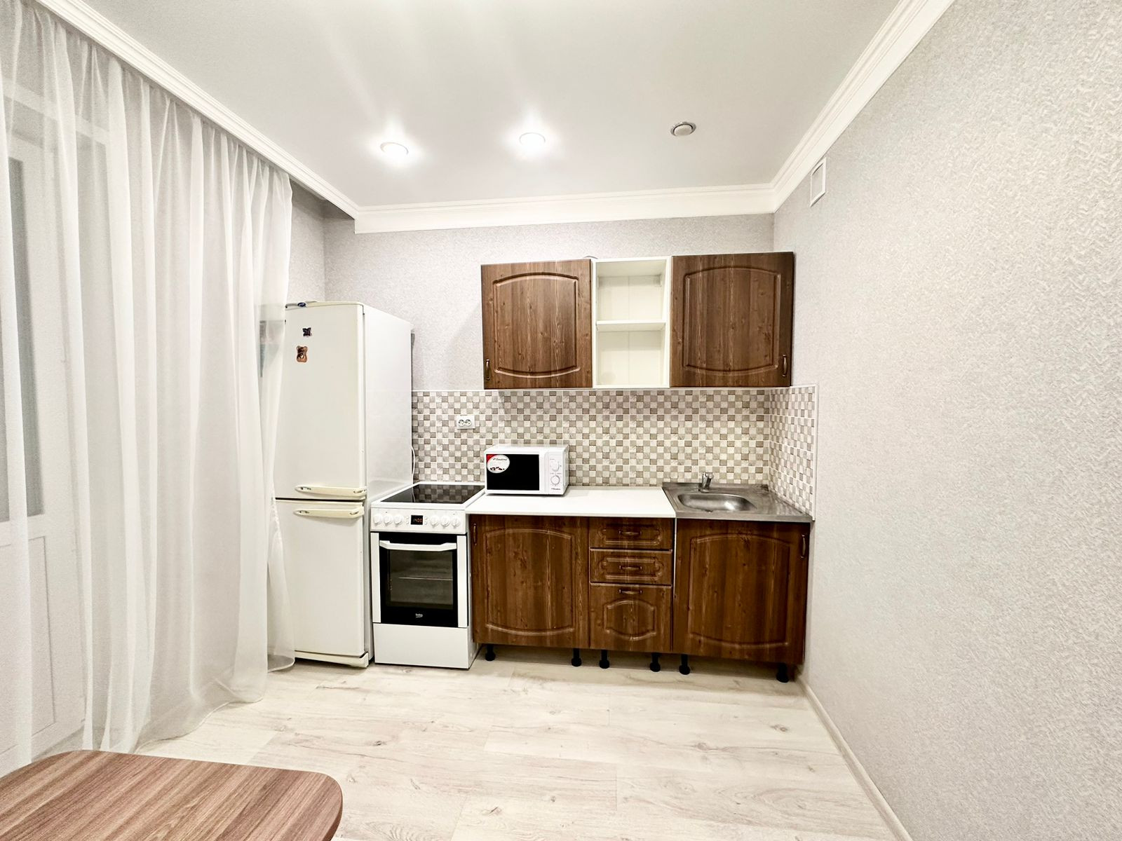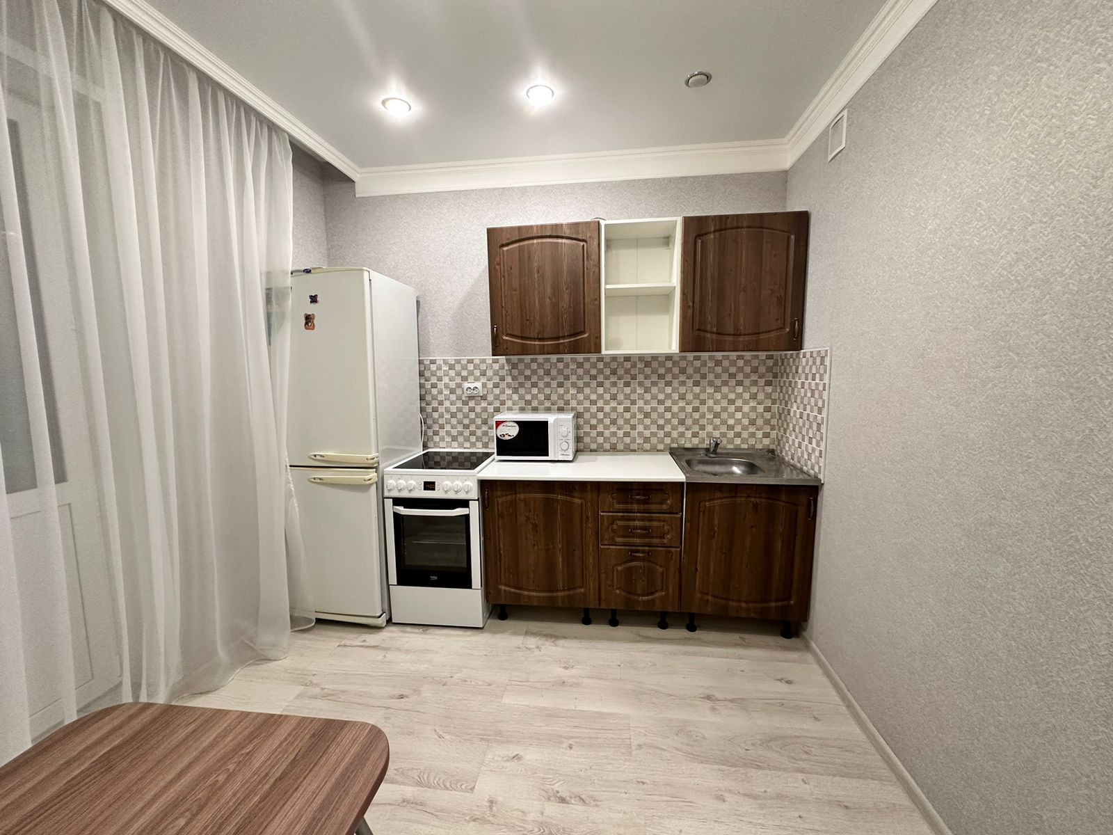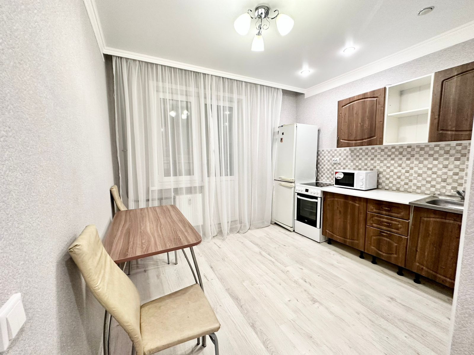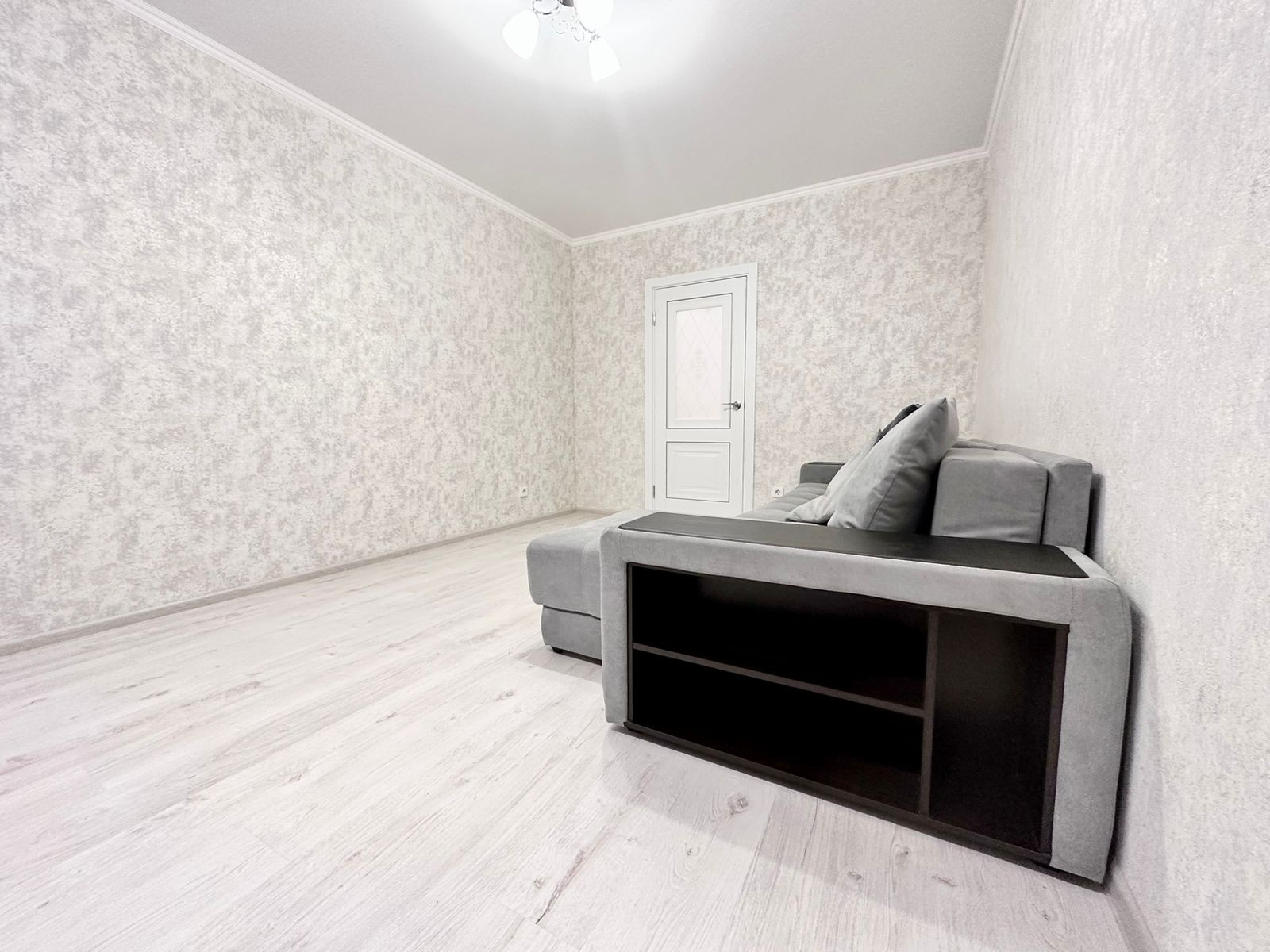 В квартире остаётся кухонный гарнитур с бытовыми приборами (холодильник, плита), шкаф и диван.