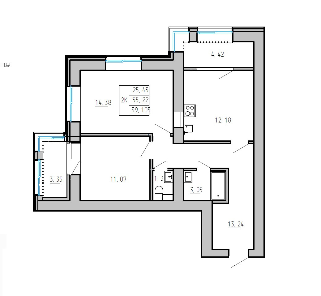 Общая площадь 57.16 м2