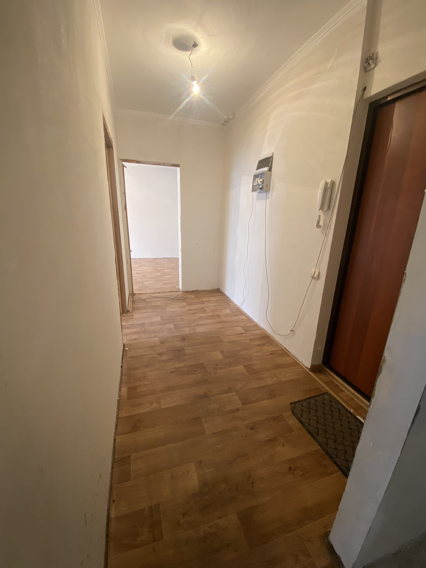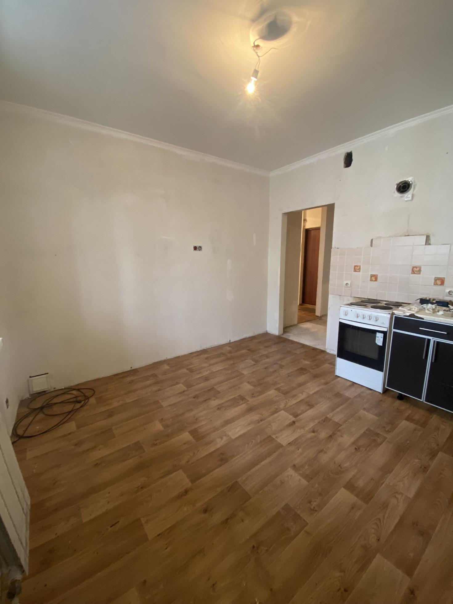 Выровнены стены и потолок.На полу линолеум .Совмещенный с/у в кафеле .