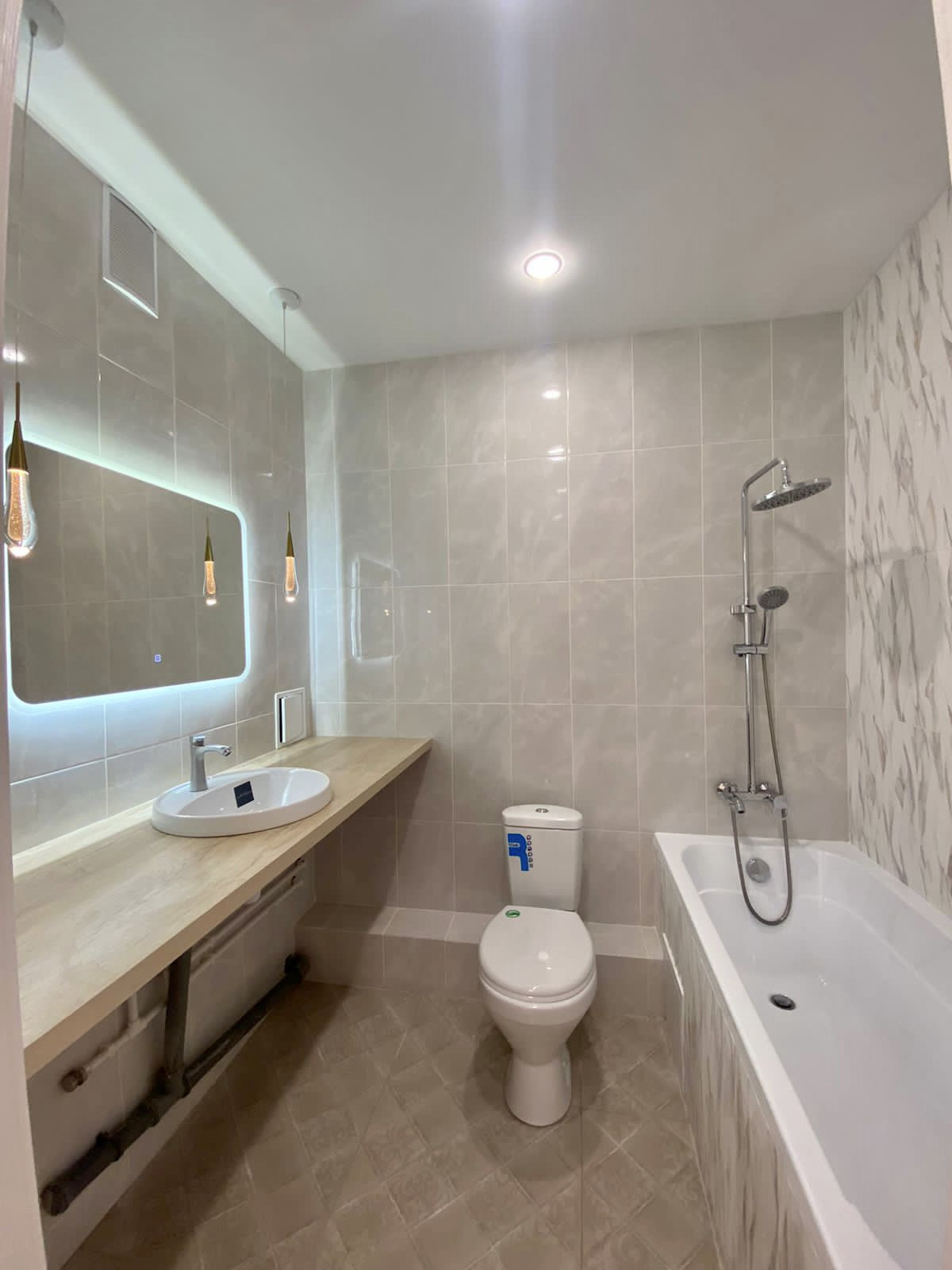 - в ванной комнате на полу керамогранит, электрический теплый пол, дорогая настенная плитка;