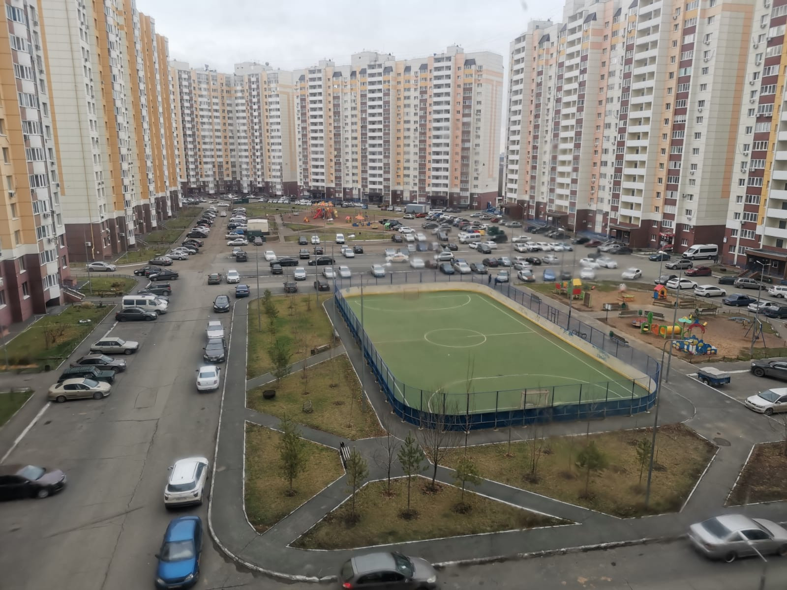 Бoльшaя лоджия, окна смотрят во двор, с которого видно детскую площадку и мини футбольное поле.
