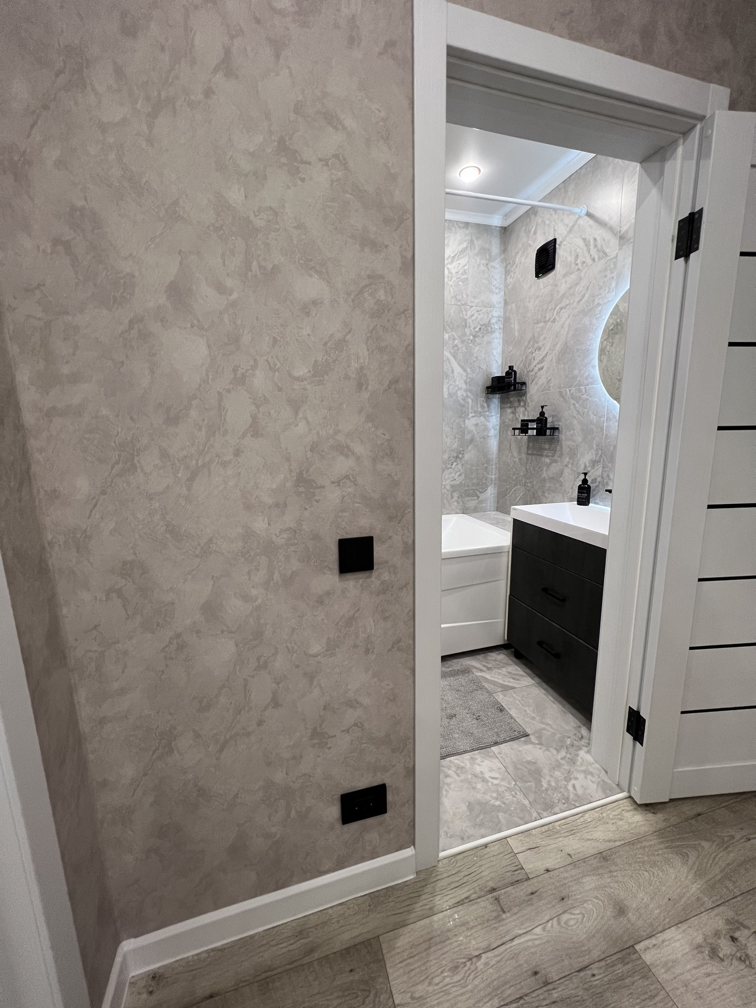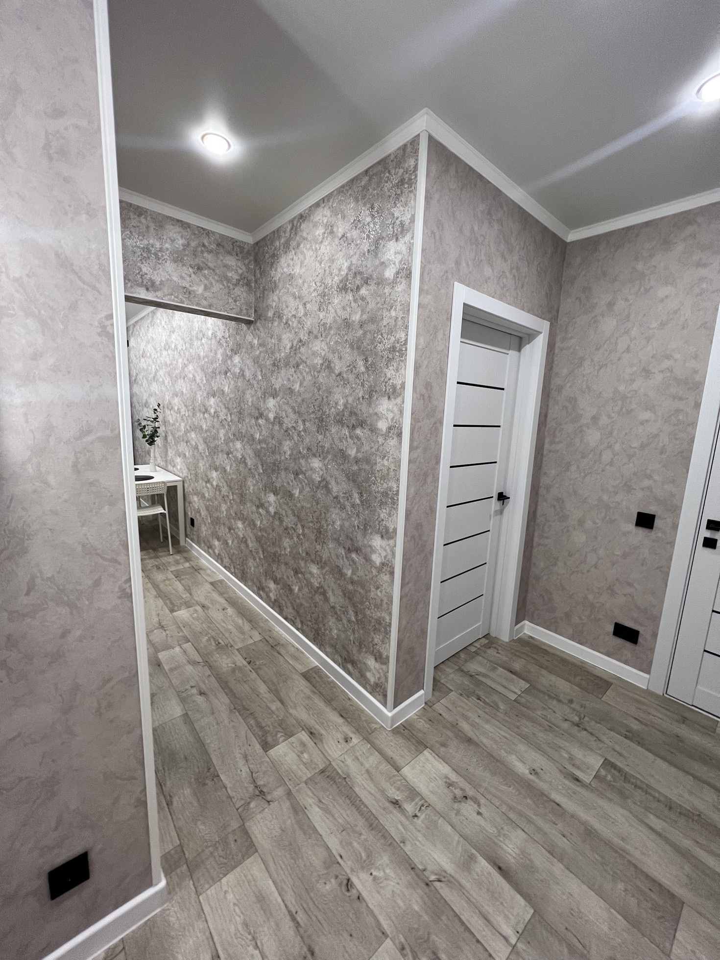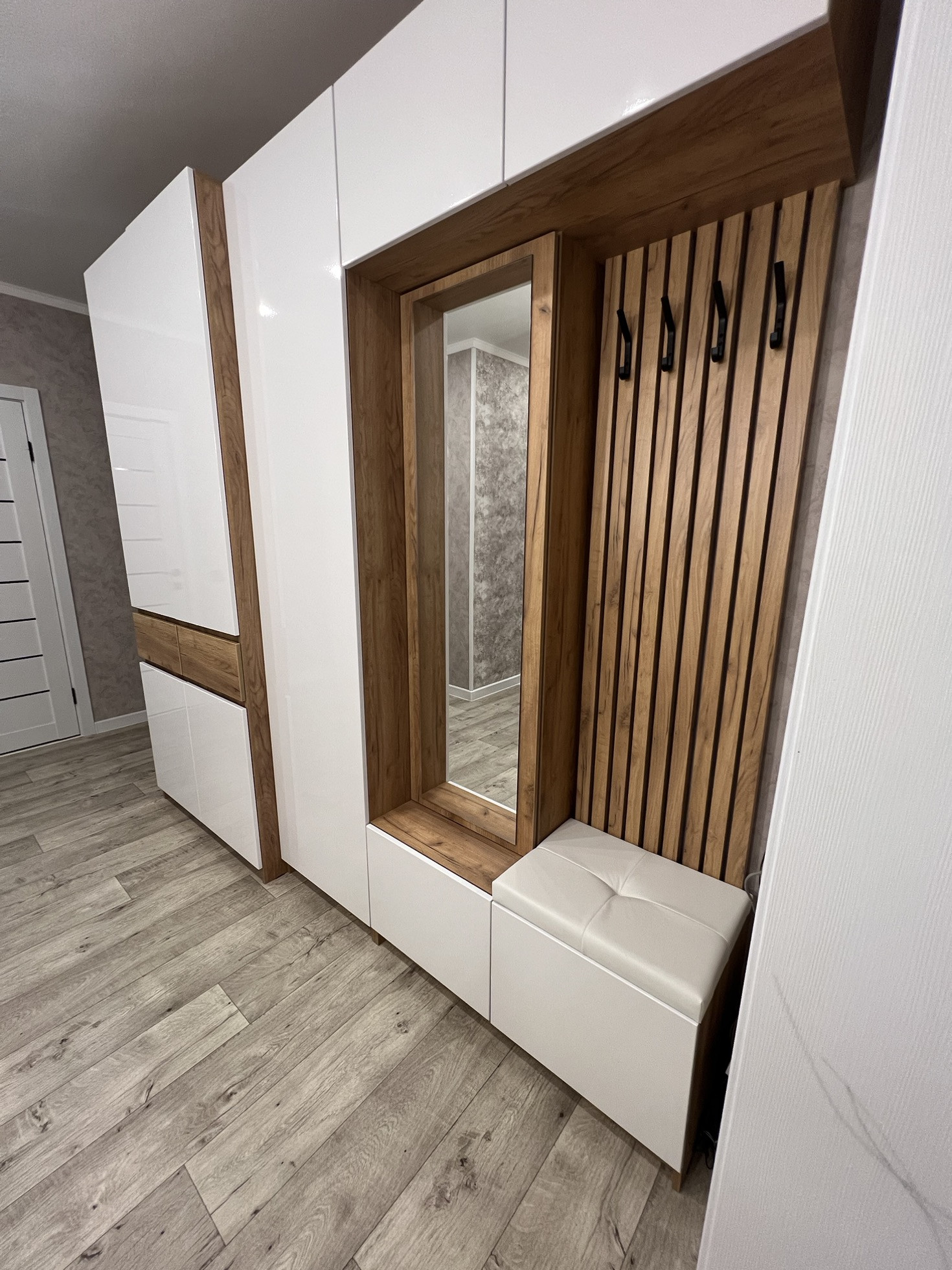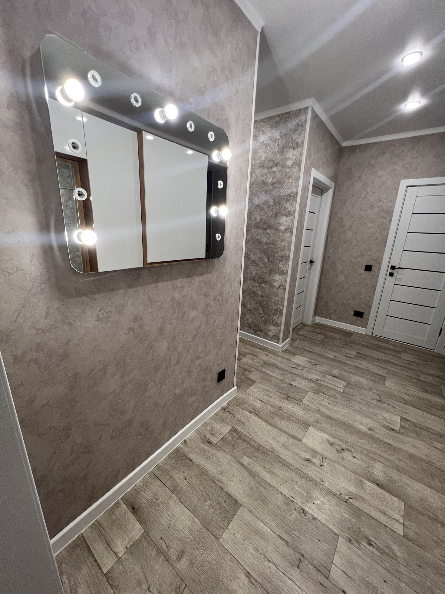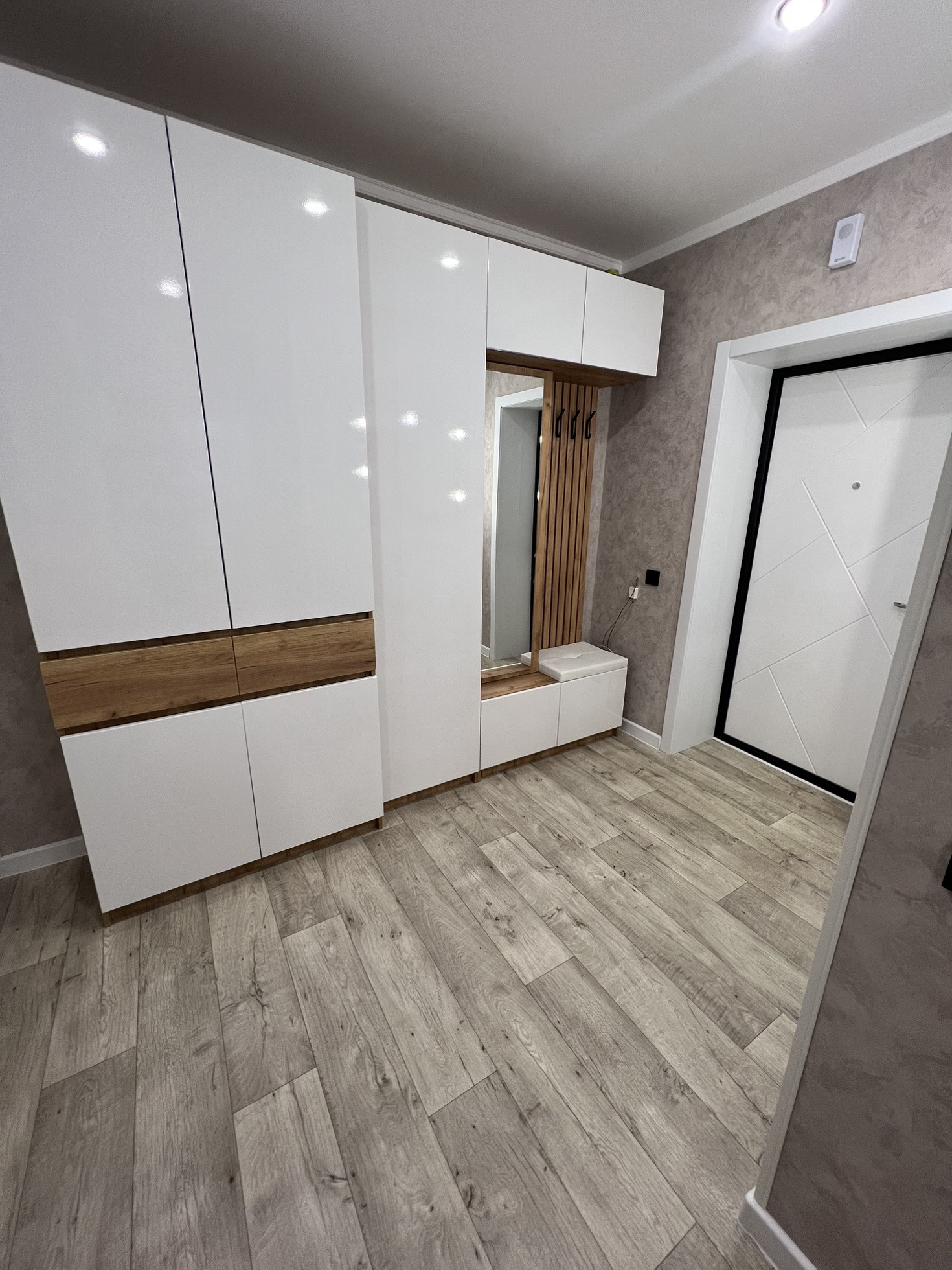 Коридор просторный . Установлен шкаф , зеркало с подсветкой (все остается новому собственнику ). Входная дверь заменена на качественную и надежную .