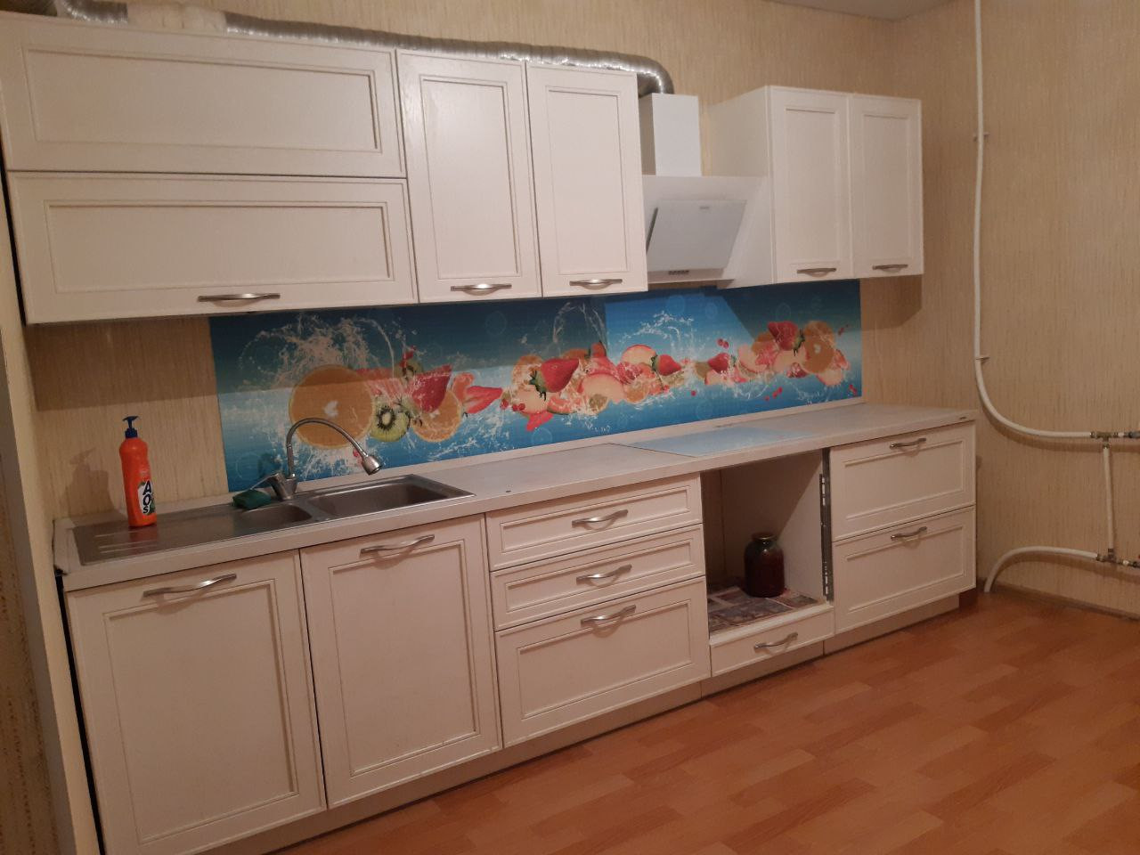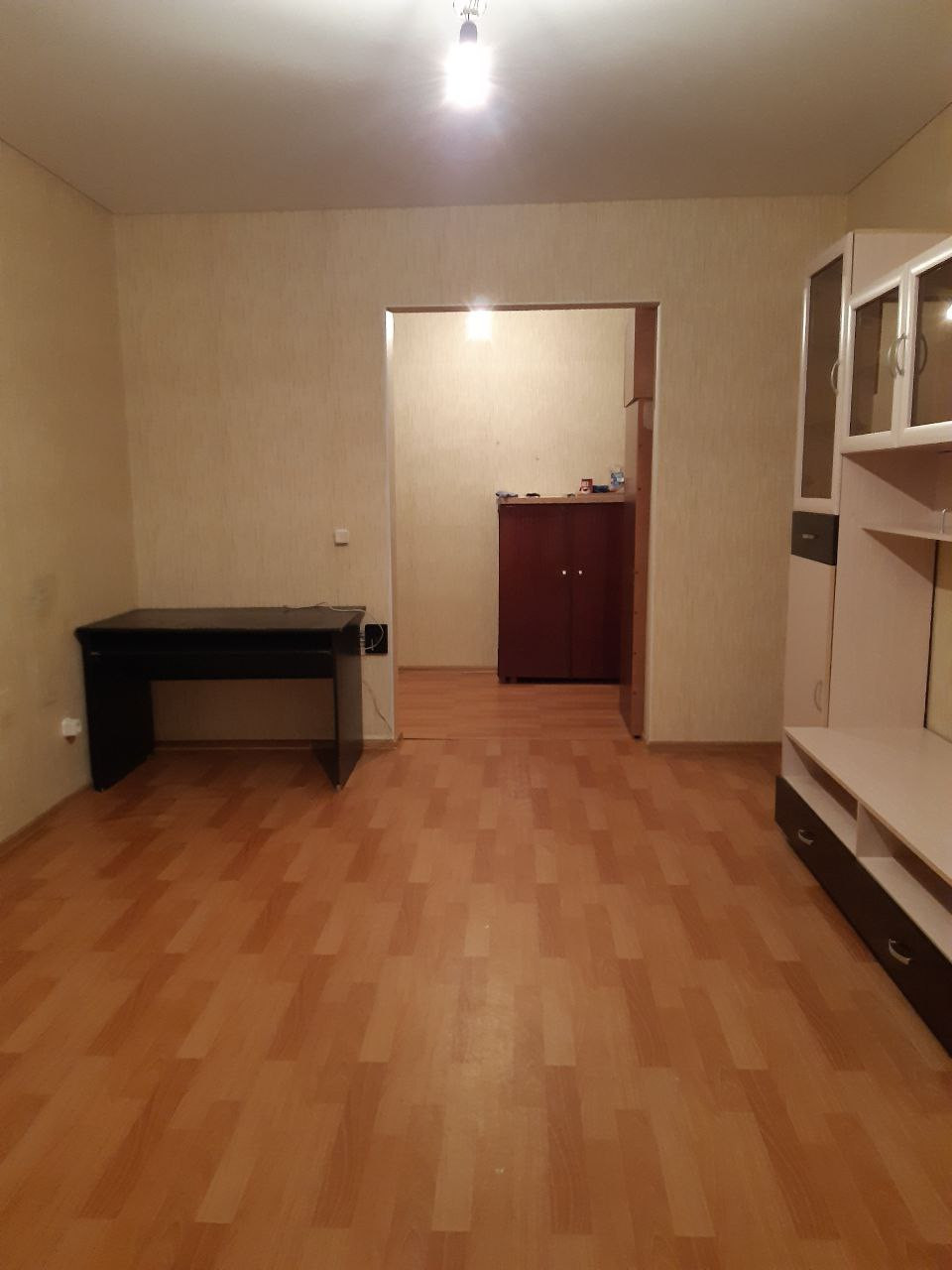 Остаётся кухонный гарнитур, вытяжка, электро-плита. В спальне остается вместительный шкаф-купе, в тон дверей. В гостиной остается шкаф с нишей под телевизор и стол.