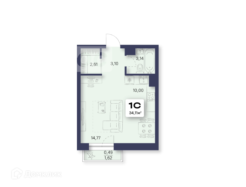 Общая площадь 34.1 м2