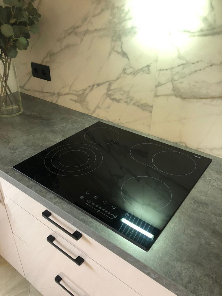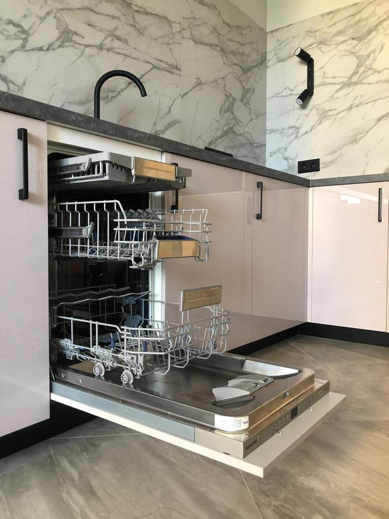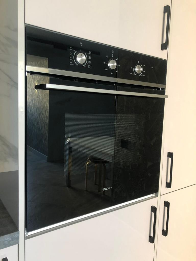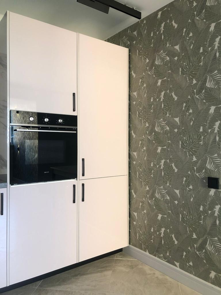 Кухня оборудованна всем необходимым: стильный вместительный кухонный гарнитур с грамотной эргономичной организацией пространства и наполнением качественной бытовой техникой: встраиваемый двухкамерный холодильник, духовой шкаф, индукционная варочная поверхность, вытяжка и посудомоечная машина.